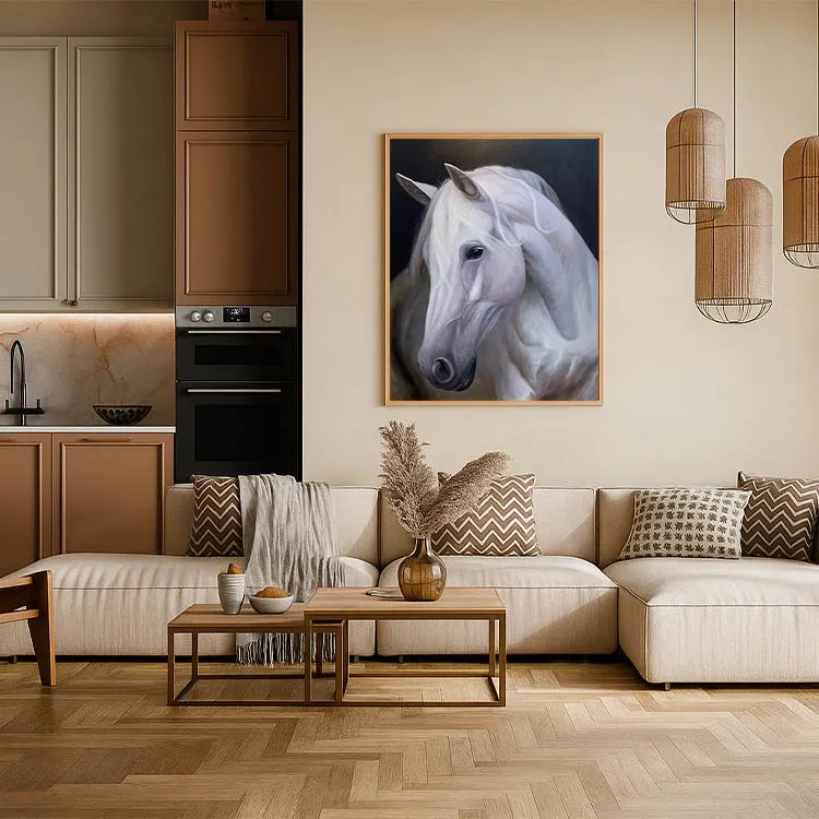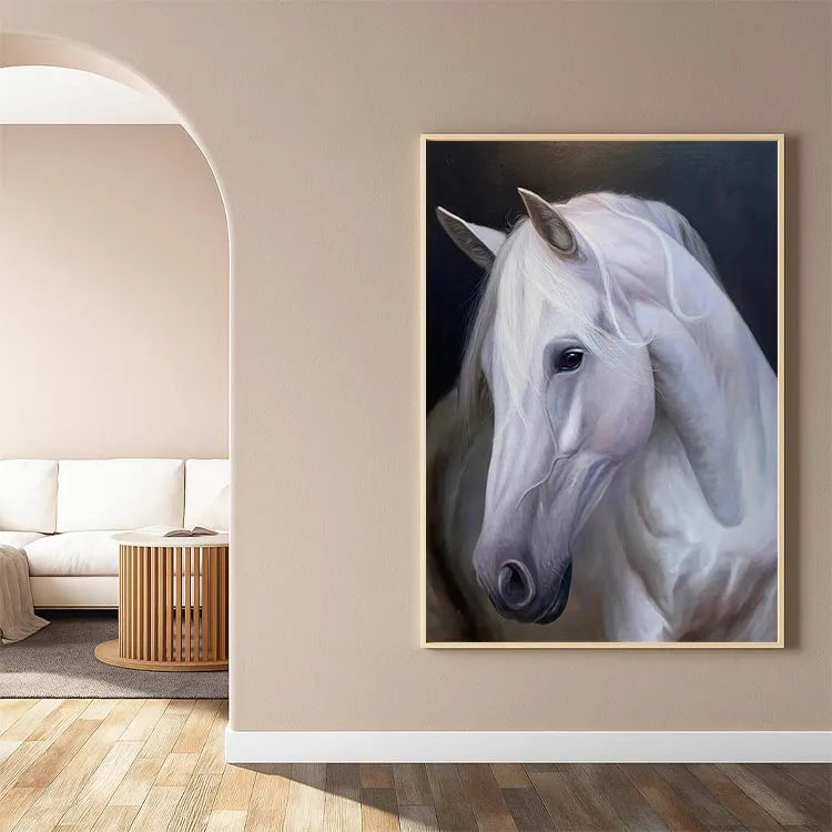 This oil painting of a white horse showcases a realistic yet slightly idealized style, with a focus on the horse's serene and contemplative expression. The artist employs smooth, delicate brushstrokes to render the horse's silky coat, with subtle variations in white and pale lavender hues that add depth and texture. The soft lighting from the top left highlights the horse's gentle features and the delicate, wispy mane, creating a gentle contrast with the darker background. The horse's dark, expressive eyes draw the viewer's attention, symbolizing intelligence and grace. This work aligns with the realism movement, with its attention to detail and lifelike representation.