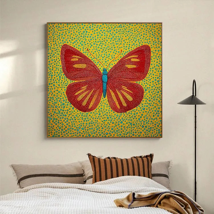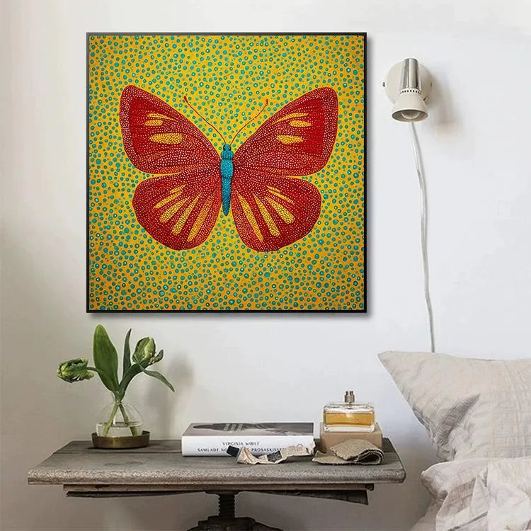 This painting features a vividly colored butterfly against a yellow, blue polka-dotted background, reminiscent of Pop Art. The butterfly's red wings, adorned with yellow and white dotted patterns, create a striking contrast with its bright blue body. The use of dots adds texture and a playful, almost whimsical quality, while the bold color choices evoke a sense of vibrancy and joy. The symmetrical composition centers the butterfly, emphasizing its delicate, yet intricate design. The painting's style, with its flat color fields and repetitive patterns, aligns with Pop Art's playful and provocative approach, while its detailed dotwork nods to Pointillism's technique.