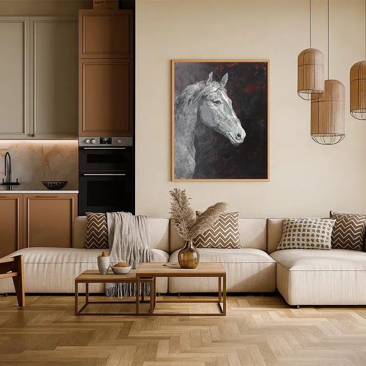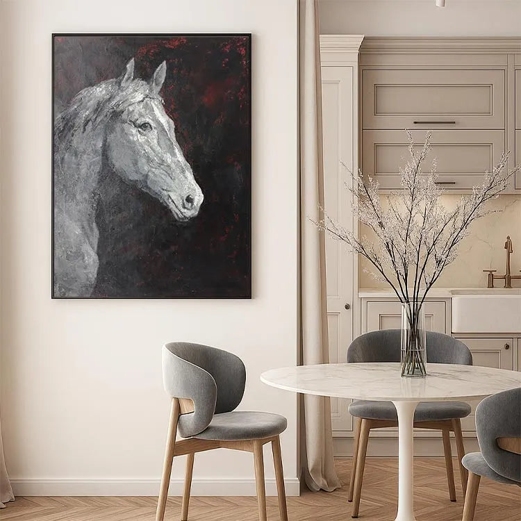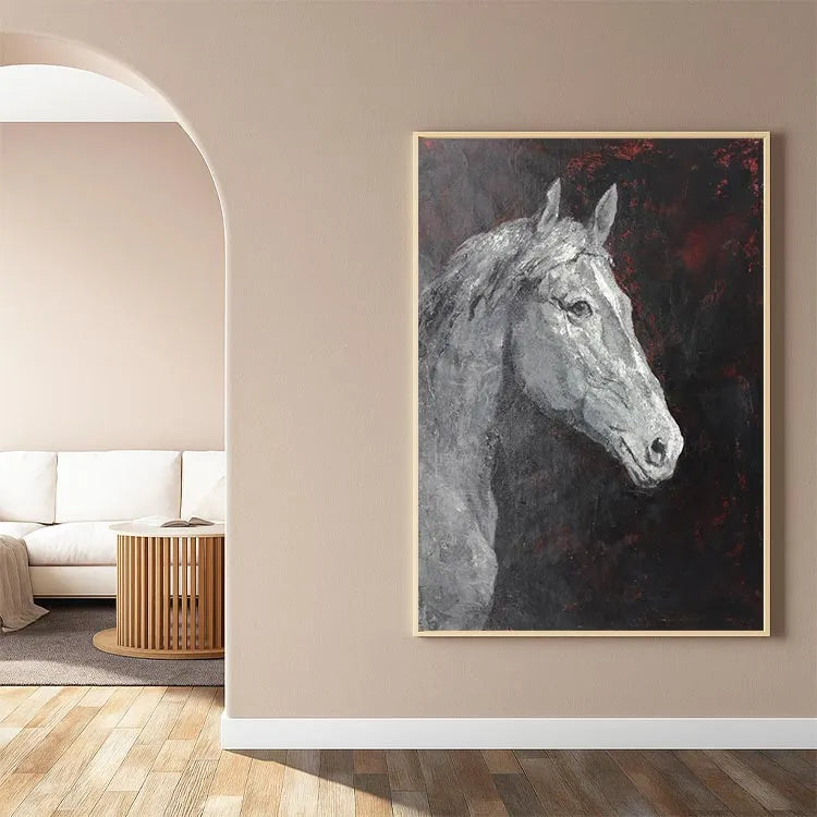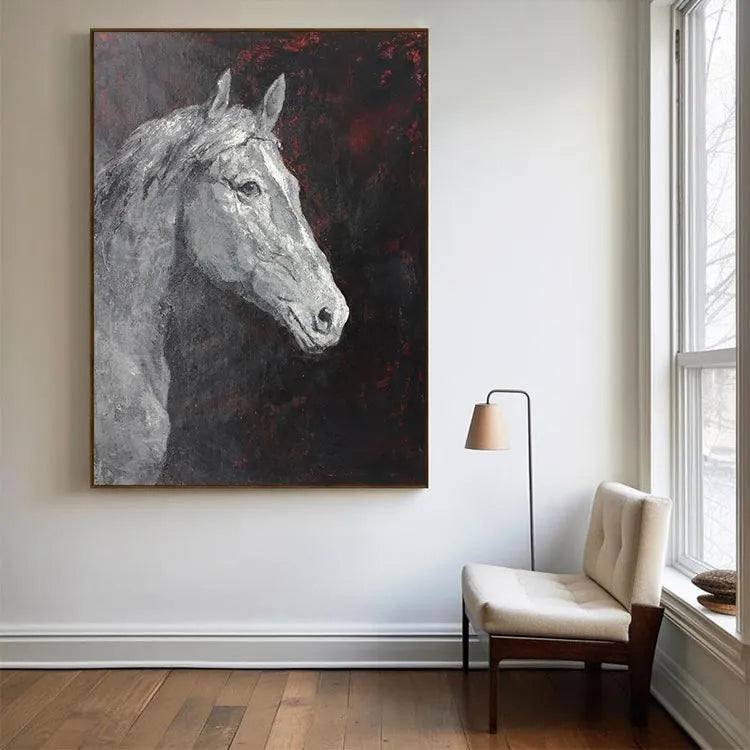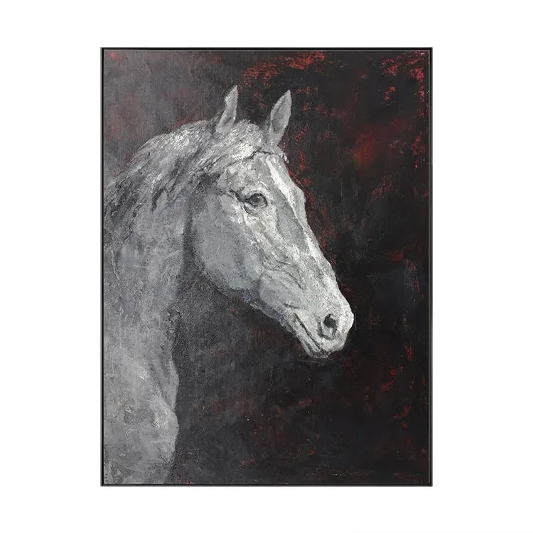 This oil painting depicts the head of a white horse, rendered in a realistic yet somewhat abstract style. The artist employs a limited color palette dominated by shades of black, white, and red, creating a stark contrast that draws attention to the horse's form. The textured brushstrokes add a rough, almost tactile quality to the horse's fur, while the smooth, almost ghostly white of its coat contrasts with the dark, almost chaotic background. The red accents in the background suggest an underlying tension or emotion, adding depth to the otherwise solemn composition. The use of light and shadow is subtle, yet effective, highlighting the horse's eyes and muzzle. This work could be associated with the Romantic movement, given its emphasis on emotion and the sublime.