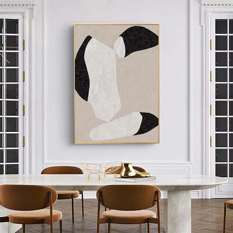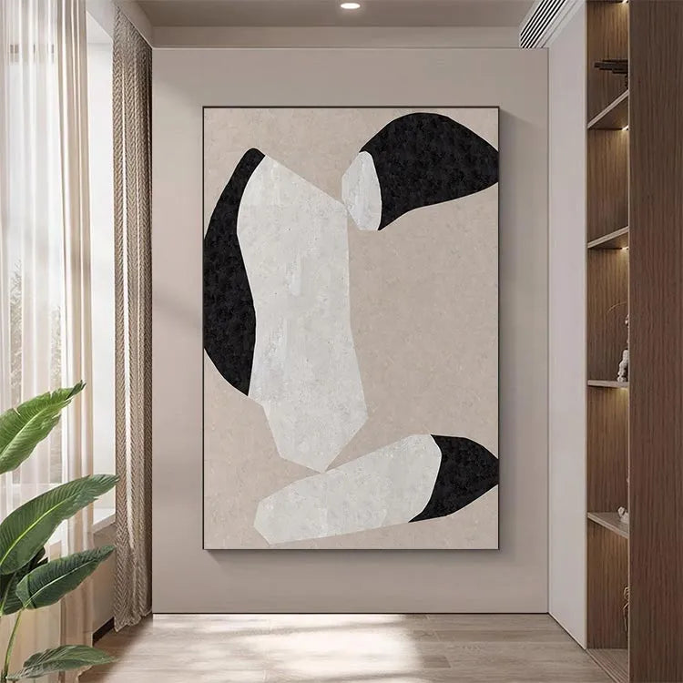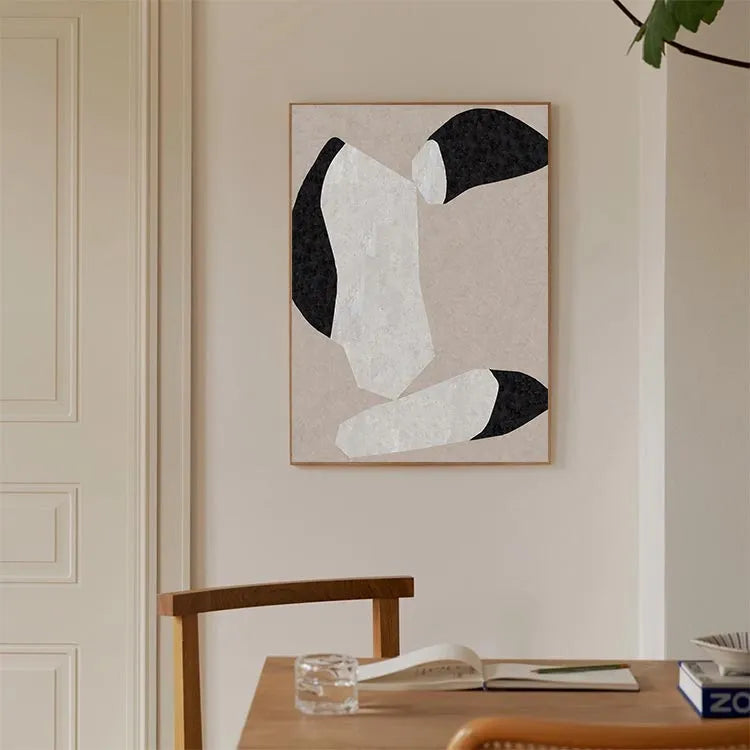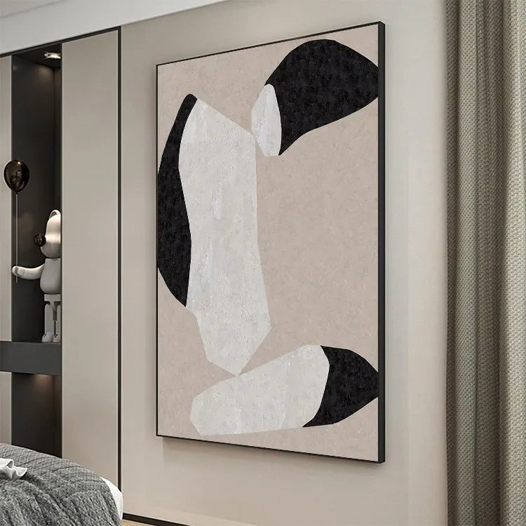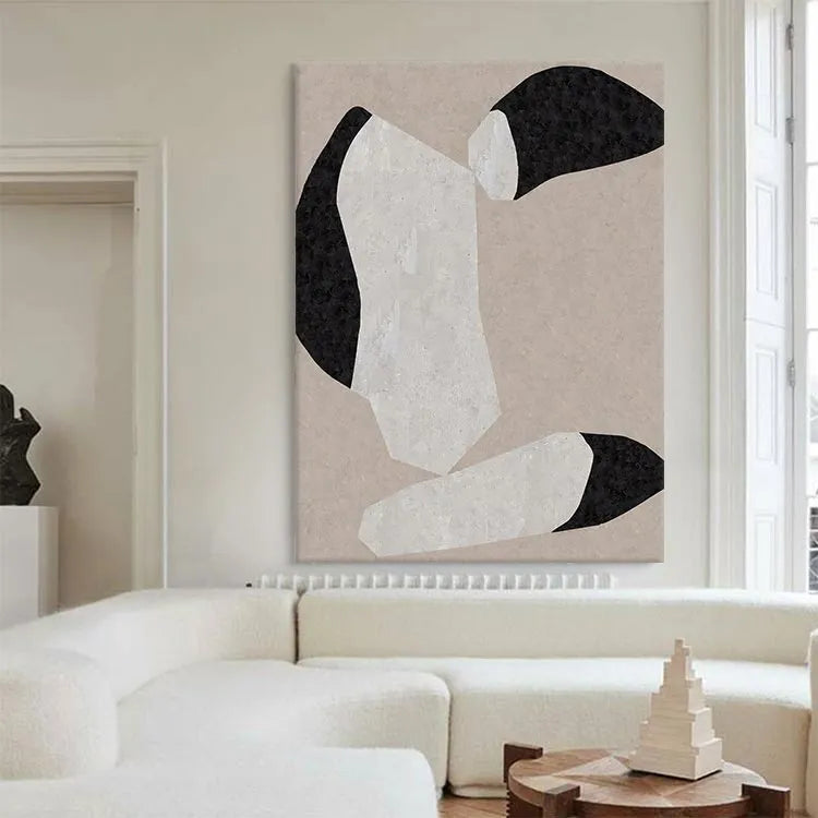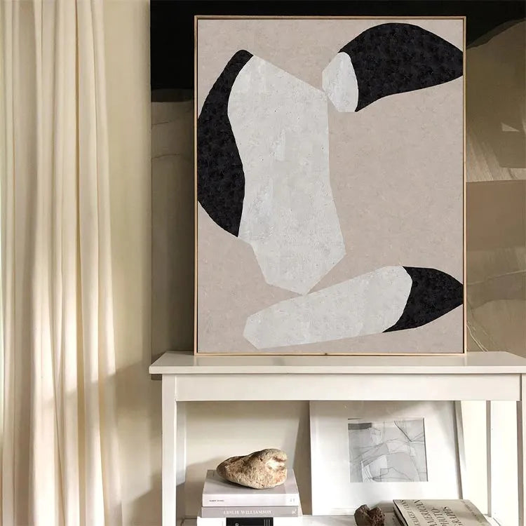 This abstract painting employs a minimalist approach, characterized by its use of geometric shapes and a limited color palette. The composition features irregular, black and white shapes set against a textured, beige background, creating a stark contrast that draws the viewer's eye. The textures within the shapes suggest a rough, almost tactile quality, reminiscent of paper or fabric. The artist's choice of black and white evokes a sense of simplicity and clarity, while the beige background adds a subtle warmth and depth. The abstract forms may symbolize the interplay between presence and absence, or the balance between light and dark. The piece aligns with the principles of the Bauhaus movement, emphasizing functional beauty and the interplay between form and color. The overall effect is both serene and thought-provoking, inviting contemplation of the inherent beauty in simplicity.