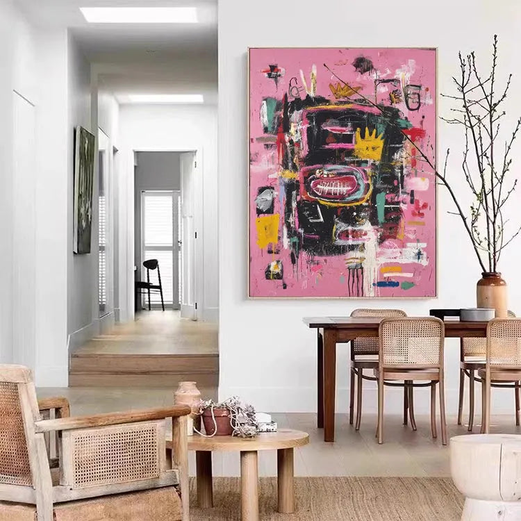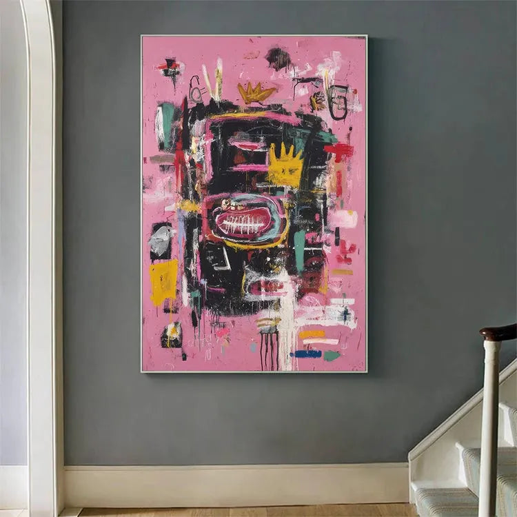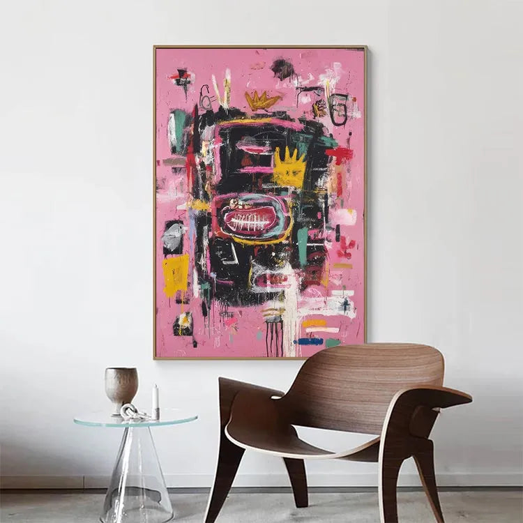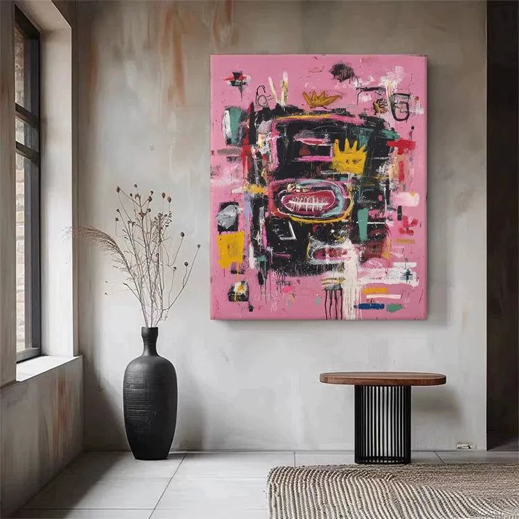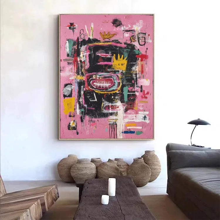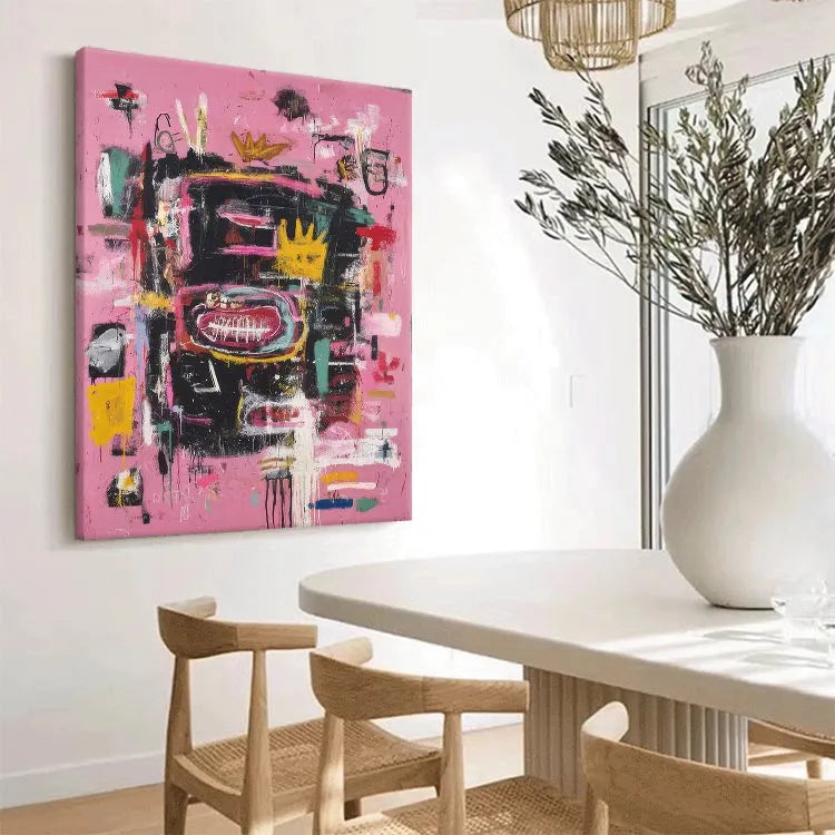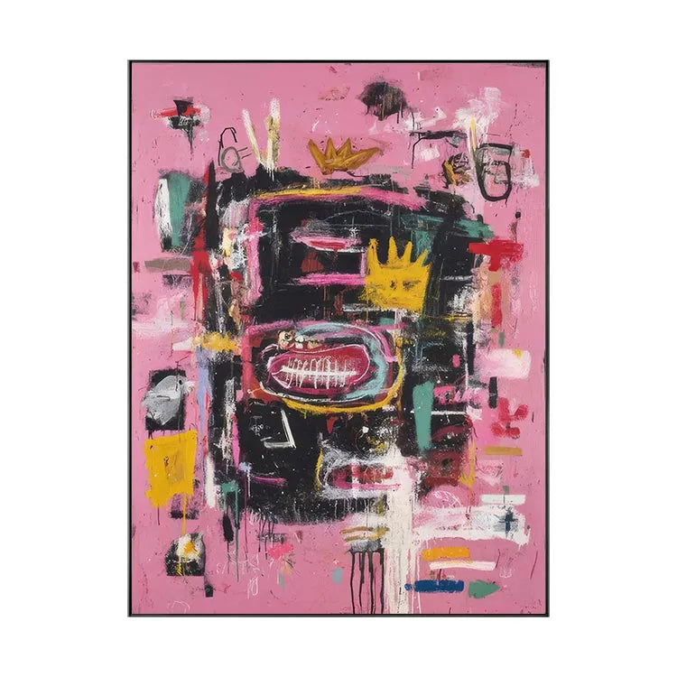 This abstract painting employs a vibrant, chaotic composition with a pink background that sets off a dense array of black, yellow, red, and white brushstrokes. The use of color is bold and dynamic, creating a sense of movement and energy. The central yellow crown-like shape, surrounded by a large red oval with white lines, suggests a focal point of symbolism, possibly representing royalty or a significant event. Textural elements, such as thick, expressive brushstrokes and visible paint drips, add a tactile dimension to the piece. The juxtaposition of chaotic forms and vivid colors aligns it with the Abstract Expressionist movement, emphasizing emotional and spontaneous creation. The overall effect is energetic and thought-provoking.