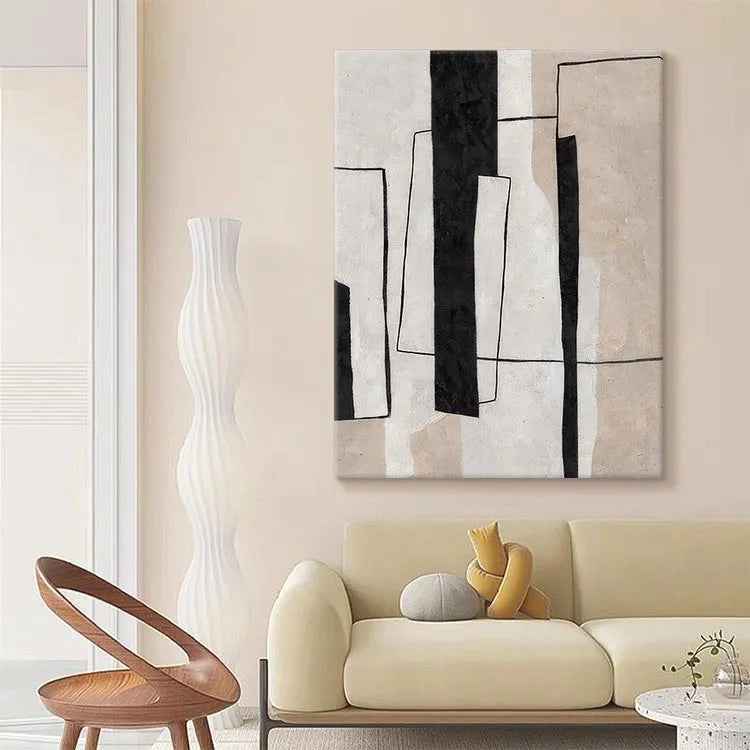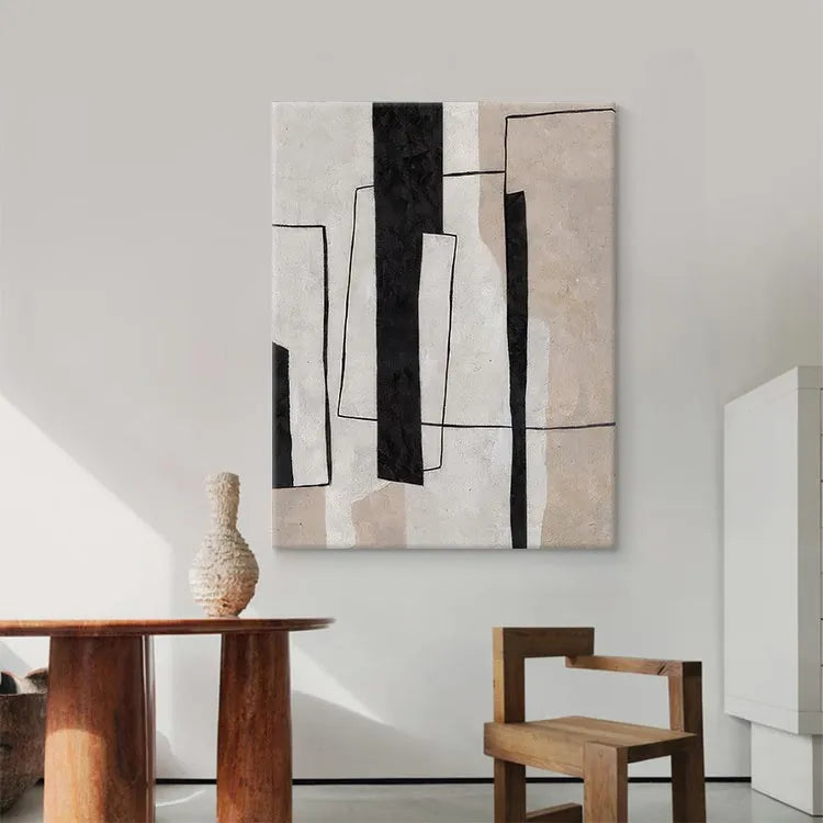 This oil painting exemplifies the abstract style, with its geometric forms and minimalist approach. The composition features overlapping black and beige rectangular shapes, creating a sense of depth and layering. The thick, black, vertical and horizontal lines contrast starkly against the softer beige background, evoking a modernist aesthetic reminiscent of Piet Mondrian's work. The texture of the paint appears rough, with visible brushstrokes adding a tactile quality to the piece. The use of color is restrained yet effective, with the black forms symbolizing structure and order, while the beige background suggests a more fluid, organic environment. The overall effect is one of balance and simplicity, characteristic of the De Stijl movement.