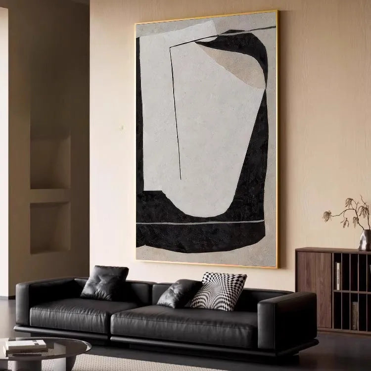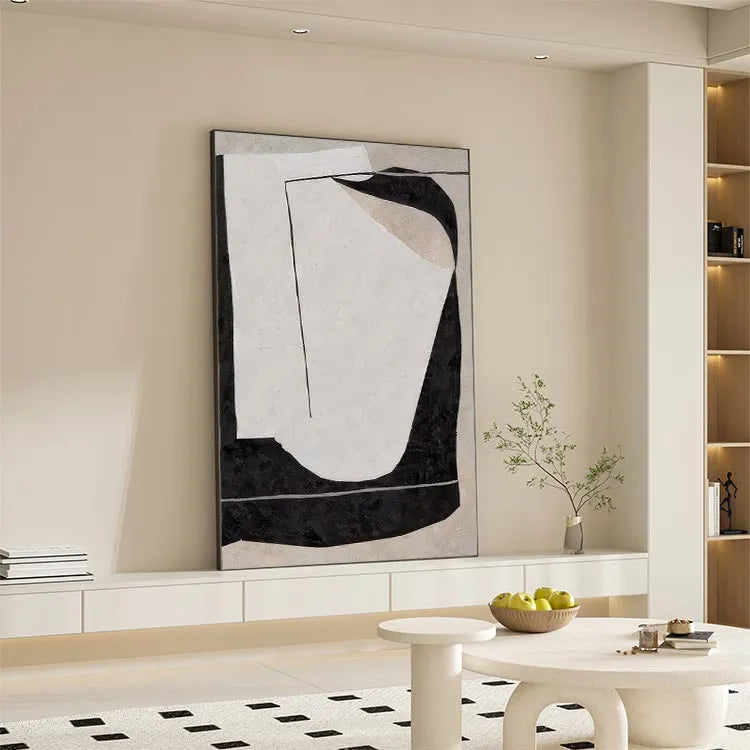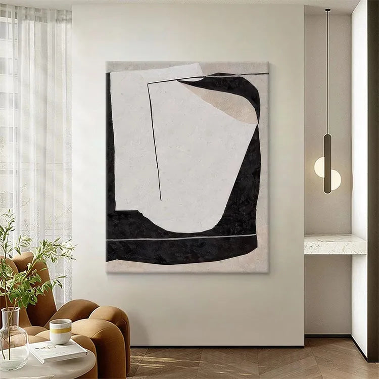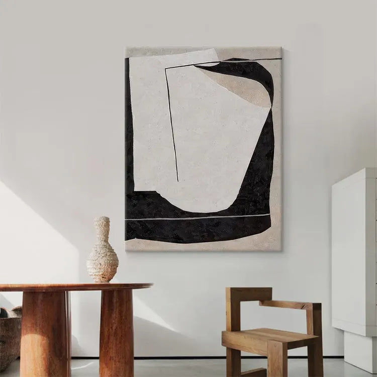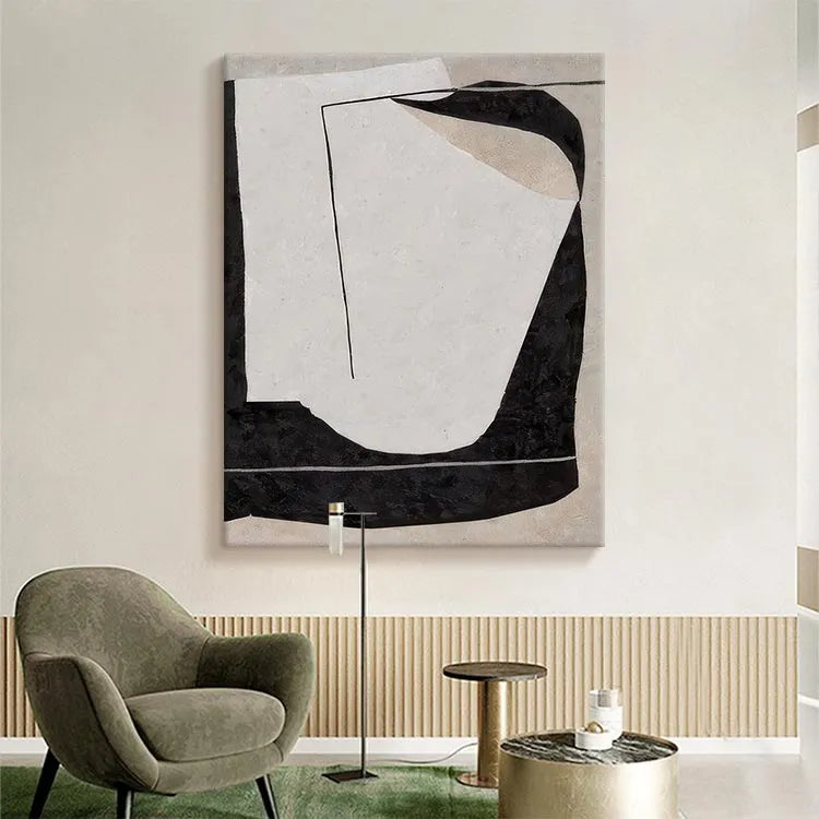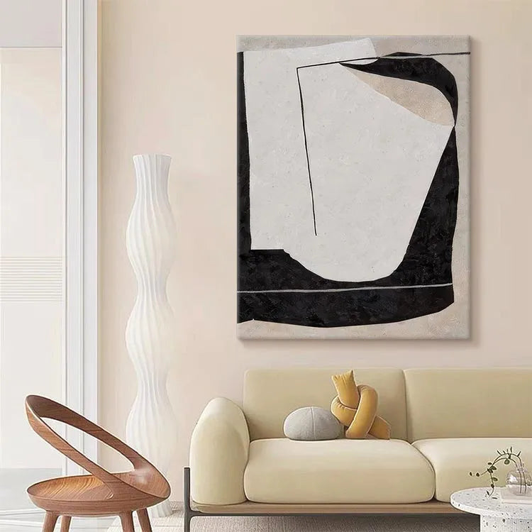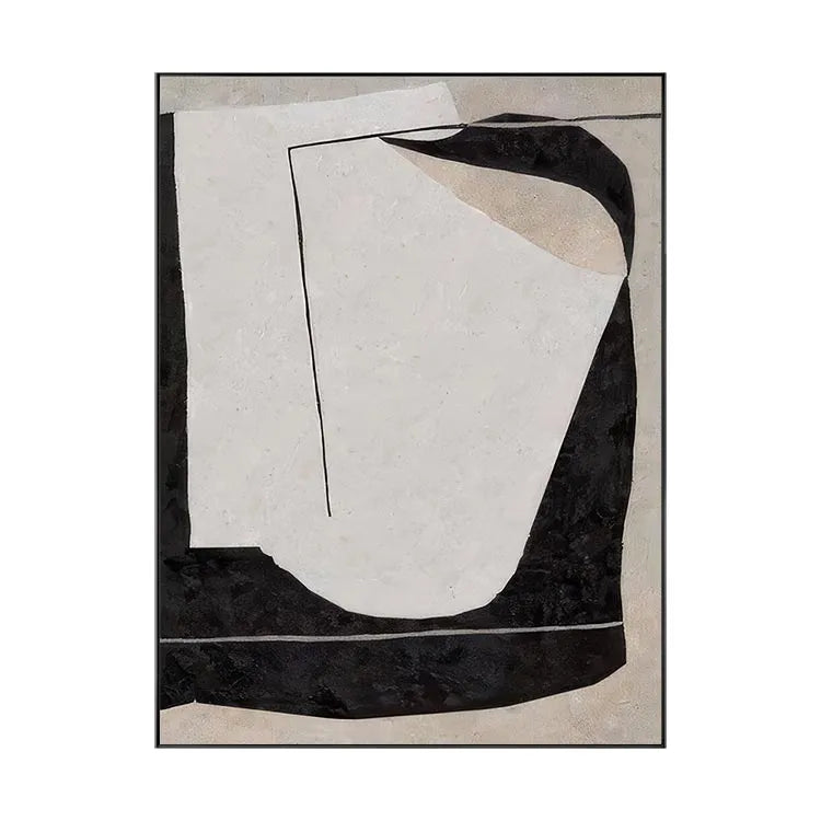 This oil painting features a minimalist composition with a stark contrast between black and white, suggestive of the Bauhaus movement. The abstract form, with its smooth, curved lines and sharp, linear divisions, creates a sense of geometric balance. The texture of the black areas appears slightly velvety, while the white sections have a smoother, almost paper-like quality. The use of color is restrained, emphasizing the interplay between the two hues. The subtle gradient in the white area adds a touch of depth, while the black lines provide a crisp, defined boundary. The overall simplicity and focus on form and color suggest a modernist approach, emphasizing purity and functionality in art.