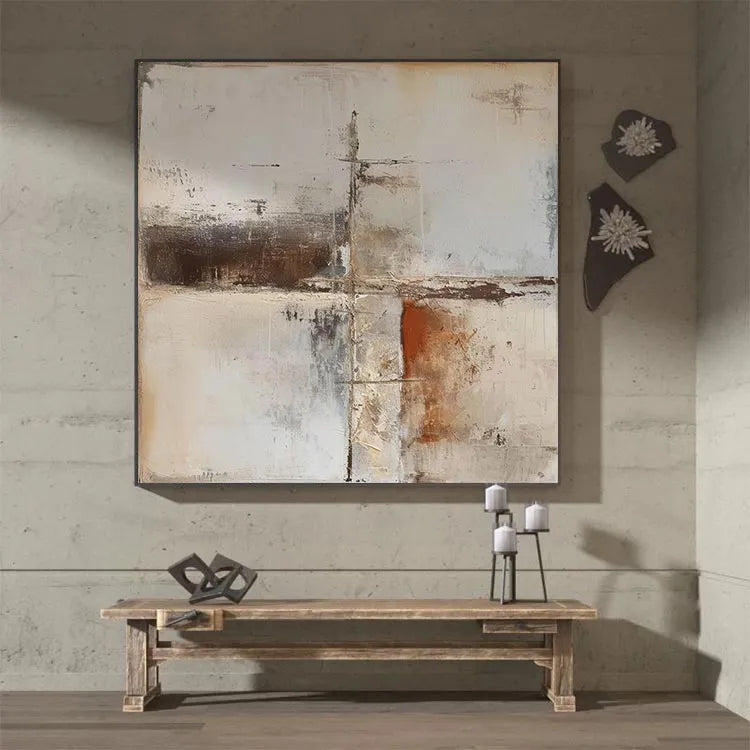 This abstract painting employs a restrained, minimalist composition, characterized by its muted color palette of whites, grays, browns, and subtle oranges. The textured, layered brushstrokes create a sense of depth and history, with the rough, almost concrete-like textures juxtaposed against smoother, more diffuse areas. The horizontal and vertical lines, though faint, guide the viewer's eye across the canvas, suggesting structural elements or divisions. The use of color is subtle yet effective, with the dark brown and orange accents providing focal points amidst the otherwise neutral background. This work aligns with the Abstract Expressionism movement, emphasizing emotional and gestural qualities over representational accuracy. The overall effect is one of quiet introspection and subtle complexity.
