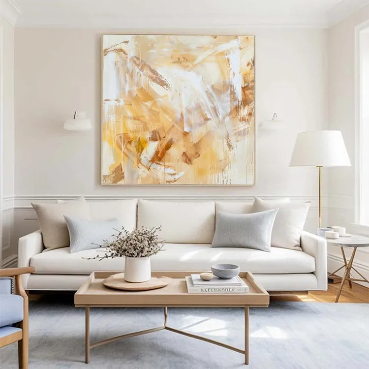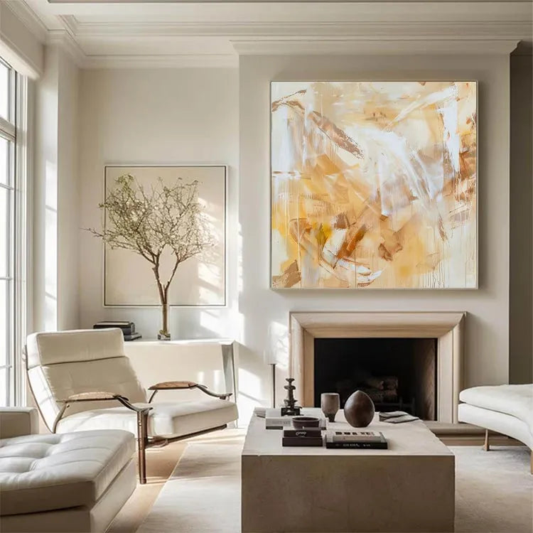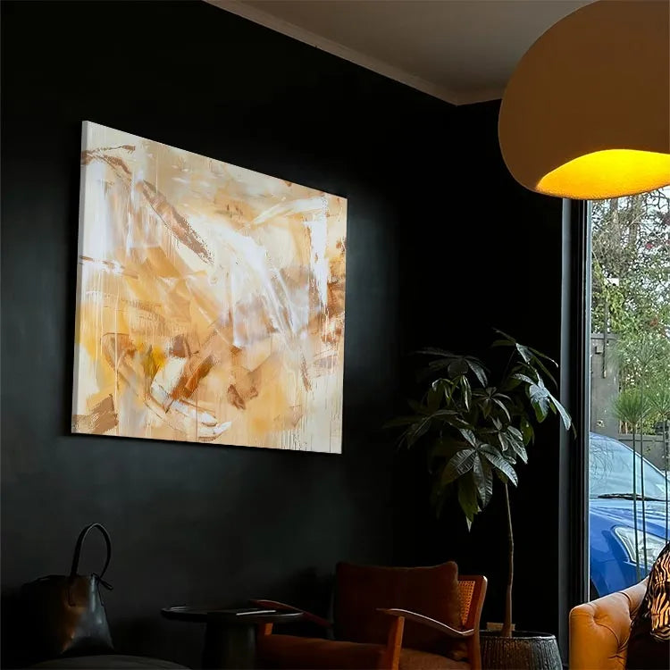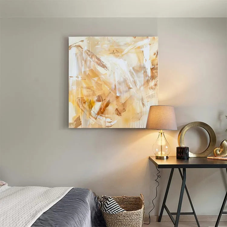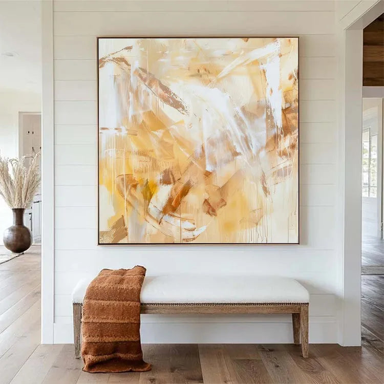 This abstract painting employs a restrained palette of warm yellows, browns, and whites, creating a harmonious yet dynamic composition. The textured brushstrokes and layered applications of paint suggest a contemporary abstract style, reminiscent of the Abstract Expressionism movement. The use of transparent, almost translucent layers allows light to penetrate, creating a sense of depth and movement. The interplay of light and dark areas, along with the vertical and diagonal brushstrokes, generates a rhythmic pattern that guides the viewer's eye across the canvas. The subtle gradations and the intermingling of colors evoke a sense of warmth and tranquility, while the rough textures add a tactile quality to the otherwise smooth surface.