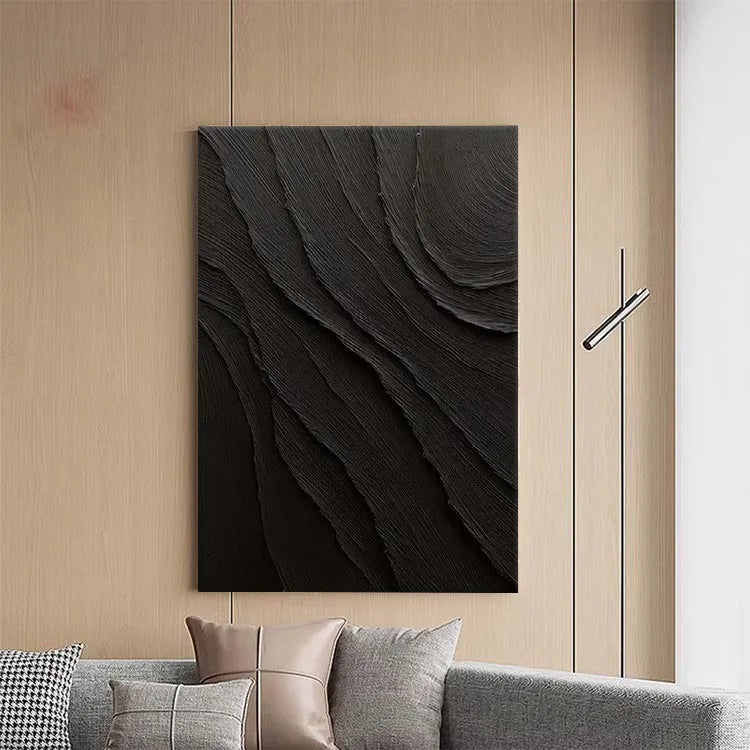 This abstract painting showcases a textured, layered composition with overlapping, undulating forms in a dark, almost monochromatic palette. The artist employs a meticulous, almost tactile brushstroke technique, creating a sense of depth and movement. The use of shadow and light enhances the three-dimensional quality, while the uniform dark color palette evokes a sense of mystery and introspection. The repetitive, wavy patterns suggest a rhythmic, almost organic process, reminiscent of natural forms such as water or foliage. This work aligns with the Abstract Expressionism movement, emphasizing texture and form over representational accuracy. The subtle variations in texture and color create a dynamic yet controlled visual experience.