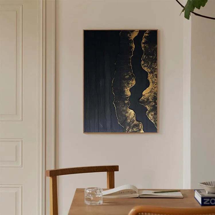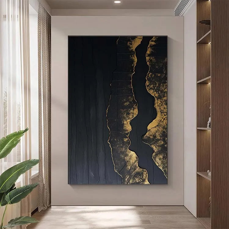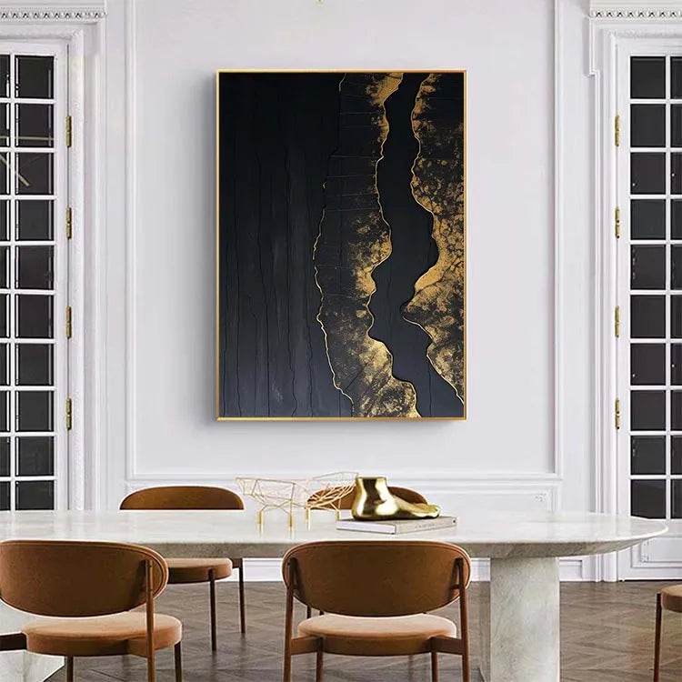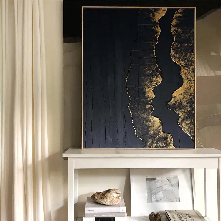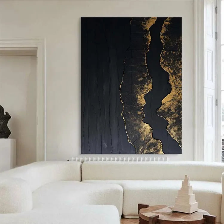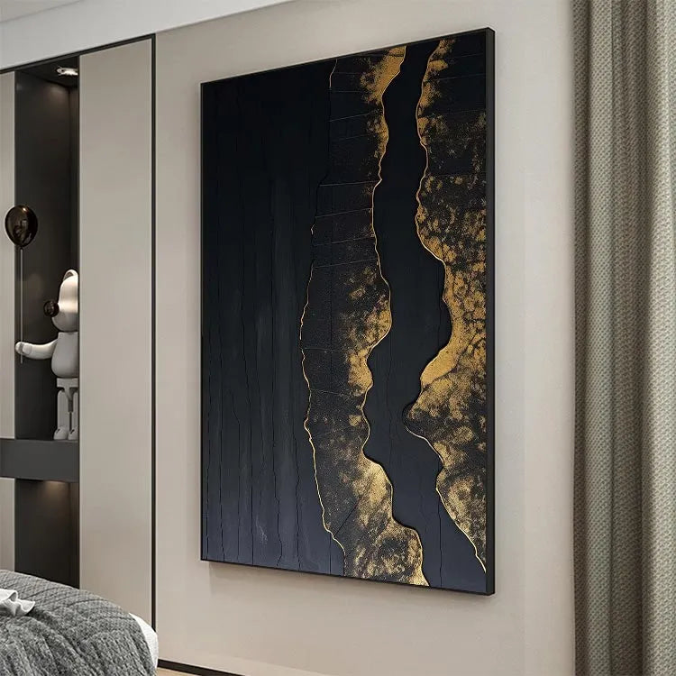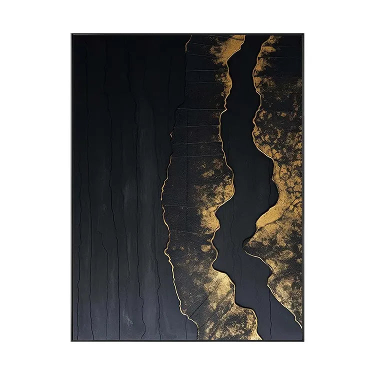 This abstract painting employs a striking contrast between deep blacks and vibrant golds, creating a visually arresting composition. The wavy, golden lines that traverse the dark background suggest fluidity and movement, reminiscent of the fluid dynamics of water or the organic forms found in nature. The texture is subtly varied, with the gold areas appearing slightly rougher and more textured against the smoother black regions. The use of light and shadow enhances the three-dimensional effect, drawing the viewer's eye along the golden paths. The interplay of color and form evokes a sense of elegance and mystery, aligning with the principles of Abstract Expressionism. The overall effect is one of sophisticated simplicity, with a focus on the interplay between light and dark, and the organic, flowing lines.