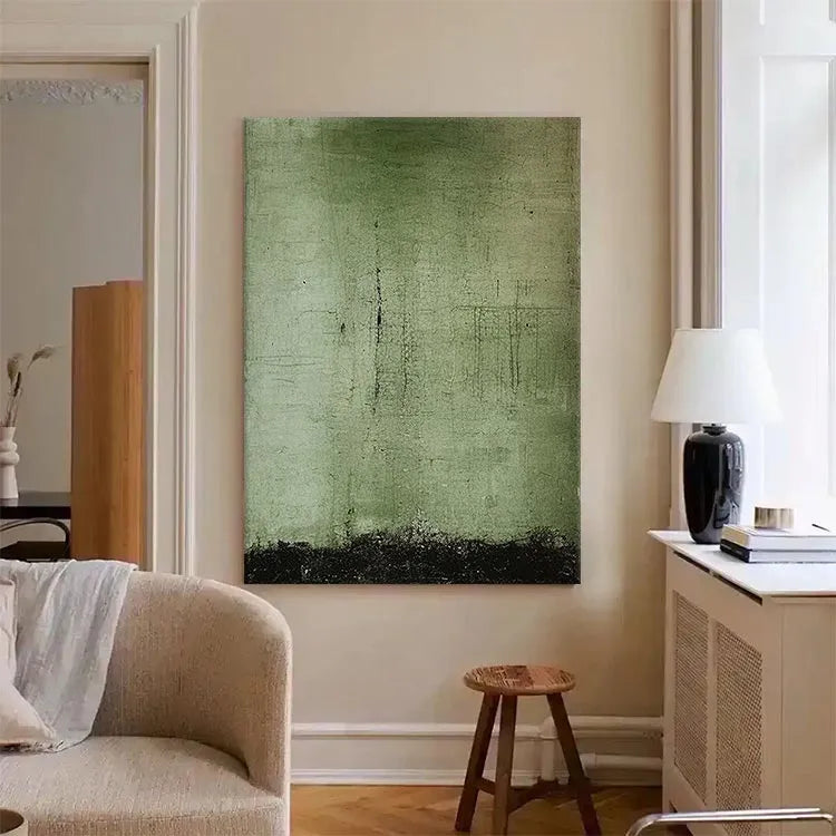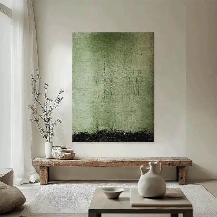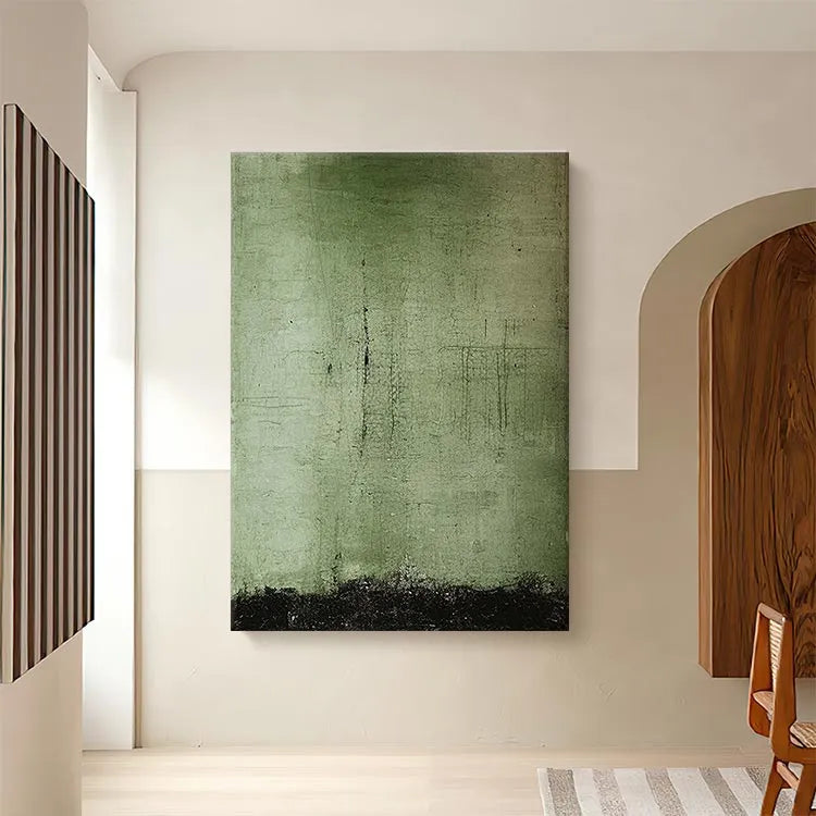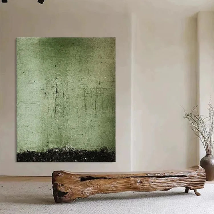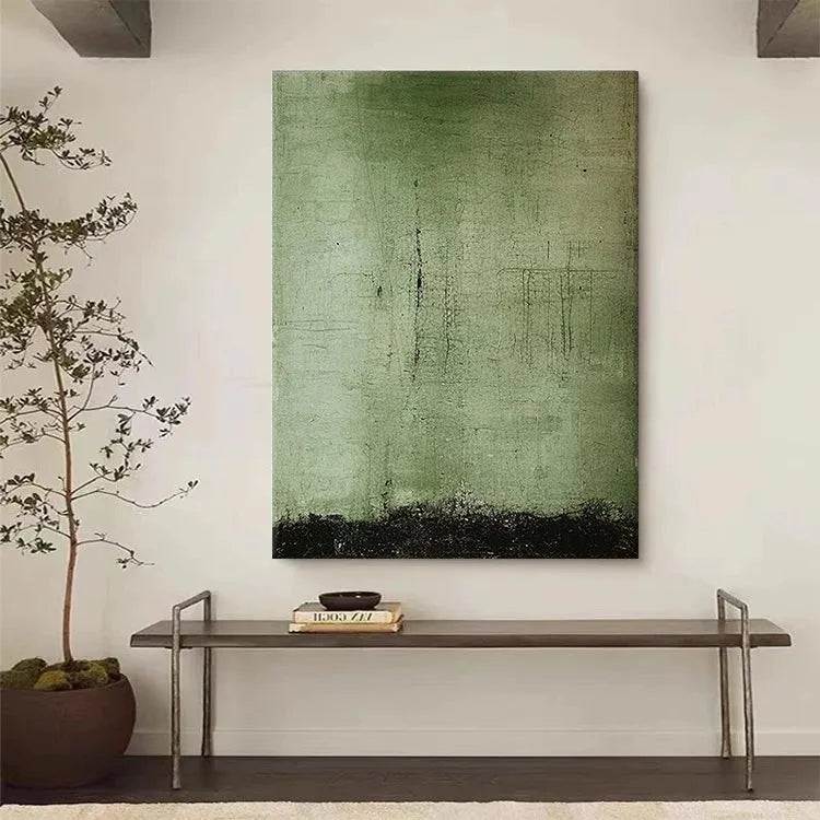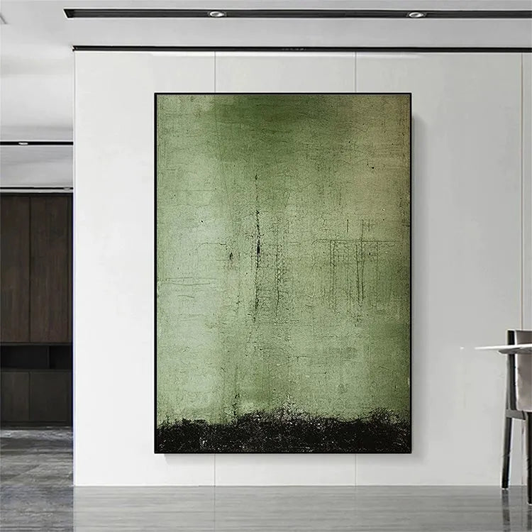 This painting presents a textured, abstract composition characterized by its muted green hue and visible scratches and marks on the surface. The subtle gradient from a lighter green at the top to a darker green at the bottom creates a sense of depth and movement. The rough, almost grungy texture, achieved through visible brushstrokes and scratches, evokes a sense of wear and age, suggesting themes of decay or impermanence. The restrained color palette and textured effects align with the Abstract Expressionism movement, emphasizing emotional and physical experience over representational accuracy. The minimalist approach and focus on texture evoke a contemplative, introspective mood, inviting the viewer to reflect on the passage of time and the imperfections inherent in human experience.