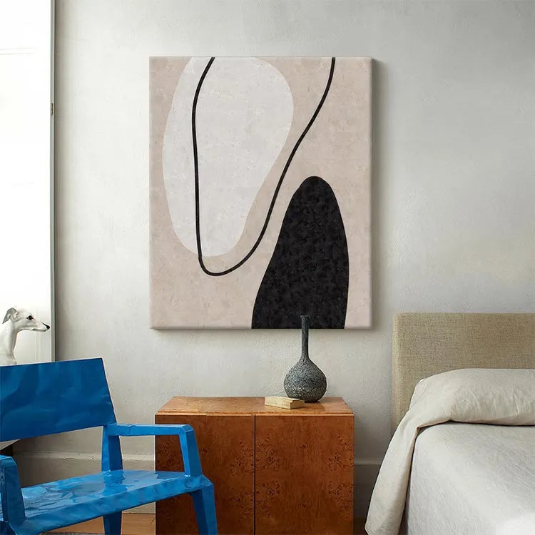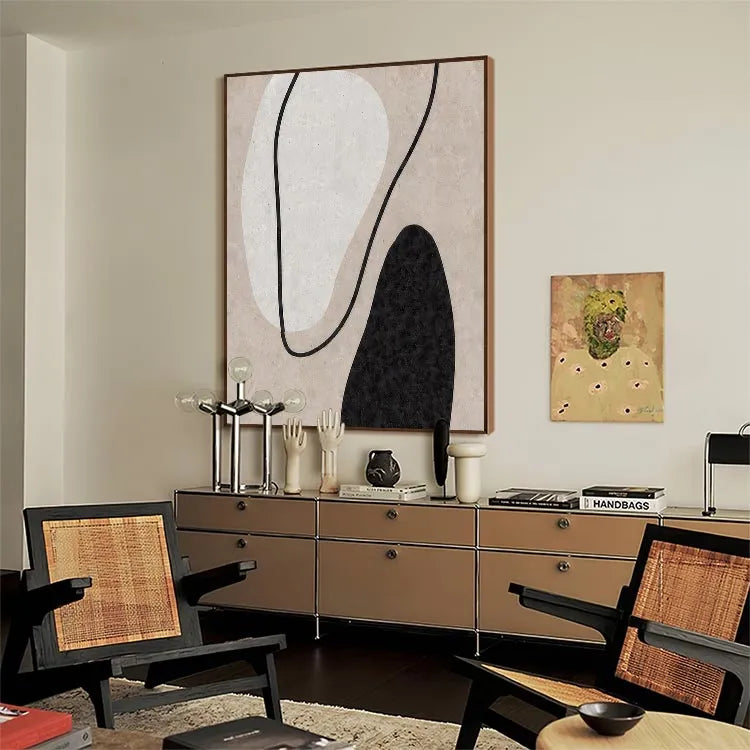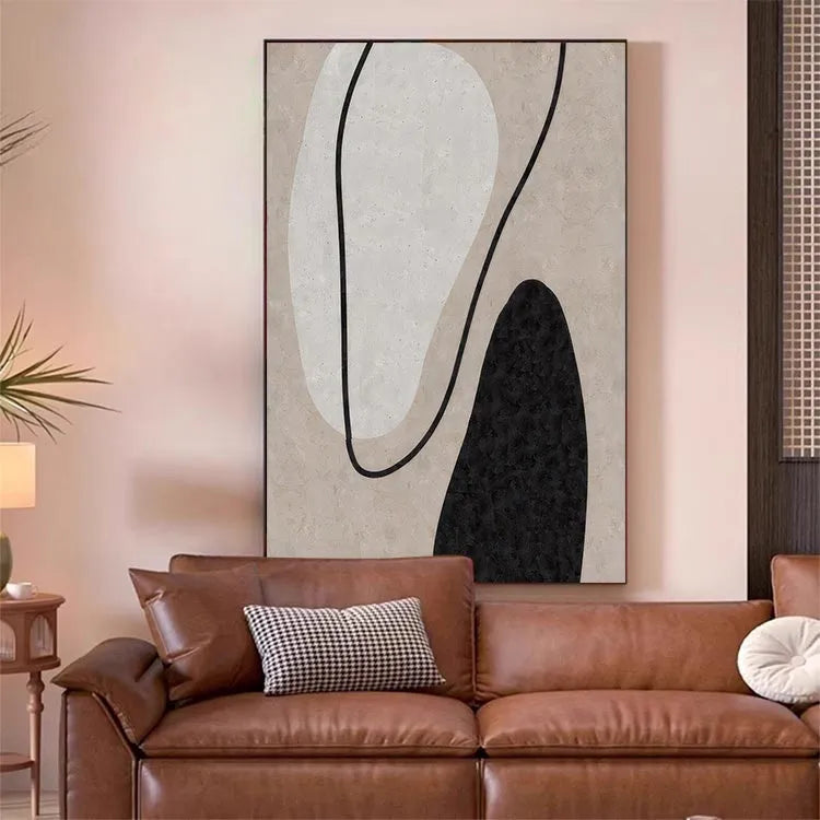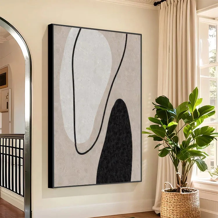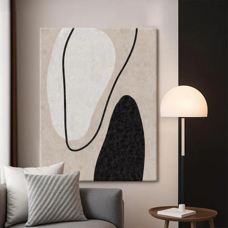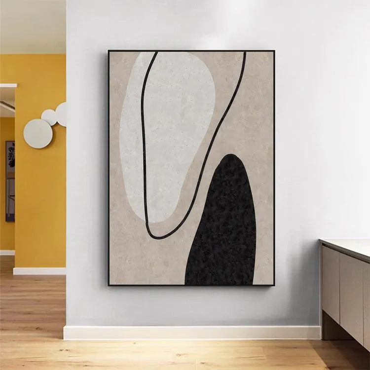 This oil painting exemplifies the abstract style, characterized by its minimalistic composition and use of simple shapes. The artist employs a restrained color palette, featuring a soft beige background, contrasted by a large, white, organic shape and a smaller, black, irregular shape. The black line that curves through the composition adds a dynamic element, guiding the viewer's eye across the canvas. The textures are subtle, with the beige background suggesting a rough, tactile surface. The painting's simplicity and use of negative space are reminiscent of the Bauhaus movement, emphasizing form and function. The interplay of light and shadow within the shapes adds depth, while the overall composition conveys a sense of balance and harmony.