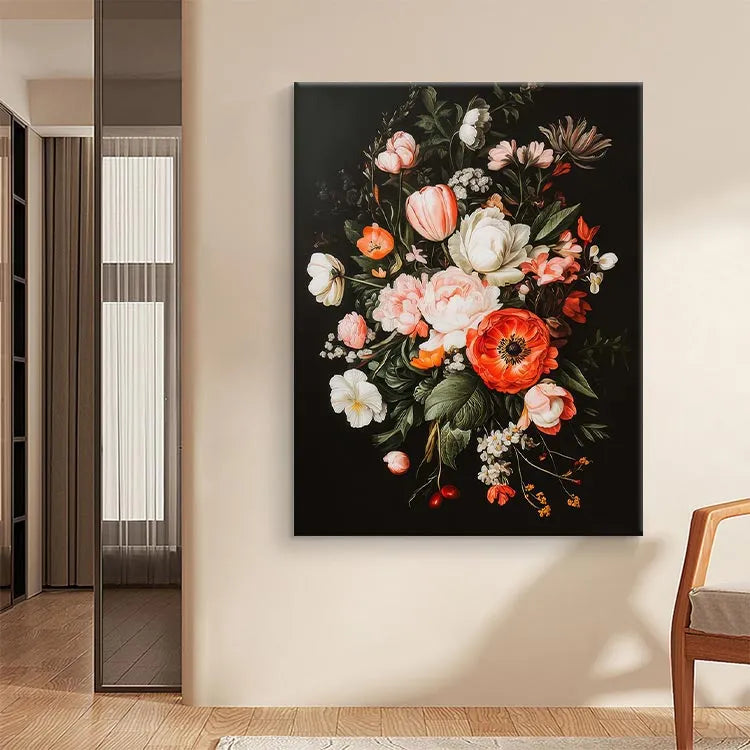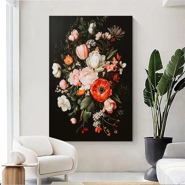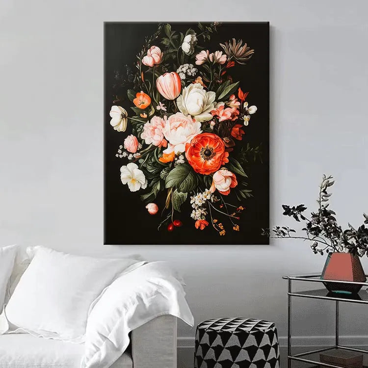 This oil painting exemplifies the Baroque style, characterized by its intricate detail and vibrant use of color. The composition centers on a lush bouquet of flowers, with a striking contrast between the dark, almost black background and the vivid, multi-hued blooms. The artist employs a realistic yet slightly romanticized style, evident in the delicate, finely textured petals and leaves. The use of light is subtle, with highlights accentuating the central flowers, particularly the large, vivid orange poppy and the soft pink peonies. The interplay of warm and cool colors, from the fiery reds and oranges to the soothing whites and greens, creates a balanced yet dynamic visual effect. The texture is smooth, with delicate brushstrokes that enhance the naturalistic appearance of the flowers, while the overall composition evokes a sense of beauty and fragility.