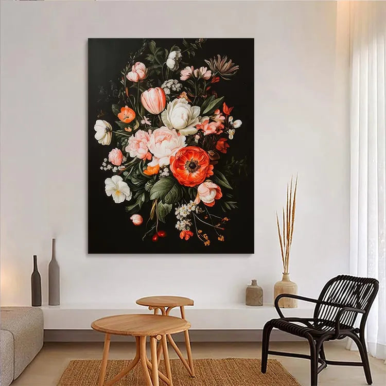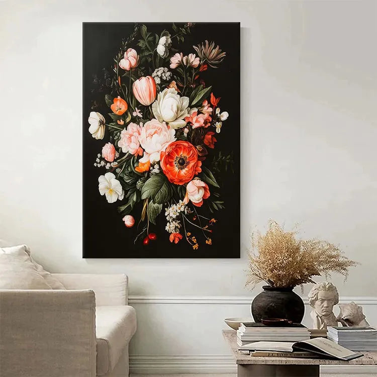 This painting exemplifies the Baroque style with its intricate detail and lush, vibrant floral arrangement. The composition is densely packed, drawing the viewer's eye to the central, large, red anemone, which serves as a focal point. The use of color is striking, with a rich palette of pinks, whites, and reds against a dark background, enhancing the flowers' luminosity. The delicate, realistic brushstrokes highlight the texture of petals and leaves, demonstrating the artist's skill in rendering natural forms. The interplay of light and shadow adds depth, while the varied floral types symbolize abundance and natural beauty. The overall effect is both exquisite and dramatic, characteristic of Baroque still-life paintings.