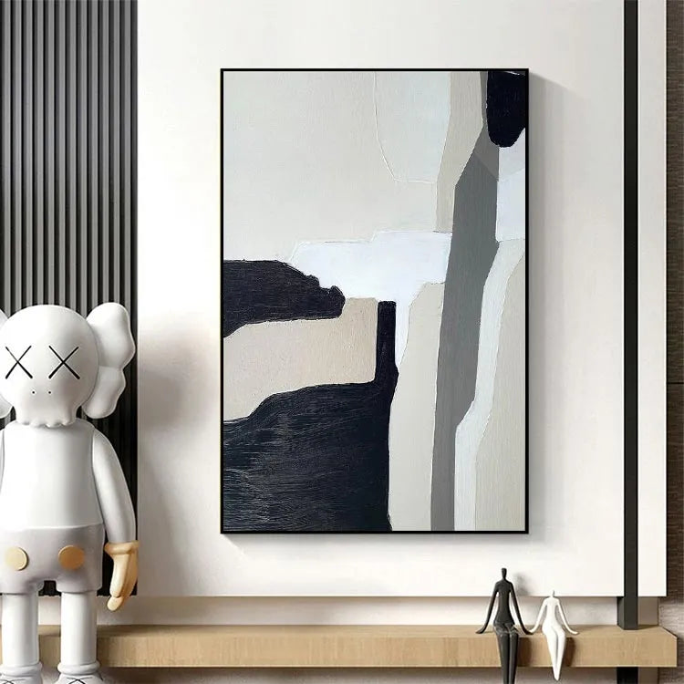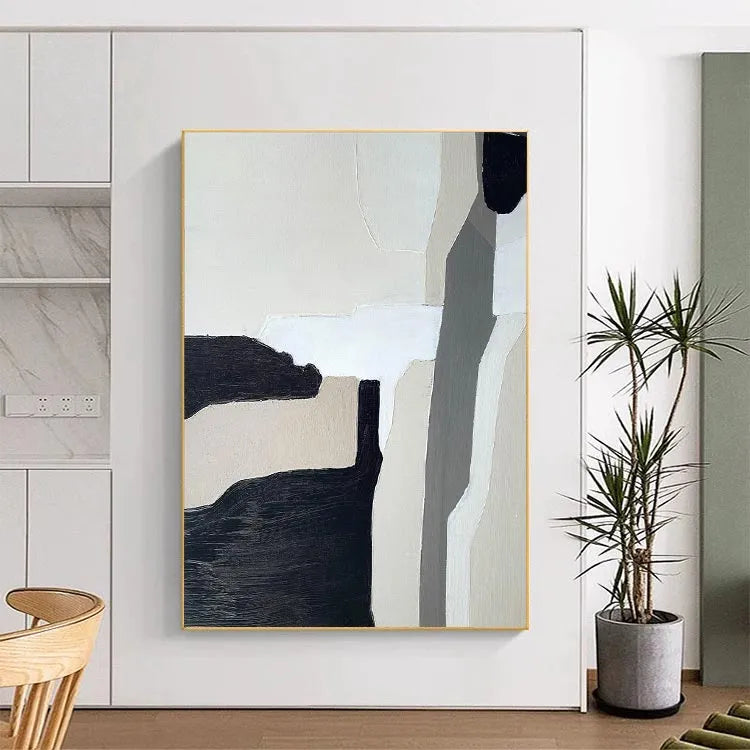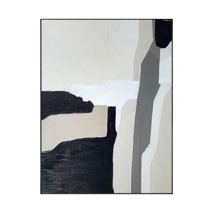 This painting employs a minimalist style, characterized by its restrained color palette and geometric forms. The composition features a subtle interplay between light and dark, with broad, flat areas of black, white, and beige creating a sense of depth and dimension. The use of thick, textured brushstrokes in the black areas contrasts with the smoother, more uniform surfaces of the white and beige, adding a tactile quality to the work. The piece may belong to the Abstract movement, with its focus on form and color rather than representation. The stark, uncluttered arrangement and the interplay of light and shadow evoke a quiet, contemplative mood, reminiscent of the works of artists like Mark Rothko or Kazimir Malevich.