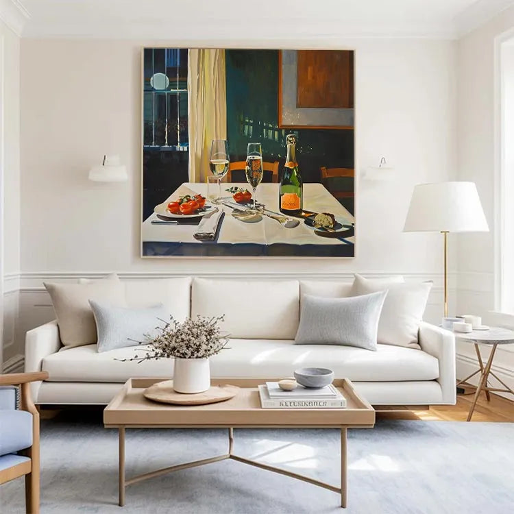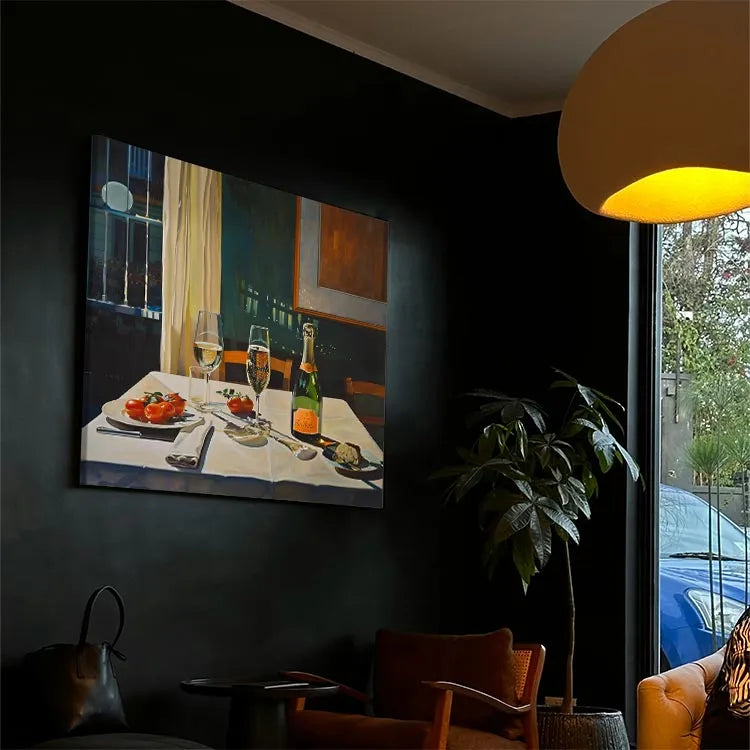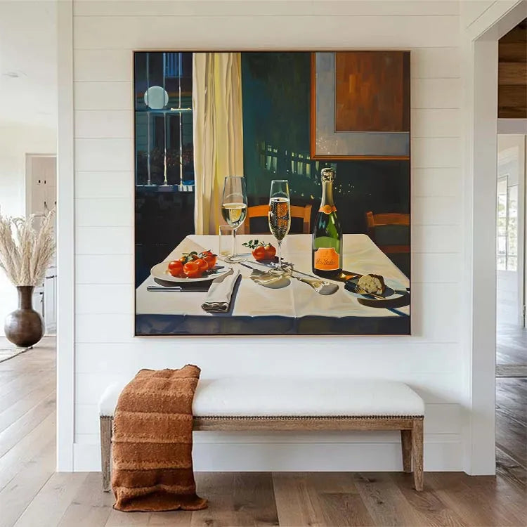 This painting, likely belonging to the Realism movement, captures a still life scene with meticulous attention to detail. The composition is balanced, with a white tablecloth providing a clean, neutral background that contrasts with the vibrant colors of the tomatoes and champagne. The artist employs a realistic style, using smooth, precise brushstrokes to depict the textures of the glass, metalware, and fruit. Light and shadow are skillfully rendered, with the window light casting a gentle glow on the table and creating subtle reflections in the glass. The use of color is restrained yet effective, with the warm reds and greens of the tomatoes and bottle contrasting against the cooler tones of the glass and white cloth. The painting's texture is smooth, with visible but subtle brushstrokes, enhancing the realistic effect.