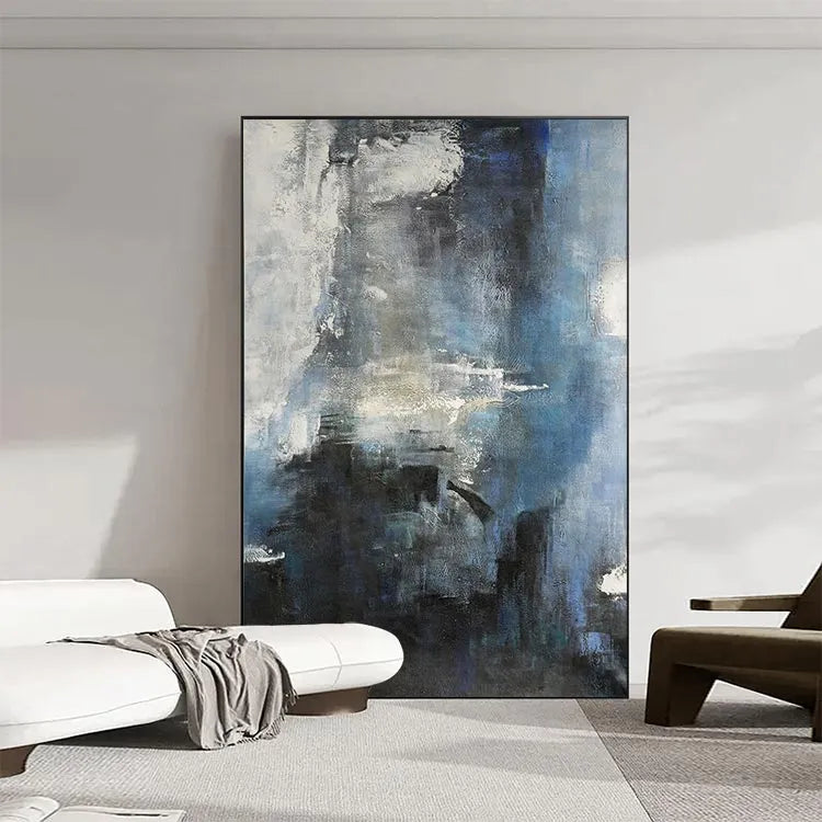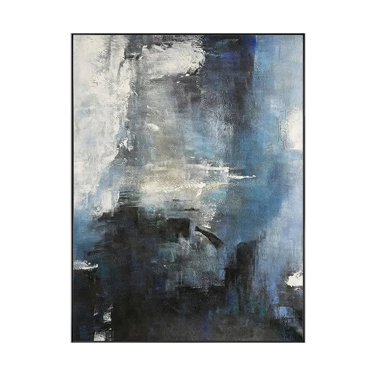 This abstract painting employs a textured, layered composition with a predominant use of cool colors—blues, grays, and whites. The brushstrokes are thick and impasto-like, creating a rugged, almost tactile surface that evokes a sense of depth and movement. The central vertical division suggests a dynamic interplay between light and shadow, with the lighter, white areas contrasting against the darker, bluish-gray sections. The color palette and texture evoke the atmospheric effects of a cityscape at dusk, aligning with the Abstract Expressionist movement. The lack of defined forms and the emphasis on texture and color over representational accuracy highlight the artist's focus on emotional and visual experience over specific subject matter.