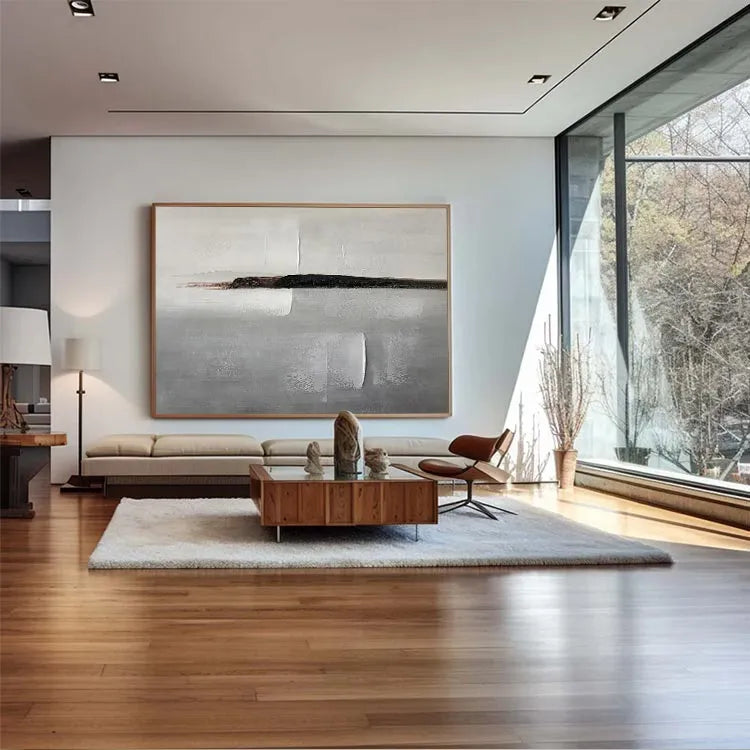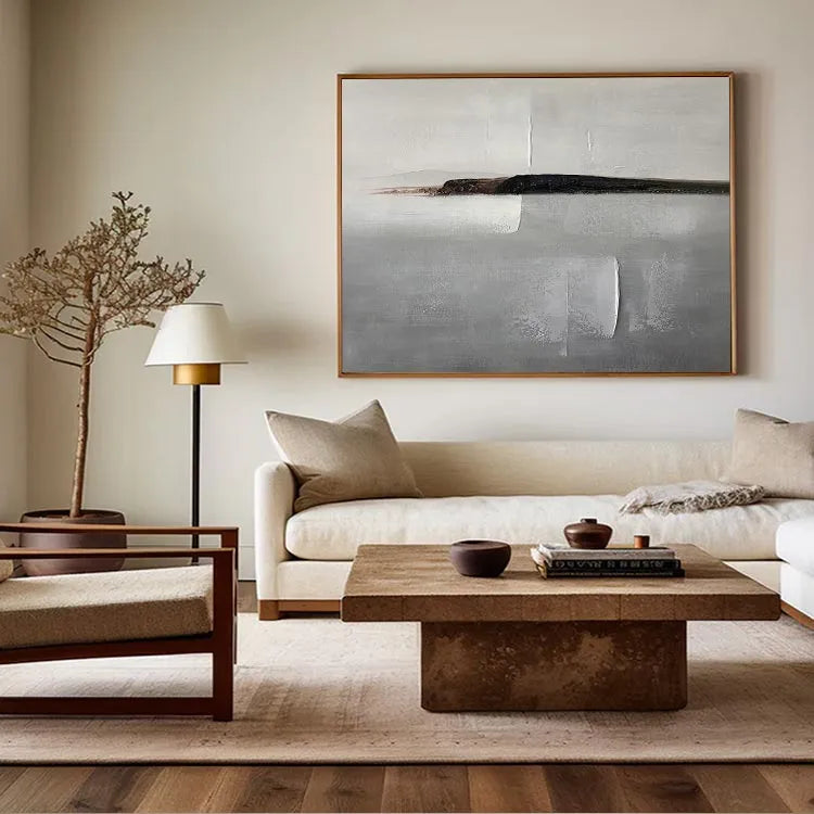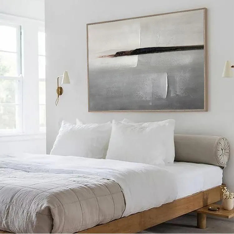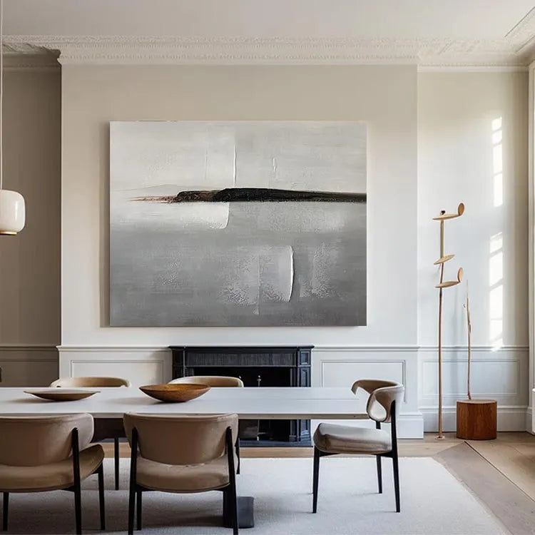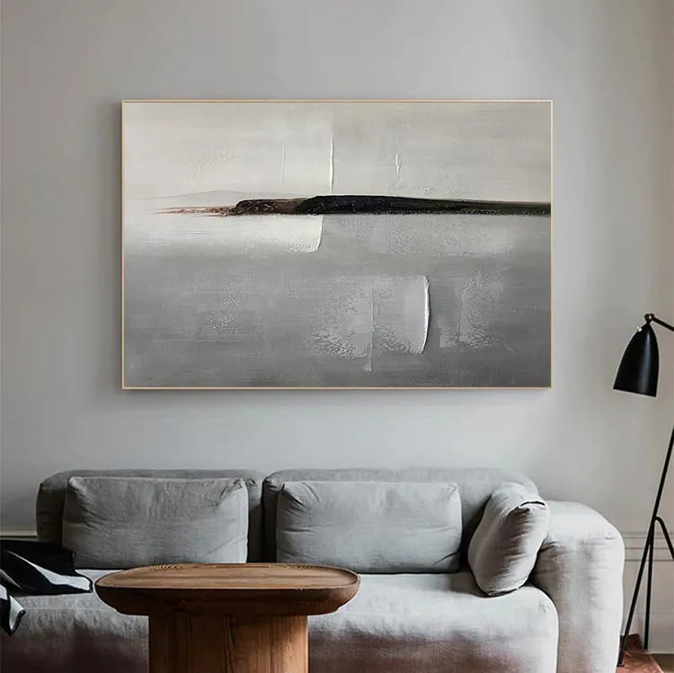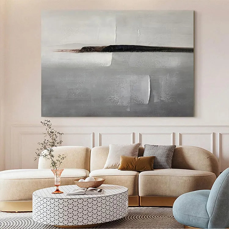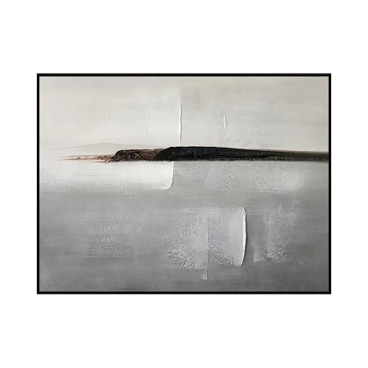 This oil painting features a minimalist composition with a stark, horizontal black line set against a predominantly gray and white background. The texture is rough, with visible brushstrokes and layers of paint creating a sense of depth. The color palette is restrained, emphasizing the contrast between the dark line and the lighter tones. The light source is subtle, with a gentle gradient suggesting a diffuse light. This work aligns with the principles of Minimalism, focusing on the essence rather than the detail. The use of color and texture suggests a contemplative, almost abstract representation of landscape or horizon. The simplicity and subtlety evoke a quiet, introspective mood.