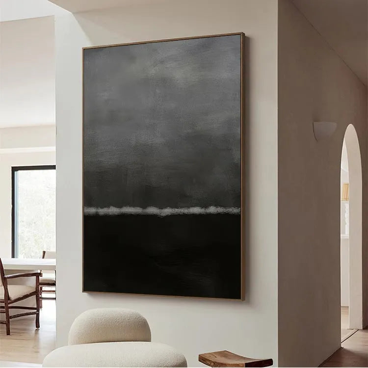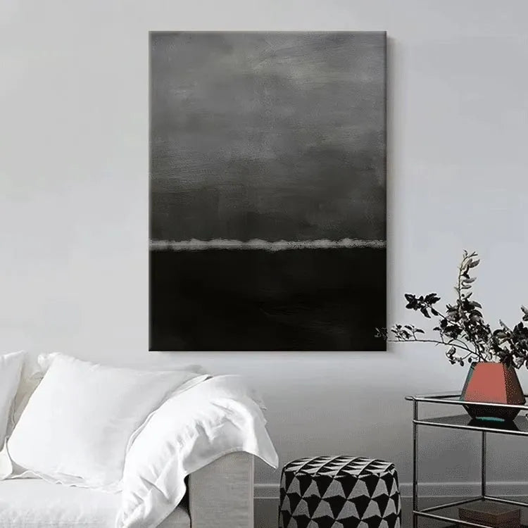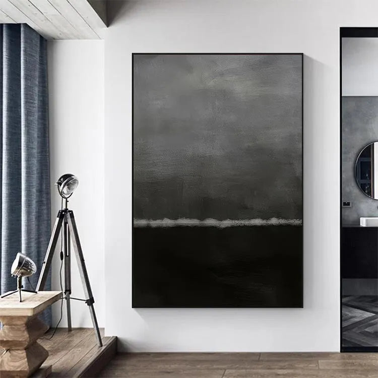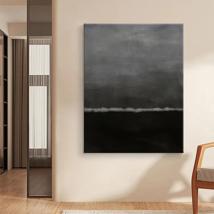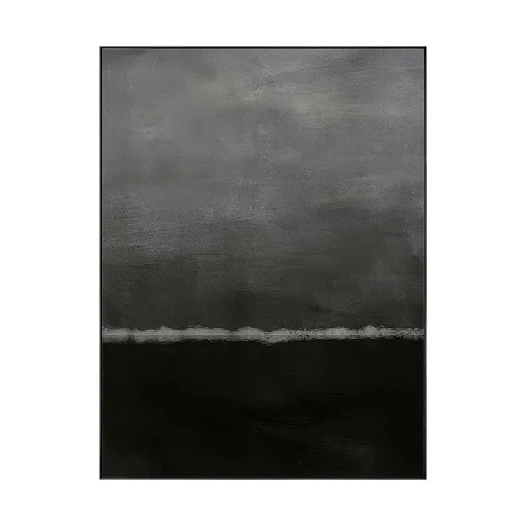This oil painting features a minimalist composition with a stark division between a dark, almost black lower half and a lighter, gray upper half. The subtle gradation between the two halves creates a sense of depth and mystery. The use of color is restrained, with muted grays and blacks, evoking a somber, introspective mood. The texture of the brushstrokes is visible, adding a tactile quality to the smooth, yet slightly roughened surface. The horizontal line separating the two halves suggests a boundary or separation, possibly symbolizing a divide between the subconscious and the conscious, or the unknown and the known. The painting's style aligns with minimalist and abstract movements, emphasizing simplicity and the emotional impact of color and form.