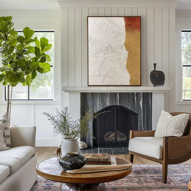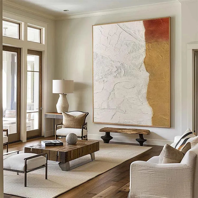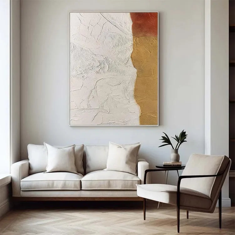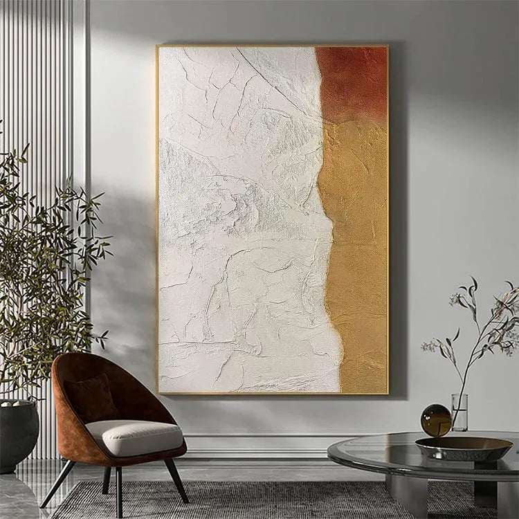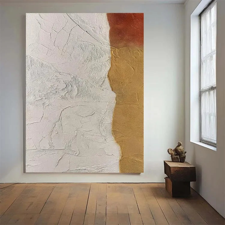 This abstract painting employs a textured, crackled surface that juxtaposes stark white, rich red, and golden yellow hues. The vertical division between these colors creates a dynamic yet balanced composition, reminiscent of the divisionism movement. The textured cracks add a sense of depth and physicality, suggesting the passage of time or the fragility of the surface. The use of color transitions from the cool, neutral white to the warm, vibrant red and gold, invoking a sense of emotional warmth and optimism. The rough texture contrasts with the smooth gradation of colors, highlighting the artist's skill in creating tactile visual interest. The minimalistic approach and color palette suggest a contemporary, yet timeless, aesthetic.