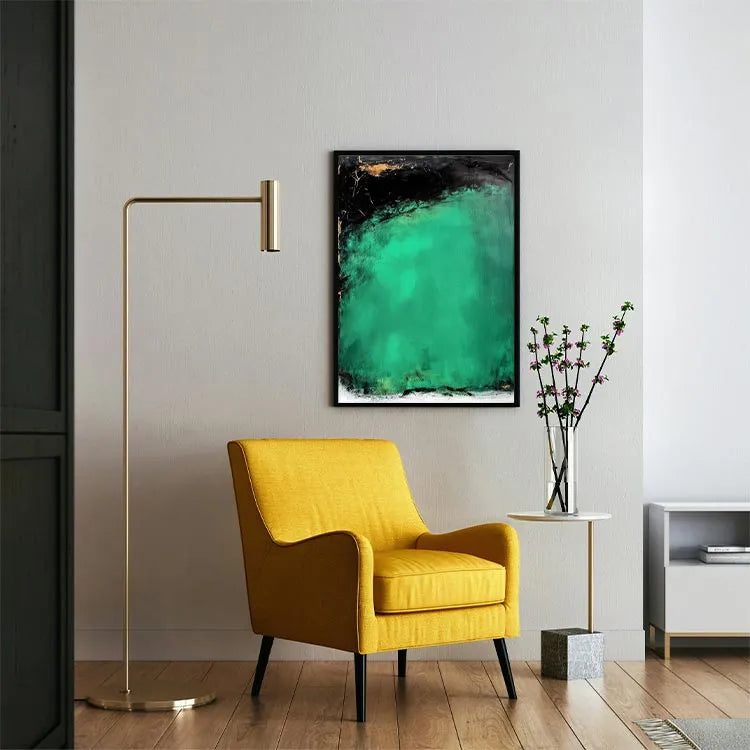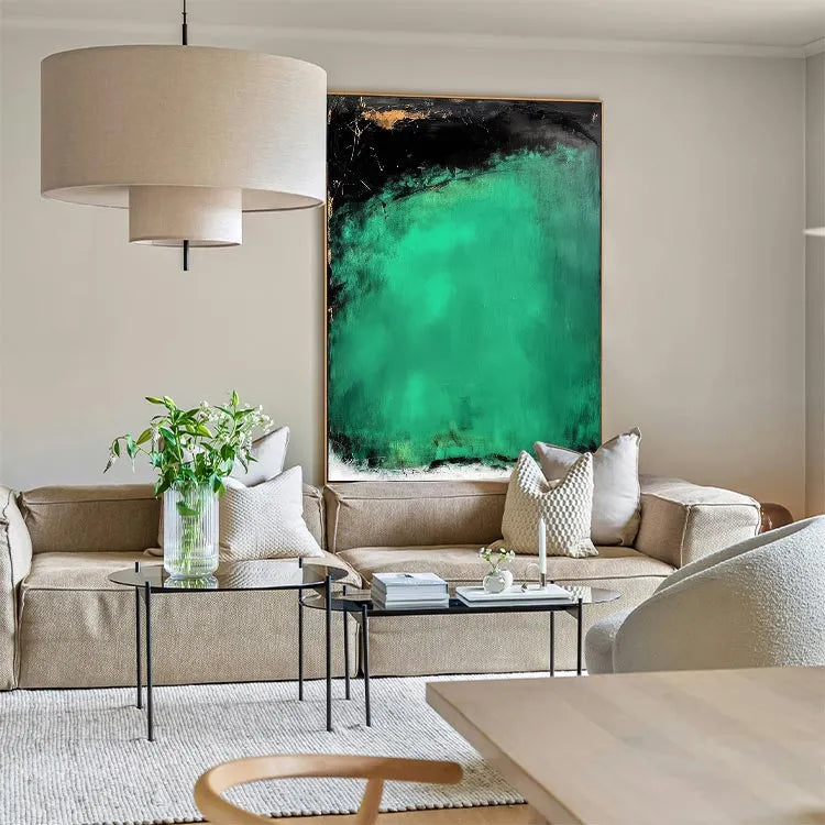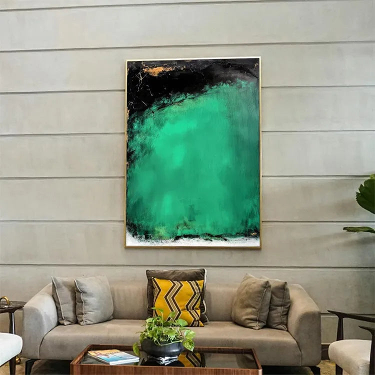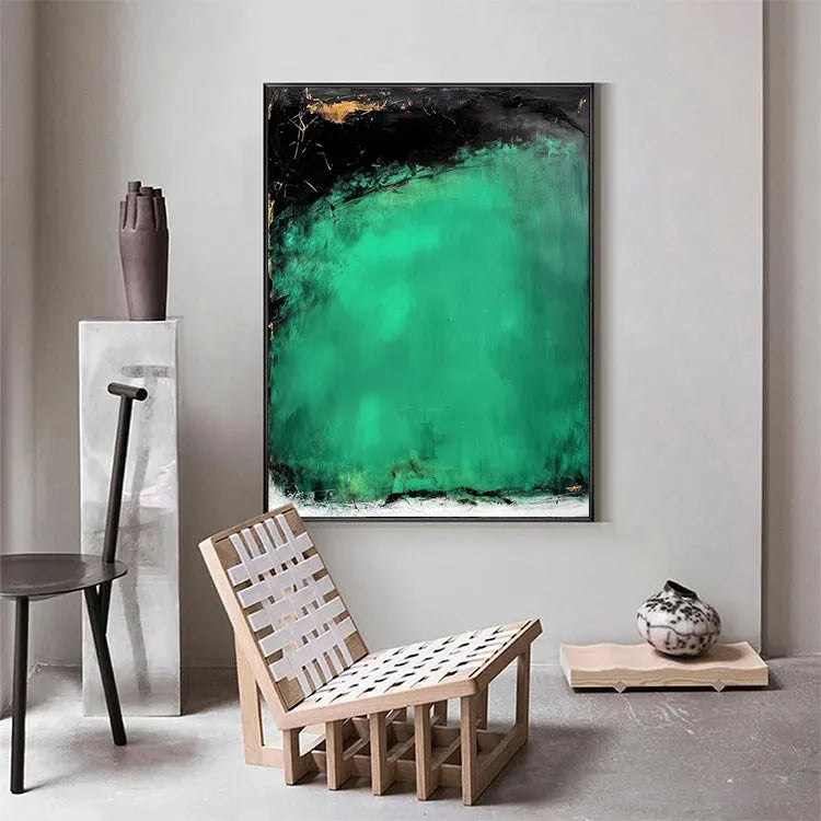This painting employs a bold, abstract style, reminiscent of the Expressionist movement. The composition features a striking contrast between a deep, textured black at the top and a vibrant, translucent green in the center. The black, with its rough, almost scratched texture, suggests a sense of chaos or emotional intensity, while the green, with its smooth, gradient-like transitions, evokes a calming, yet mysterious atmosphere. The use of color is symbolic, possibly representing duality or the interplay between emotions. The brushstrokes are varied, with the black's roughness juxtaposed against the green's fluidity, creating a dynamic tension. The white border at the bottom adds a subtle frame, grounding the composition. The overall effect is one of emotional depth and complexity, inviting the viewer to ponder the artist's inner world.