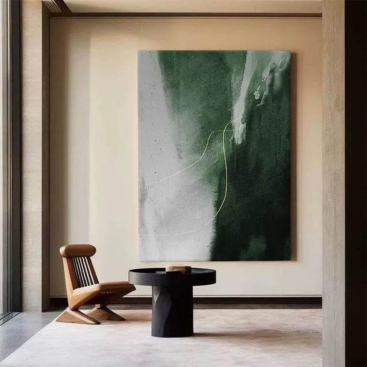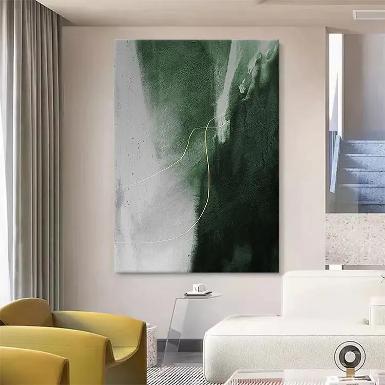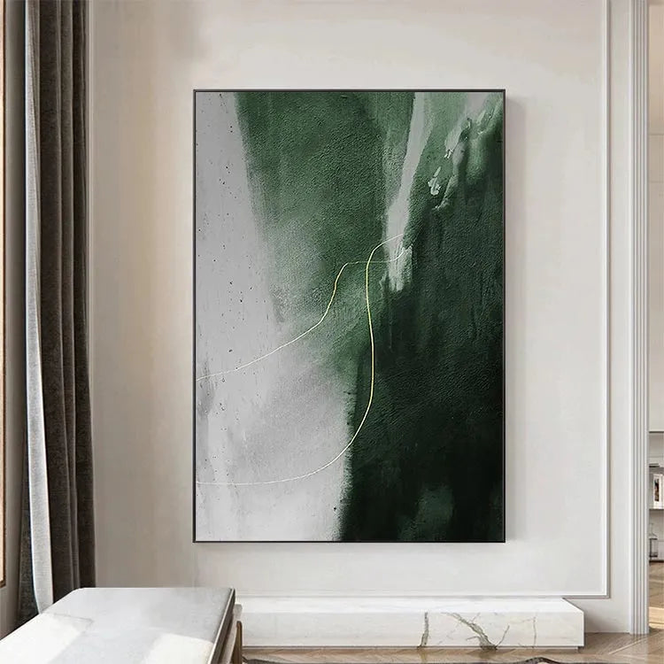 This abstract painting employs a minimalist approach, characterized by its restrained color palette and fluid composition. The juxtaposition of deep green and light gray areas creates a dynamic contrast, with the green suggesting depth and the gray indicating a lighter, possibly ephemeral, layer. The golden, sinuous line adds a sense of movement and direction, guiding the viewer's eye through the piece. The texture appears smooth, with subtle gradients and a slightly roughened surface that adds depth. The style is reminiscent of Abstract Expressionism, focusing on the emotional and formal qualities of the composition rather than representational accuracy. The use of color and line effectively conveys a sense of tension and harmony.