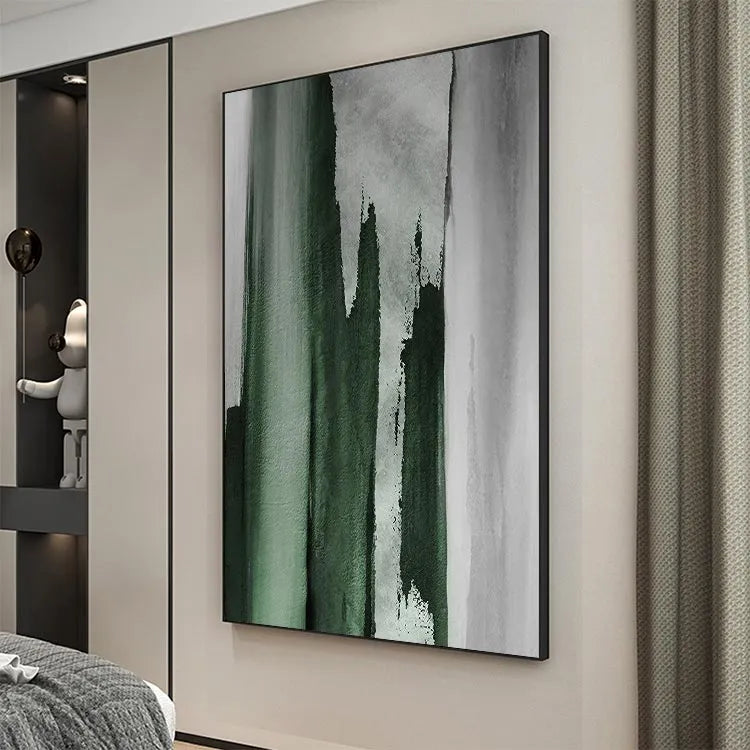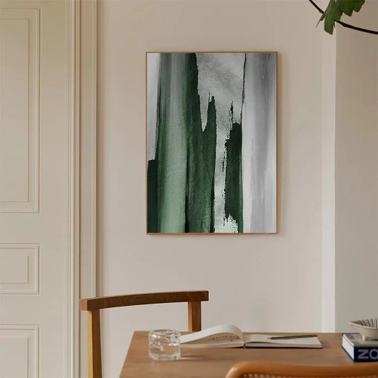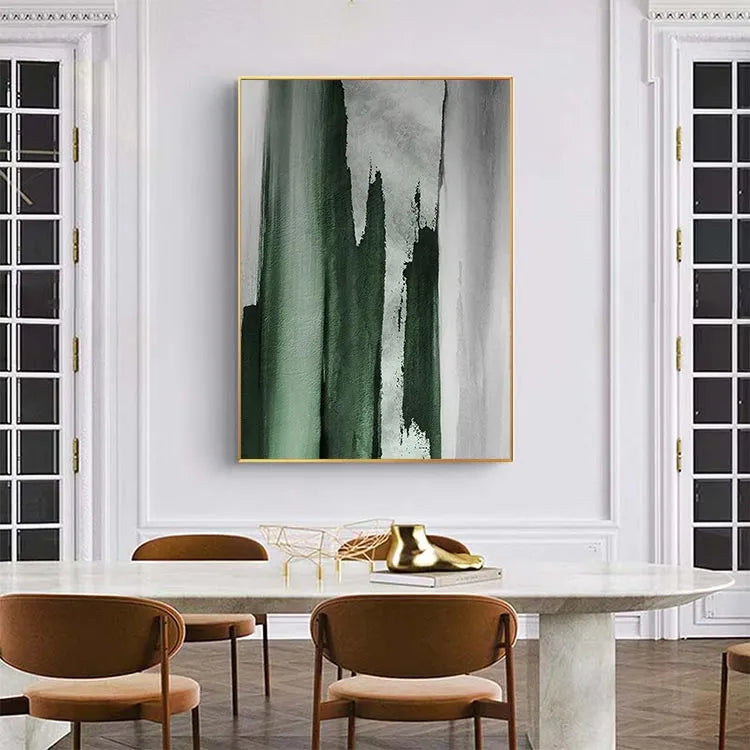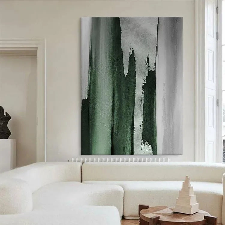 This abstract painting employs a minimalist, yet dynamic composition, characterized by vertical brushstrokes that create a sense of movement and depth. The color palette, dominated by varying shades of green and white, suggests a natural, perhaps forest-like, environment. The textured brushstrokes, with their rough, uneven edges, add a tactile quality to the piece, enhancing its visual impact. The use of color gradients from light to dark green, contrasted by white, implies a sense of light and shadow, adding dimensionality. This work may belong to the Abstract Expressionism movement, with its emphasis on spontaneous creation and emotional expression. The overall effect is one of quiet, yet powerful, natural beauty.