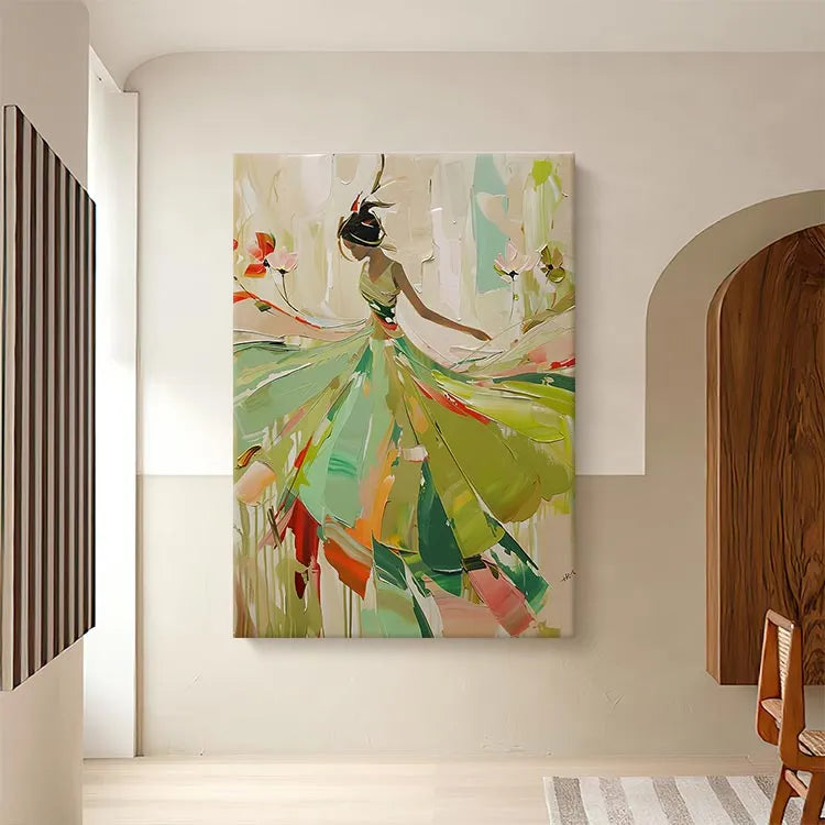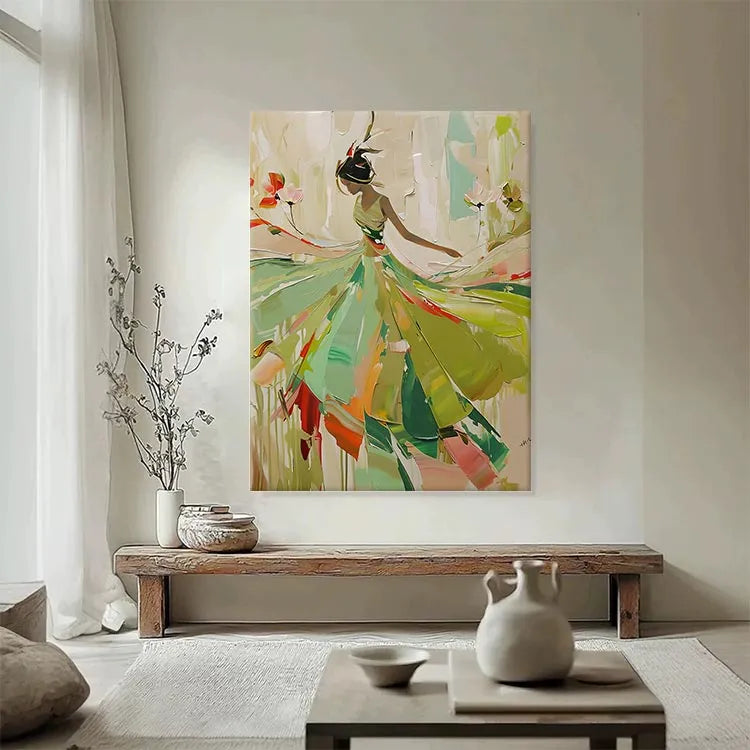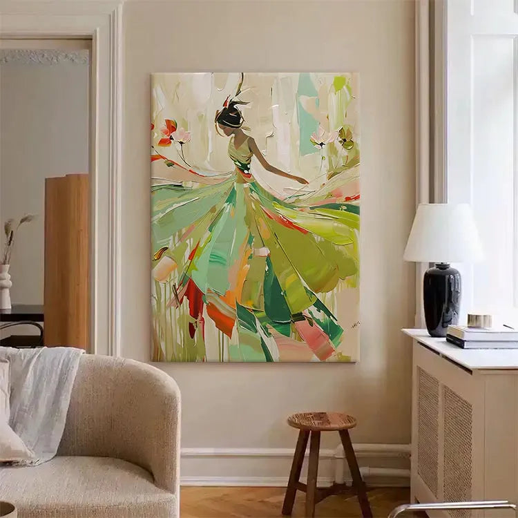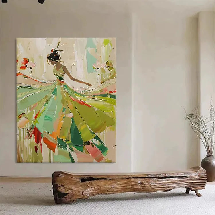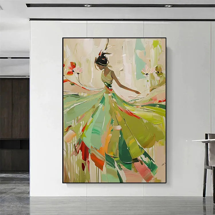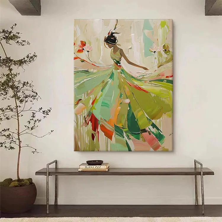 This painting exhibits a modern, abstract style with a focus on fluid, dynamic movement. The composition features a silhouette of a dancer or figure, rendered in a minimalist yet expressive manner. The use of color is vibrant yet restrained, with a palette dominated by greens, yellows, and reds, suggesting a natural, organic environment. The brushstrokes are broad and sweeping, creating a sense of motion and energy. The figure's dress, with its flowing, almost petal-like forms, suggests grace and lightness. The interplay of light and dark areas enhances the sense of depth and dimension. This work may belong to the Abstract Expressionism movement, with its emphasis on emotion and movement over realistic representation. The artist's signature in the bottom right corner suggests a personal touch and completion of the piece.