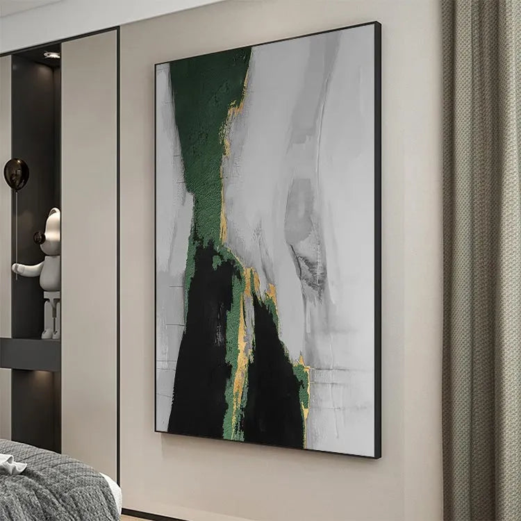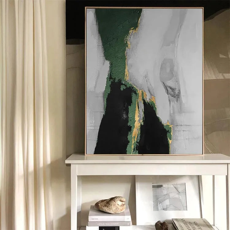 This abstract painting features a striking contrast between dark green, black, and gold areas, juxtaposed against a textured, grayish-white background. The composition suggests a vertical division, with the green and gold elements appearing to cascade down from the top, creating a sense of movement and depth. The textured brushstrokes and rough, almost three-dimensional surfaces add a tactile quality to the piece. The use of color is symbolic, with green and gold possibly representing natural elements and value, while the grayish-white background suggests a neutral, perhaps introspective space. This work could be associated with the abstract expressionism movement, characterized by its emotional intensity and non-representational forms.