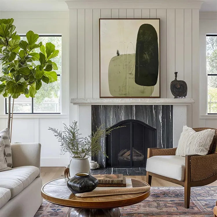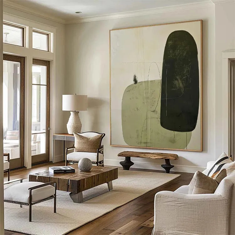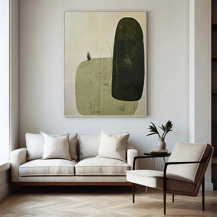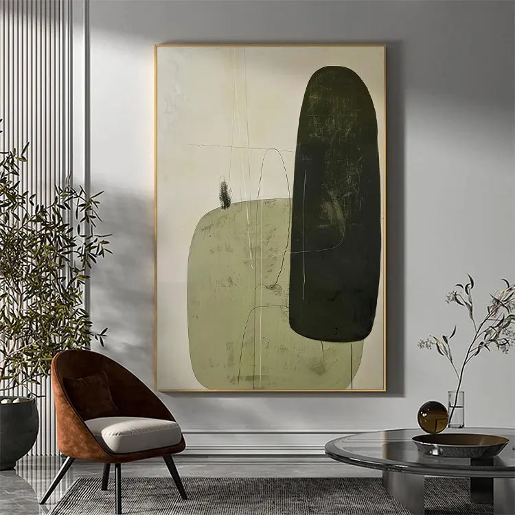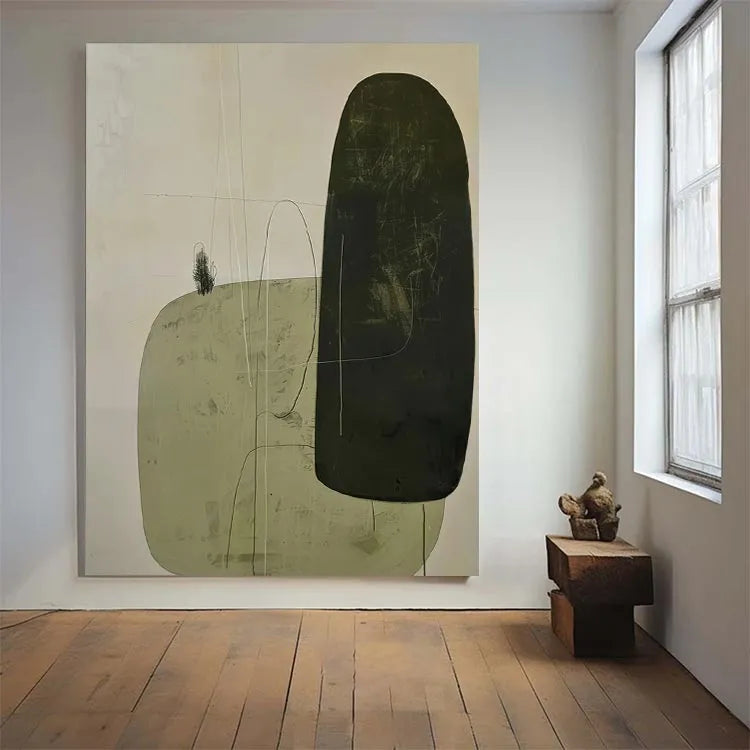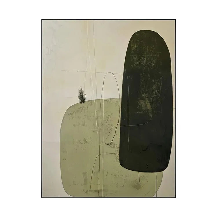 This painting, characterized by its minimalist and abstract style, employs a muted color palette dominated by green and black. The composition features two overlapping, organic shapes: a translucent green form in the lower left and a solid black form in the upper right. Thin, white, curved lines intersect the shapes, adding a sense of movement and tension. The textured, almost grungy surface of the green shape contrasts with the smooth, matte finish of the black shape. The use of light and shadow within the black shape suggests depth and internal complexity. This work may be associated with the Abstract Expressionism movement, emphasizing form, space, and emotional content over realism. The subtle interplay of texture and color creates a contemplative, yet dynamic visual experience.