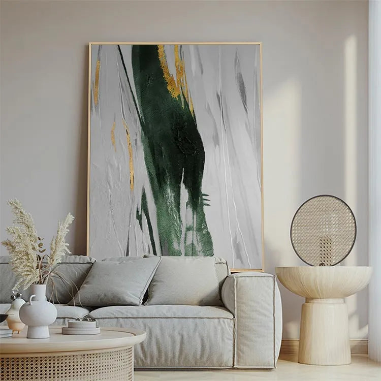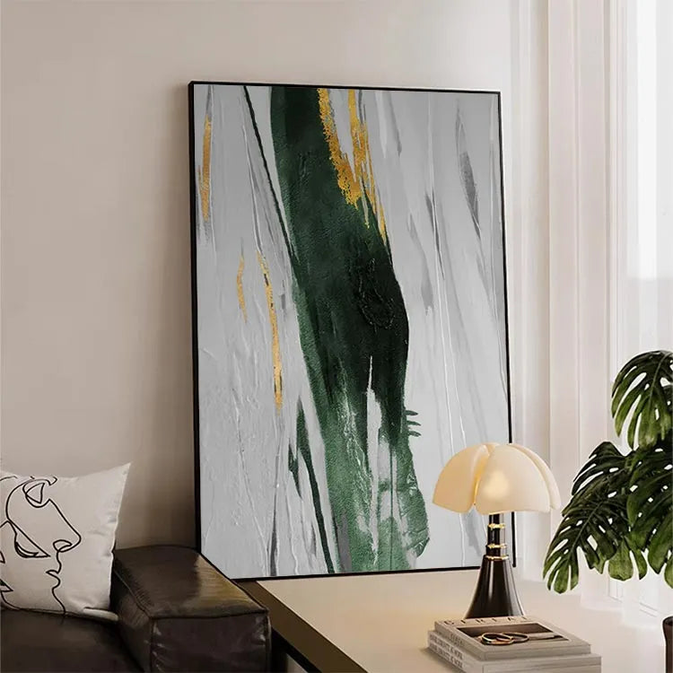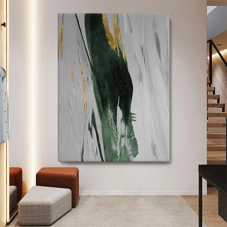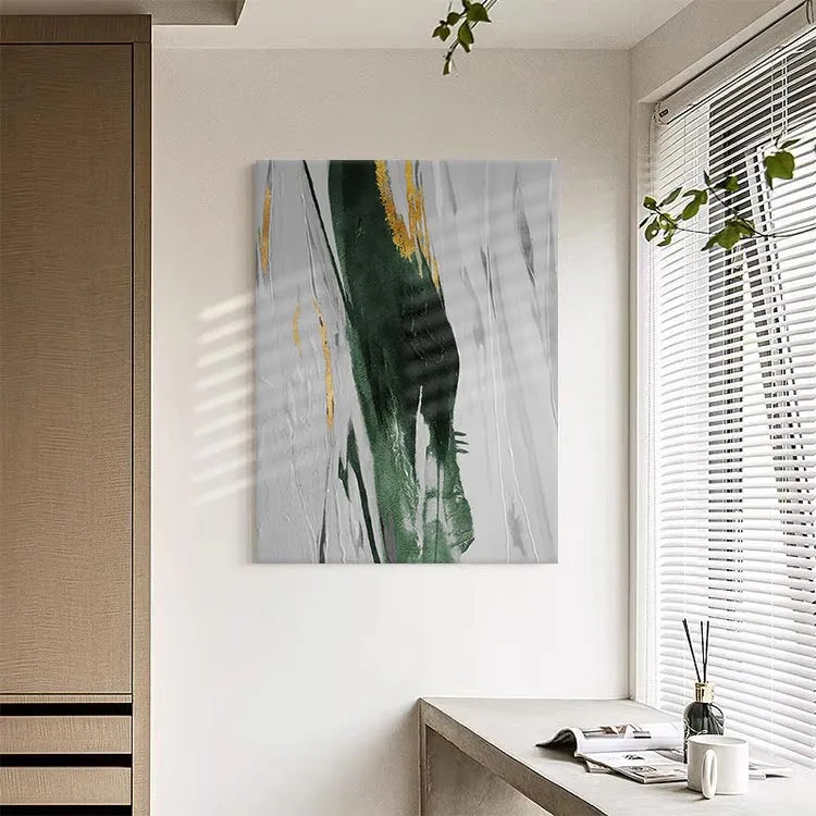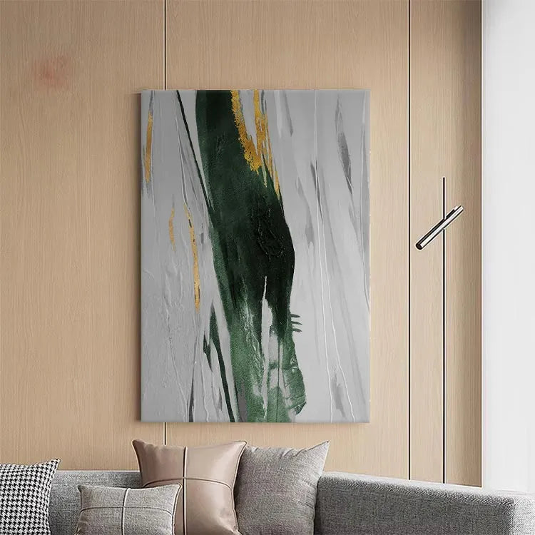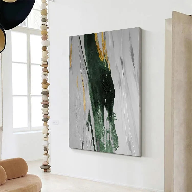This abstract painting employs a textured, layered composition, with thick, vertical brushstrokes in dark green and gold against a white background. The green strokes dominate the center, creating a sense of depth and movement, while the gold accents add a touch of luminosity and contrast. The texture suggests a mixed-media approach, with visible brushstrokes and possible layering techniques. The use of color and texture evoke a natural, organic form, reminiscent of contemporary abstract expressionism. The interplay between the dark green and white, with gold highlights, suggests a balance between chaos and order, and may symbolize the intersection of nature and human intervention.