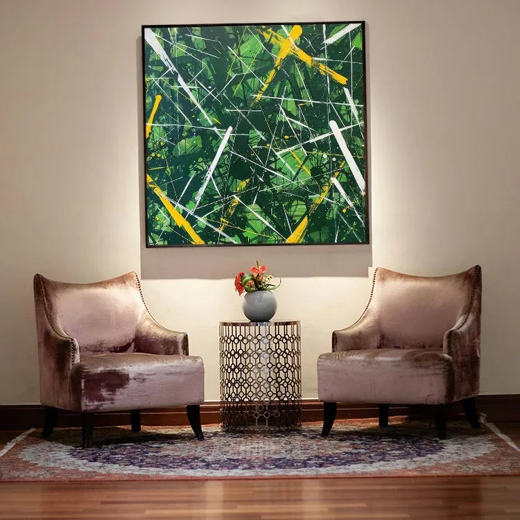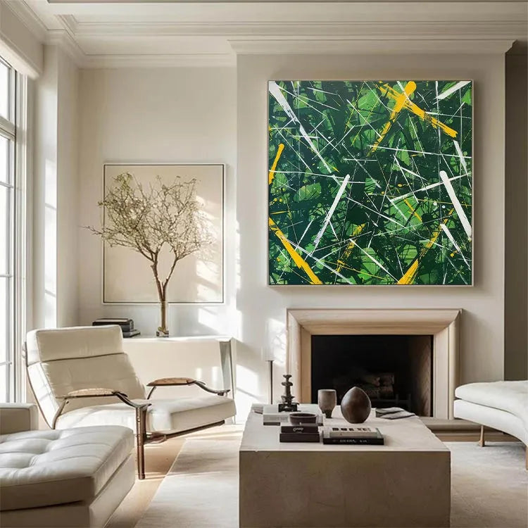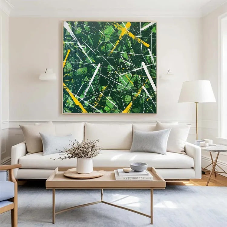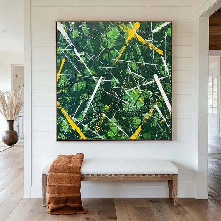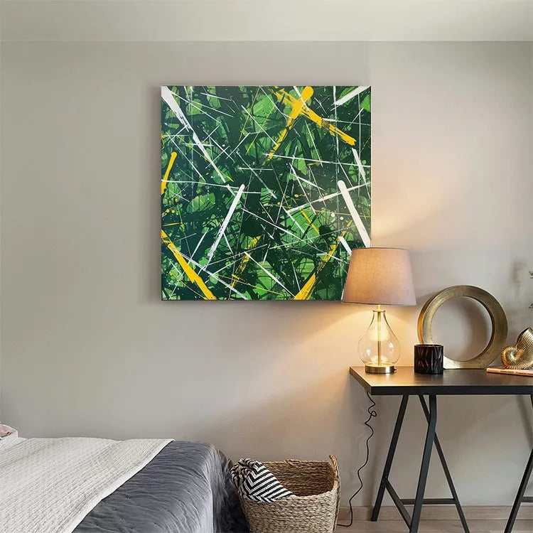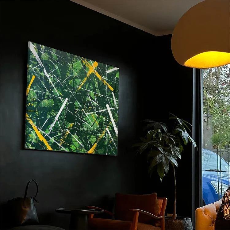 This abstract painting features a dynamic composition of intersecting lines and geometric shapes, primarily in green, yellow, and white. The chaotic arrangement of lines, with their varying thicknesses and directions, creates a sense of movement and disorder. The use of green as the dominant color evokes a natural, yet chaotic, atmosphere, while the yellow accents add a contrasting vibrancy. The white lines provide a stark, linear contrast, guiding the viewer's eye through the complex web of shapes. The texture appears to be smooth, with visible brushstrokes adding a sense of spontaneity. This work aligns with the Abstract Expressionist movement, emphasizing emotional expression through form and color. The interplay of light and dark areas within the green background further enhances the sense of depth and complexity.