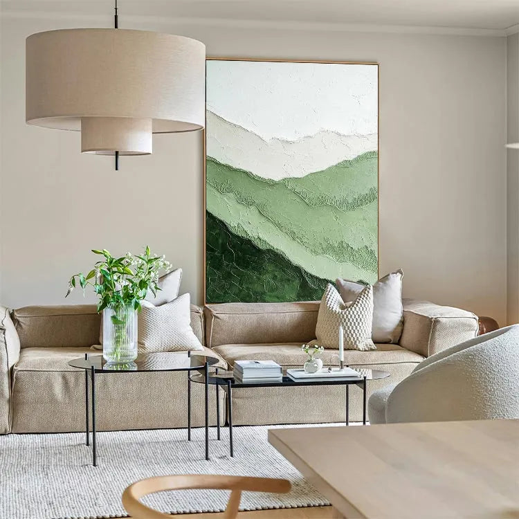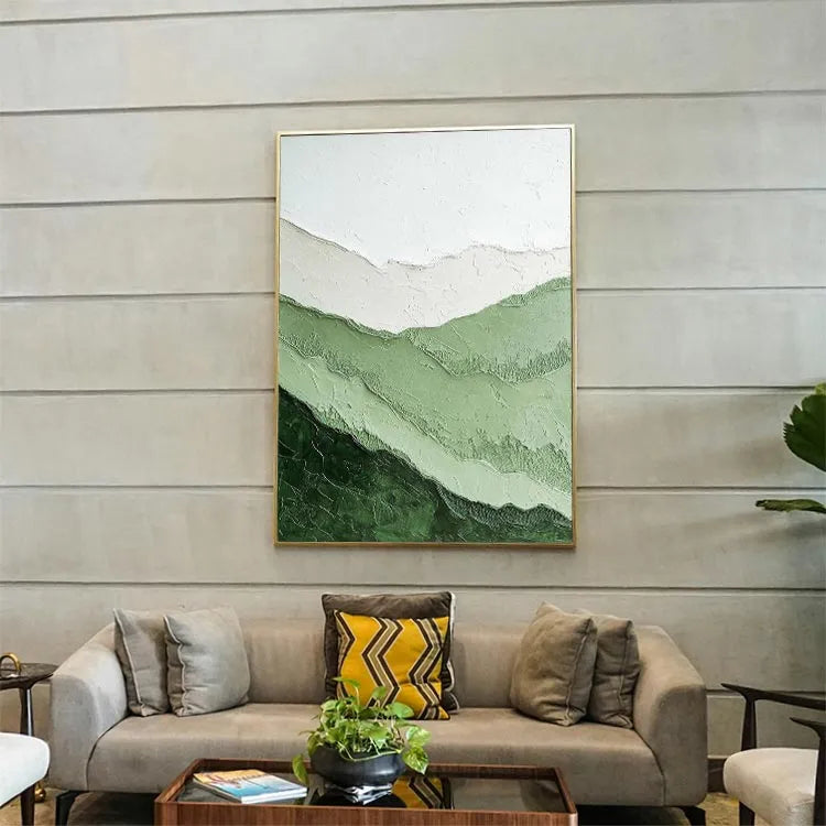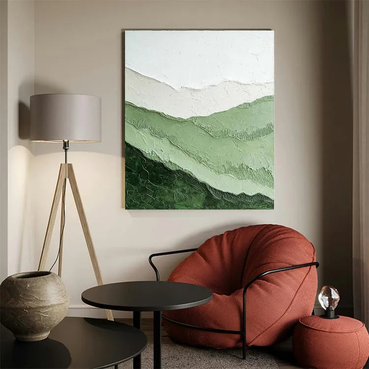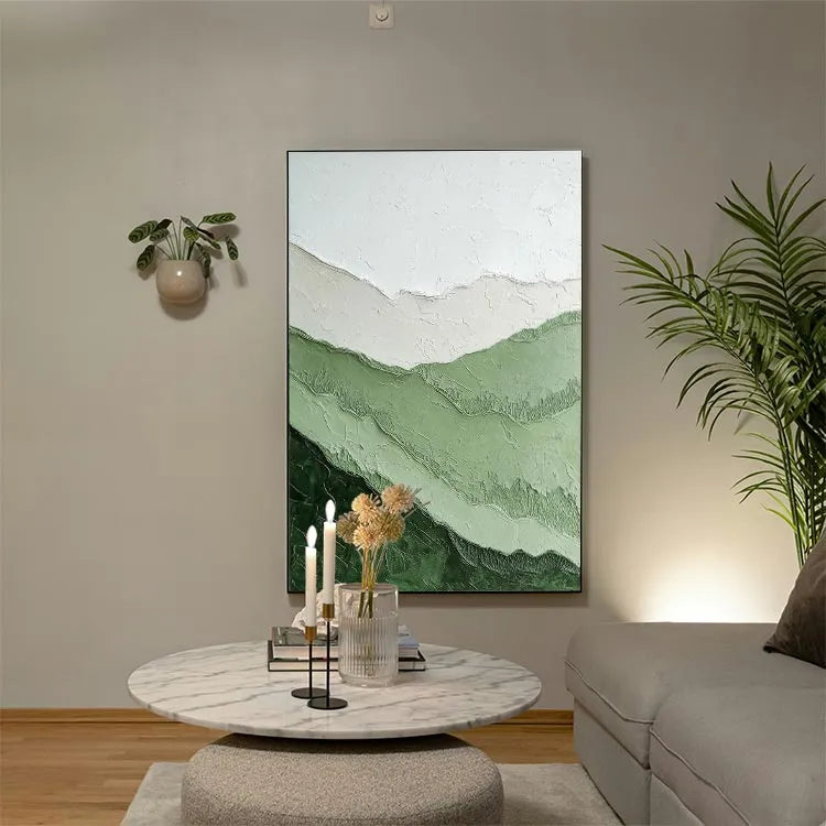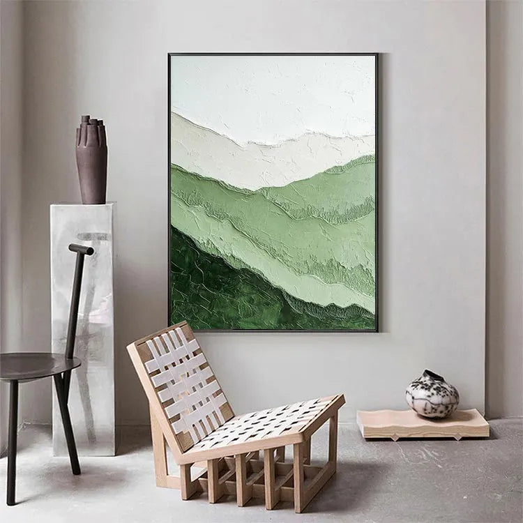 This painting exhibits a minimalist and abstract style, characterized by its simplicity and emphasis on texture and color gradation. The composition consists of layered, undulating bands of green and white, creating a sense of depth and movement. The textured surface, with visible ridges and grooves, adds a tactile quality, inviting the viewer to explore its physicality. The use of color is restrained yet effective, with the greens ranging from dark to light, symbolizing natural landscapes or the passage of time. The white band at the top contrasts subtly, suggesting a clear sky or an abstract horizon. The overall style aligns with the Abstract Expressionism movement, focusing on the emotional and physical impact of the artwork rather than realistic representation.