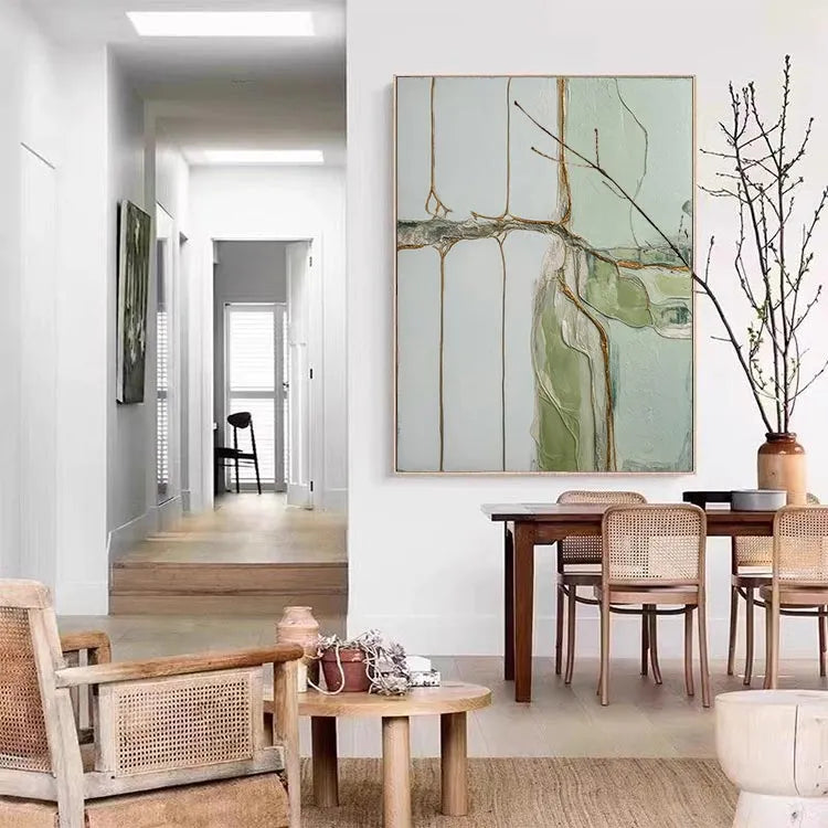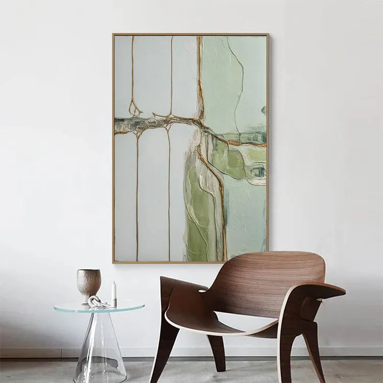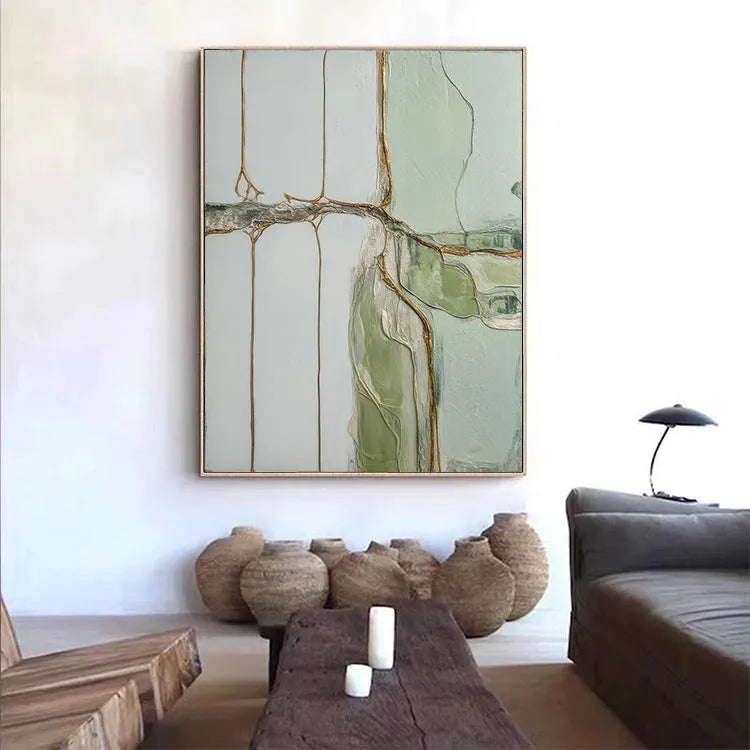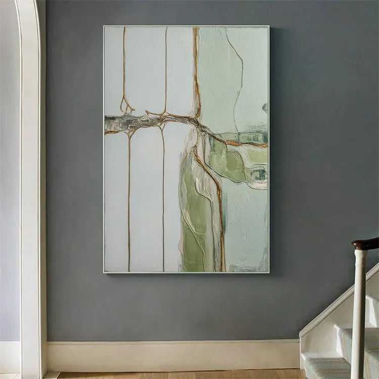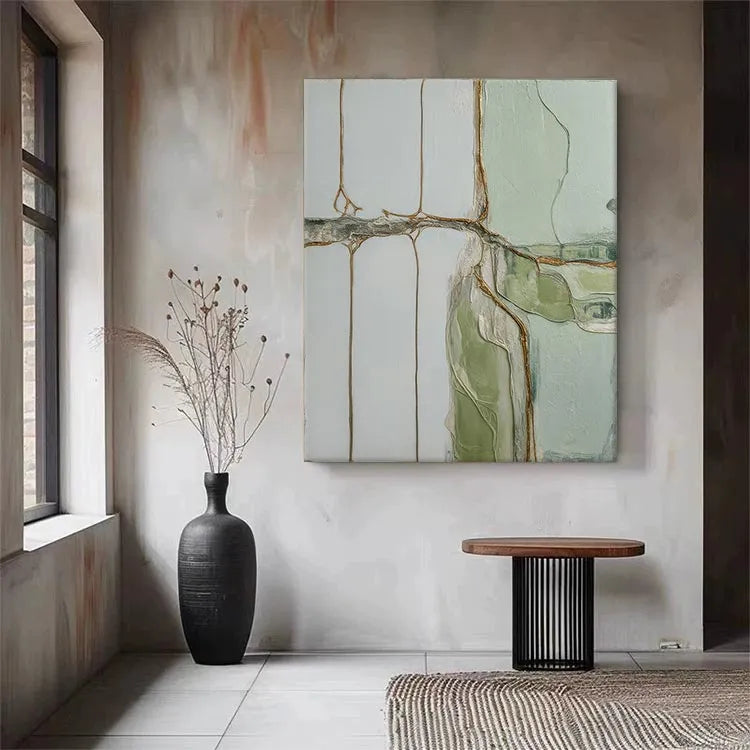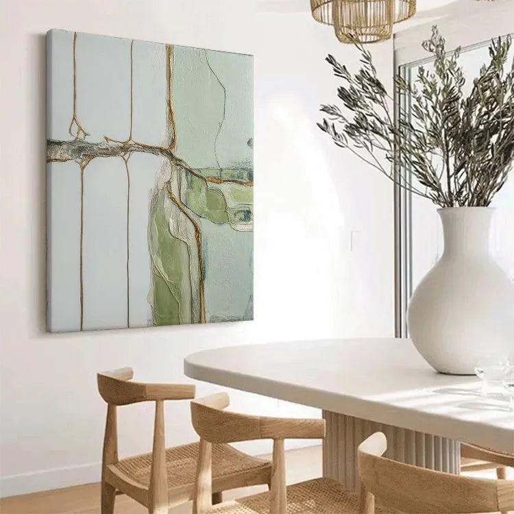 This abstract painting employs a minimalist style, characterized by its restrained color palette and geometric composition. The use of pale greens, whites, and rusty browns creates a serene yet subtle contrast. The textured, almost cracked surface suggests a layered, almost geological process, reminiscent of the techniques used by abstract expressionists like Jackson Pollock. The thin, linear brown elements intersect the white and green fields, evoking a sense of natural forms or organic structures. The light, diffused quality of the colors and the subtle texture contribute to a calm, contemplative mood. This work may be associated with the abstract expressionism movement, focusing on the emotional and spiritual potential of non-representational art.