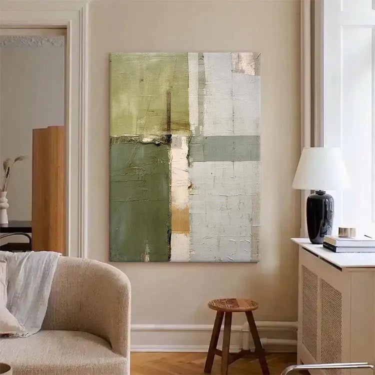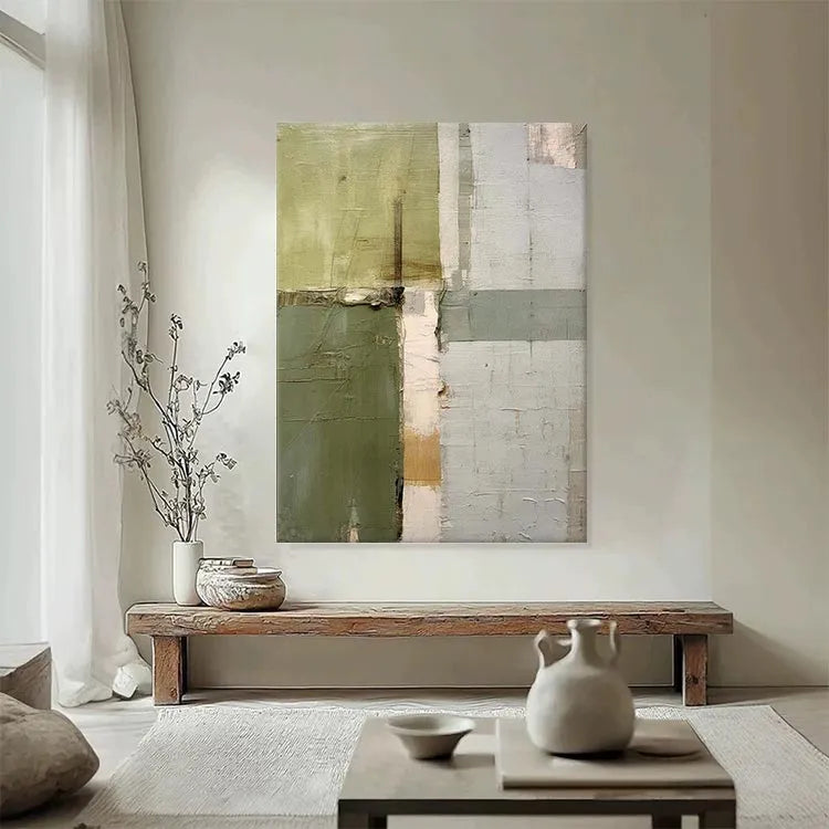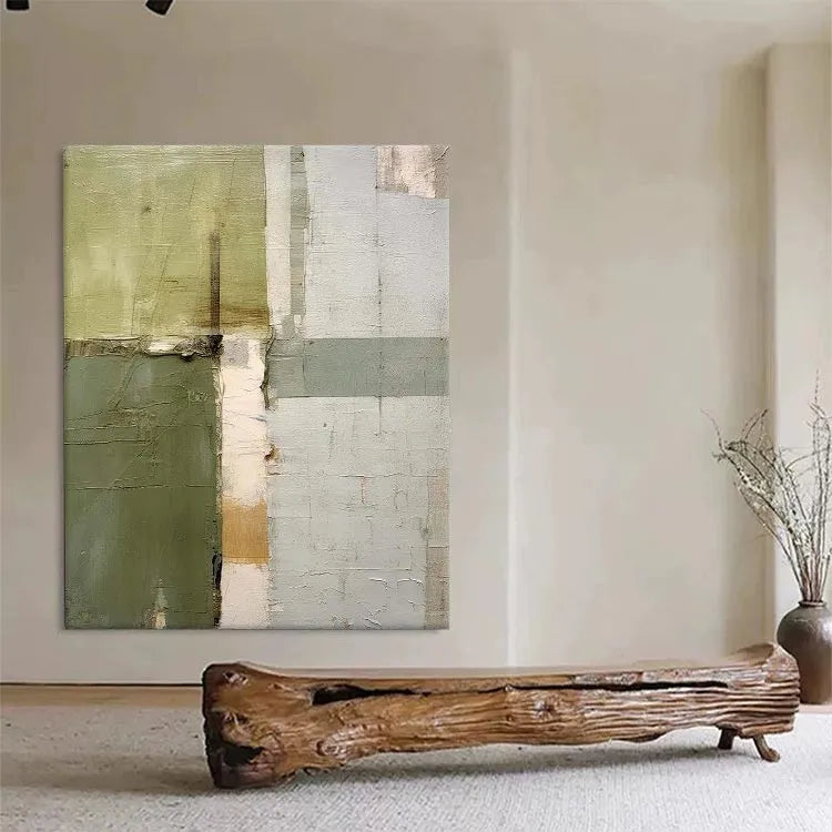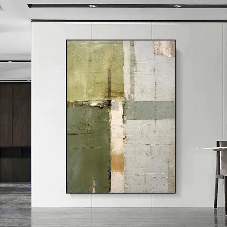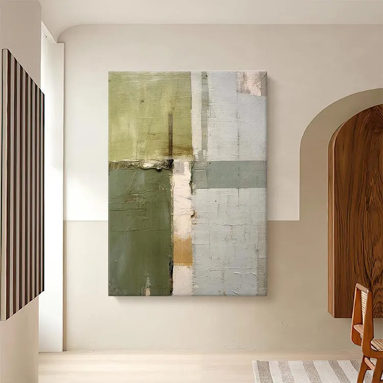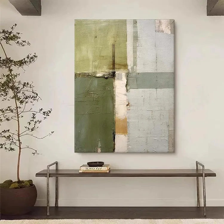 This abstract painting exhibits a minimalist yet textured composition, characterized by its restrained color palette of muted greens, pale grays, and beige. The vertical and horizontal brushstrokes create a fragmented, almost collage-like effect, with visible layering that suggests a history of application. The textured surfaces, with their rough, almost tactile quality, evoke a sense of depth and physicality. The subtle interplay of light and shadow, combined with the uneven color transitions, suggests influence from both Abstract Expressionism and the Color Field movement. The painting's simplicity and the deliberate choice of earthy tones may symbolize the quiet, understated aspects of everyday life.