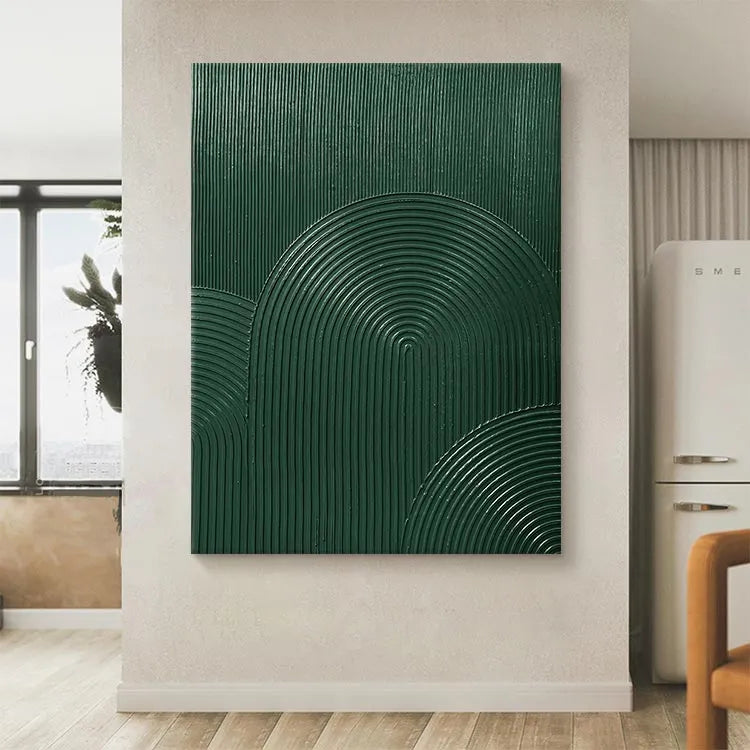 This artwork features a minimalist, abstract composition characterized by its repetitive, curved patterns and rich, green hues. The use of color is restrained yet evocative, creating a sense of calm and introspection. The textured, ridged surfaces suggest a three-dimensional quality, enhancing the visual depth. The curved forms, reminiscent of waves or arches, imply movement and continuity, while the uniformity of the lines and color evoke a sense of order and balance. This piece aligns with the principles of modern abstract art, focusing on form and texture over representation. The subtle play of light and shadow adds a tactile dimension, inviting the viewer to explore the intricate, rhythmic patterns.