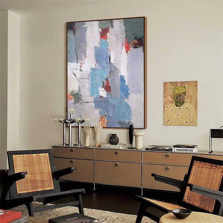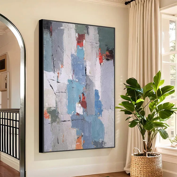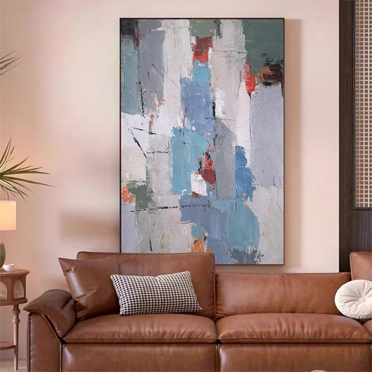 This oil painting exhibits a textured, abstract style characterized by its rough, layered brushstrokes and a fragmented composition. The use of color is restrained yet impactful, with muted blues, grays, and whites juxtaposed against vibrant reds and oranges. The texture is palpable, with visible brushstrokes and a distressed, almost worn look that suggests a sense of decay or history. The interplay of light and dark areas creates depth and movement within the piece. This work may be associated with the Abstract Expressionist movement, focusing on the emotional and physical qualities of paint. The overall effect is one of subtle complexity, inviting the viewer to explore its layered, textured surfaces.