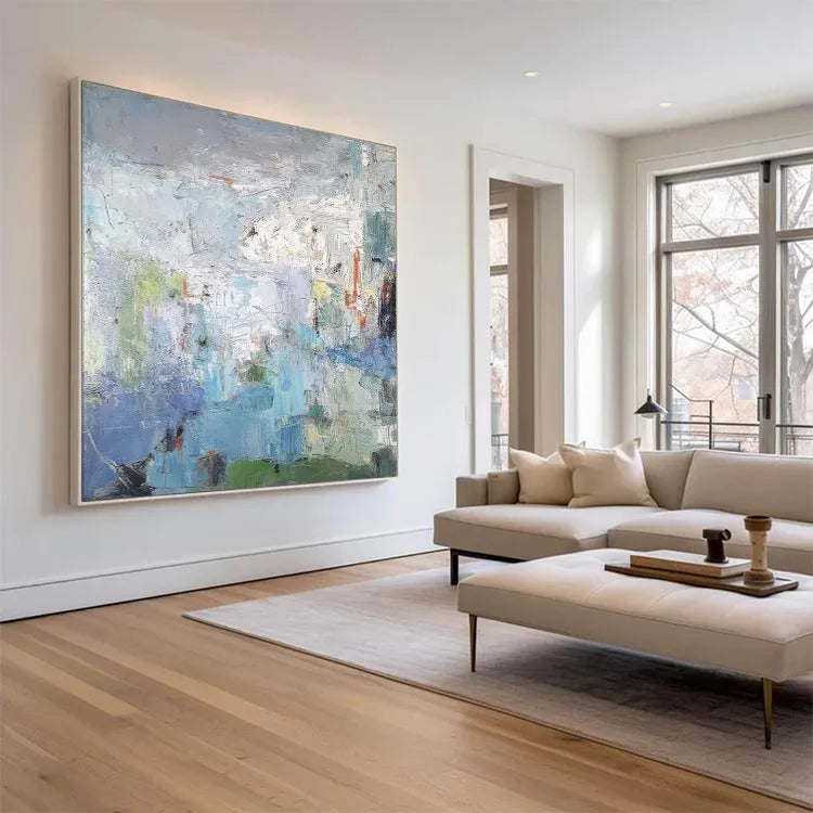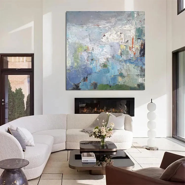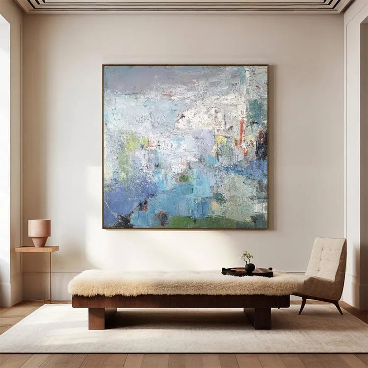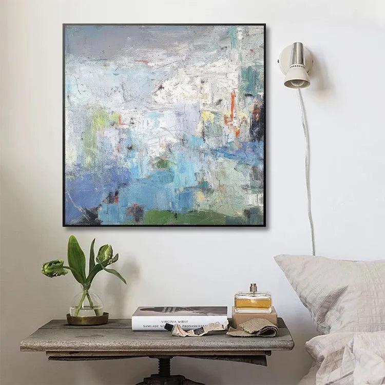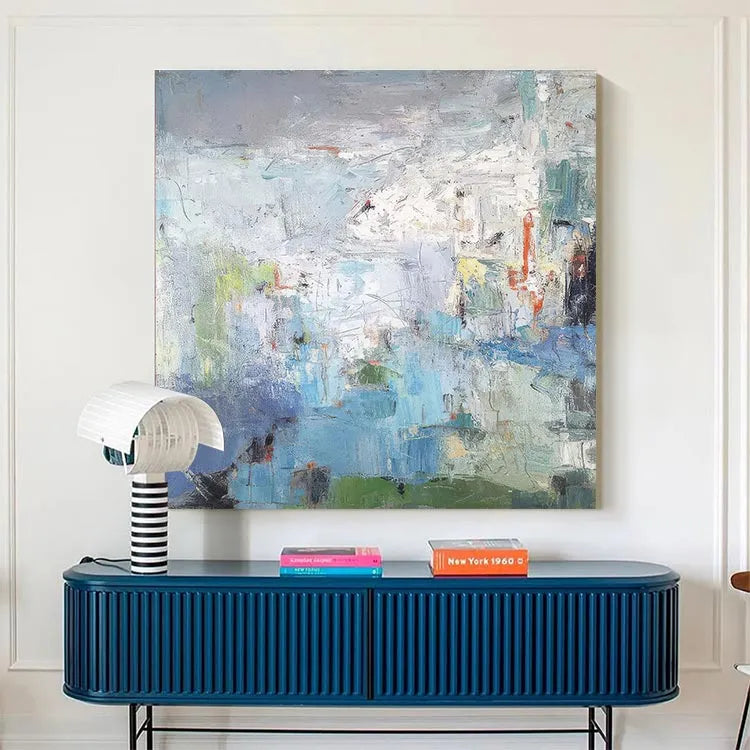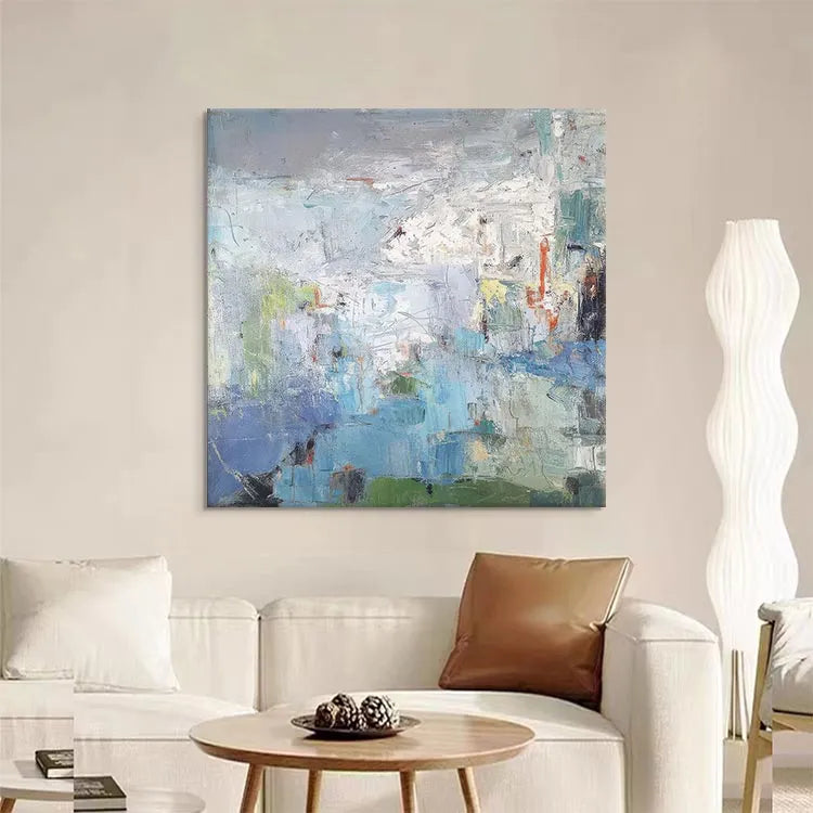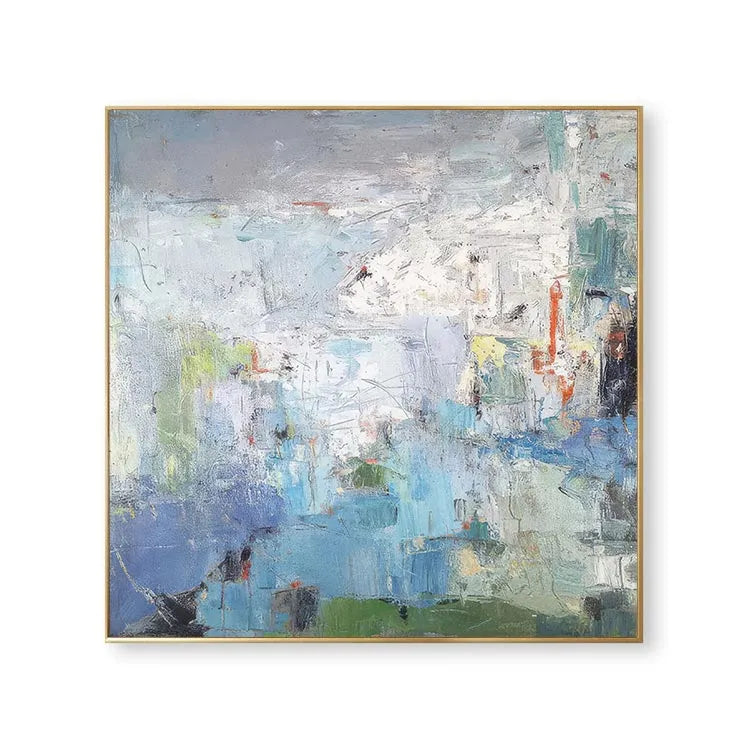 This abstract painting employs a textured, layered composition, with broad, sweeping brushstrokes that create a sense of depth and movement. The color palette is predominantly cool, featuring blues, greens, and whites, contrasted by subtle touches of red and yellow. The textured application of paint suggests a physical, almost tactile quality, inviting the viewer to engage with the surface. The use of light and shadow is subtle, with the white and gray areas creating a luminous, almost ethereal effect. The painting's style is reminiscent of Abstract Expressionism, with its emphasis on process and emotional response over representational accuracy. The loose, yet deliberate application of color and texture suggests a narrative of natural landscapes or inner experiences, blending the organic with the abstract.