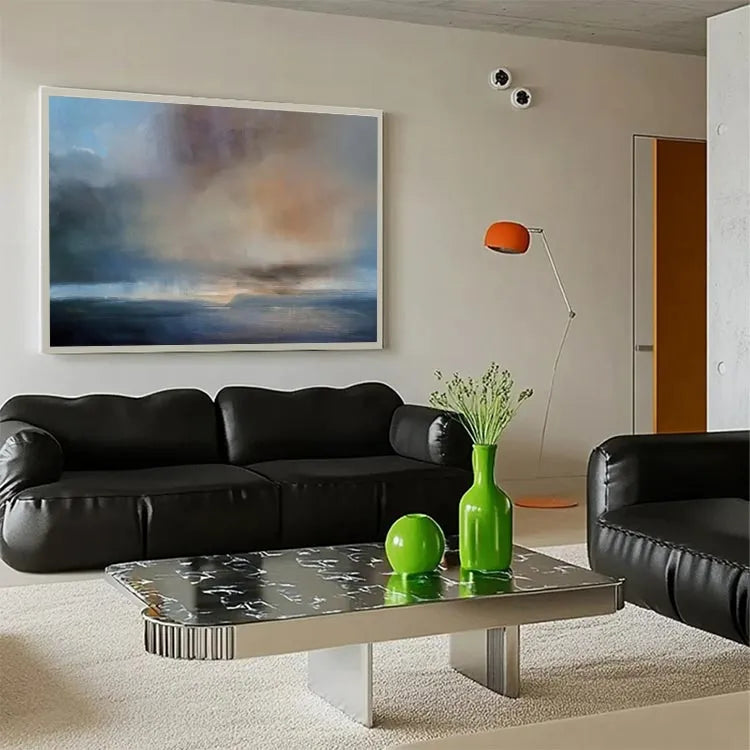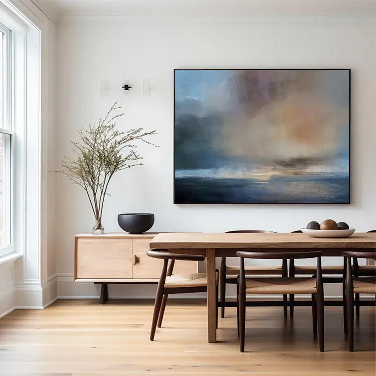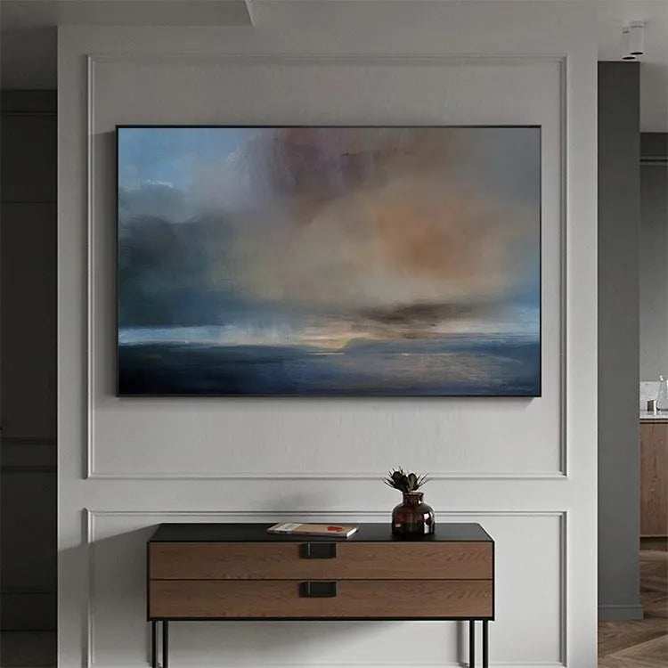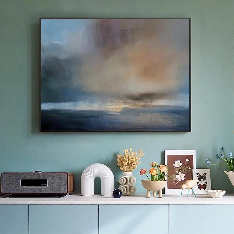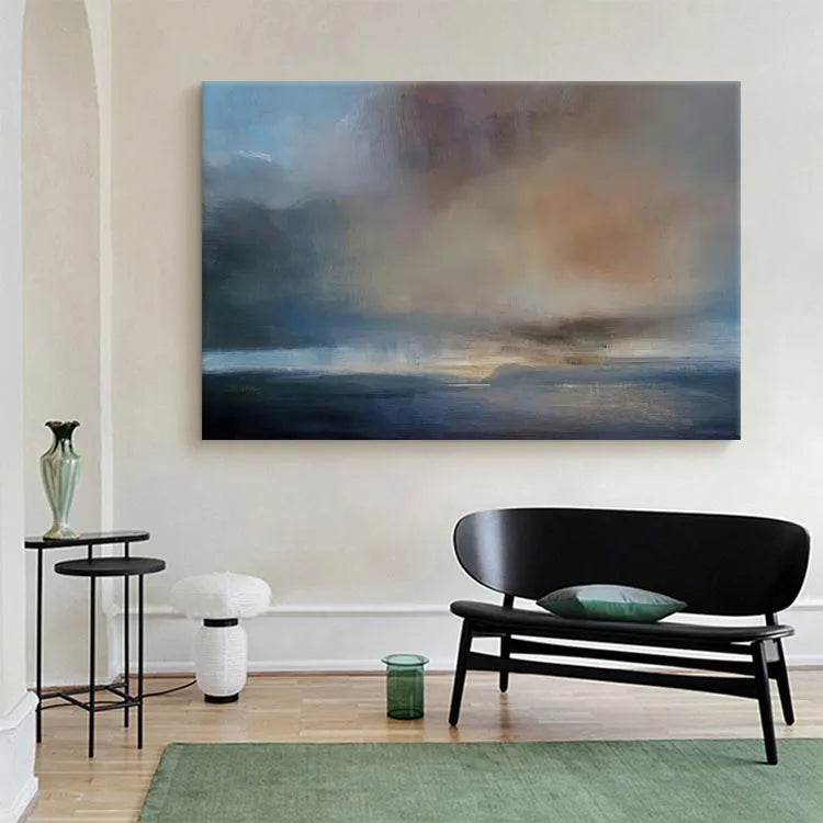 This oil painting exhibits a serene, atmospheric composition with a soft, misty quality. The use of color is subtle, with gentle gradients of blue, brown, and orange blending seamlessly, suggesting a dawn or dusk scene. The brushstrokes are loose and diffuse, creating a sense of depth and movement in the sky and water. The texture is smooth yet slightly rough, enhancing the ethereal effect. The light is diffused, with no distinct source, adding to the tranquil mood. This work aligns with the principles of the Impressionist movement, focusing on light and atmosphere rather than detailed realism. The overall effect is calming and introspective, inviting the viewer to reflect on the beauty of nature's subtle moments.