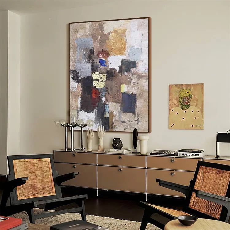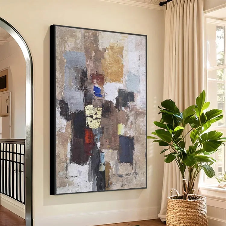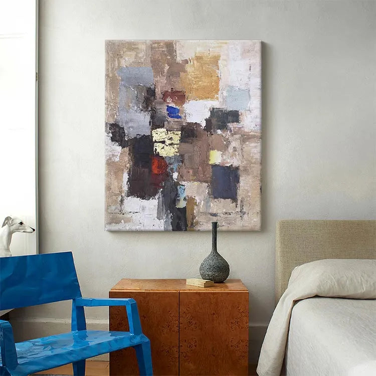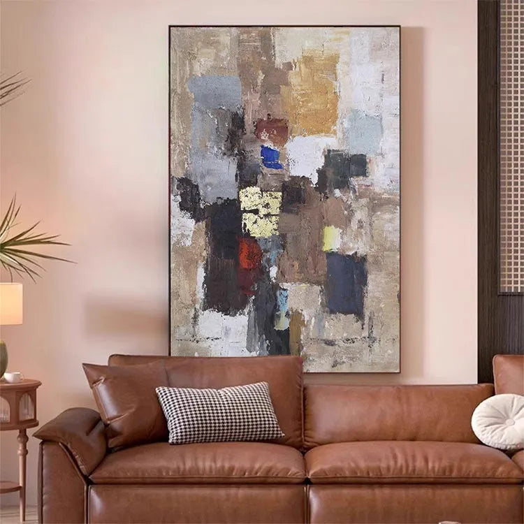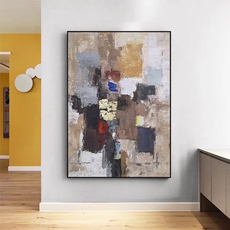 This oil painting showcases a textured, abstract composition characterized by a patchwork of colors and forms. The use of thick, expressive brushstrokes creates a rugged, almost tactile surface. The color palette, comprising earthy browns, muted blues, and vibrant yellows, evokes a sense of depth and complexity. The interplay of light and shadow suggests a three-dimensional quality, while the varied textures, from smooth to rough, enhance the visual interest. This work aligns with the Abstract Expressionism movement, with its emphasis on spontaneous creation and emotional expression. The chaotic arrangement of colors and forms symbolizes the complexity of human experience, inviting the viewer to interpret and reflect.