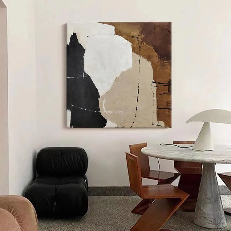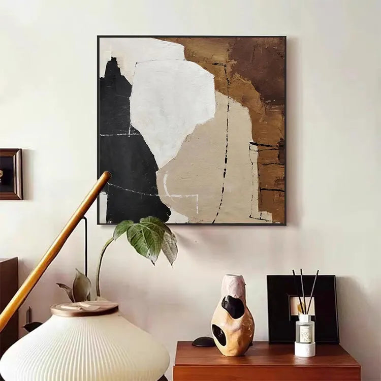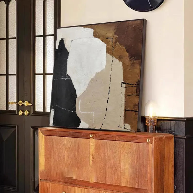 This painting exhibits a minimalist and abstract style, characterized by its bold, geometric color blocks and textured brushstrokes. The composition features a striking contrast between black, white, beige, and brown areas, which are separated by thin, vertical lines. The texture of the paint is visible, with thick, rough brushstrokes adding a tactile quality to the surface. The use of color suggests a balance between simplicity and complexity, reminiscent of the Abstract Expressionism movement. The black and white sections create a sense of depth and form, while the beige and brown areas introduce warmth and subtlety. The vertical lines add a linear structure, guiding the viewer's eye through the composition. The overall effect is a harmonious yet dynamic exploration of color and texture.