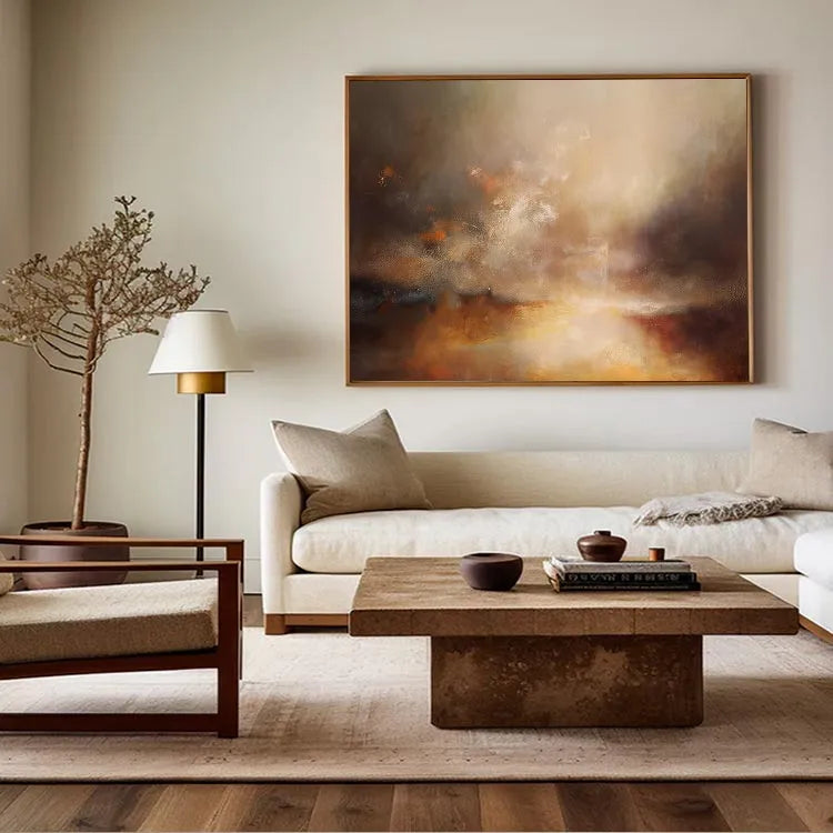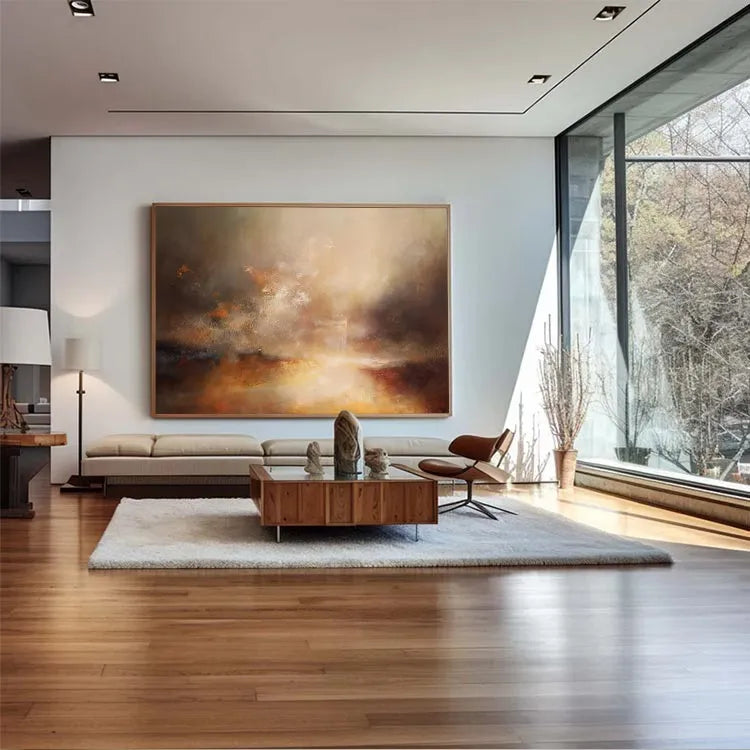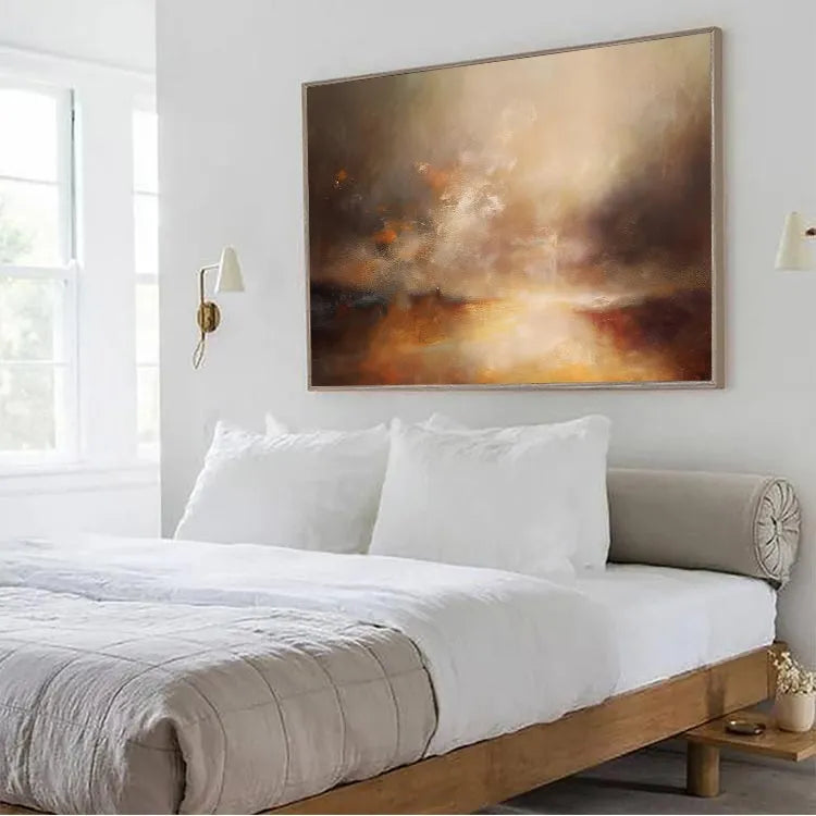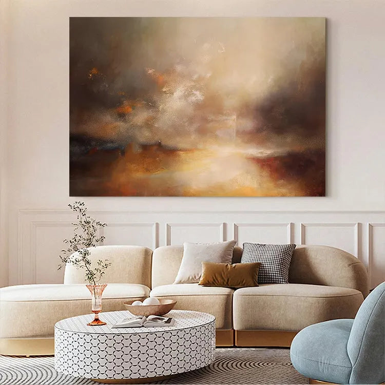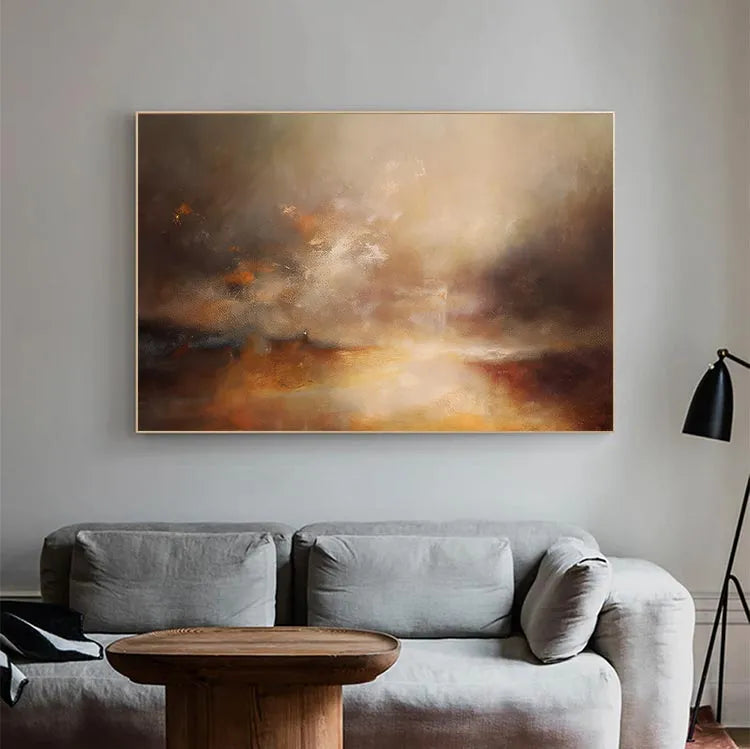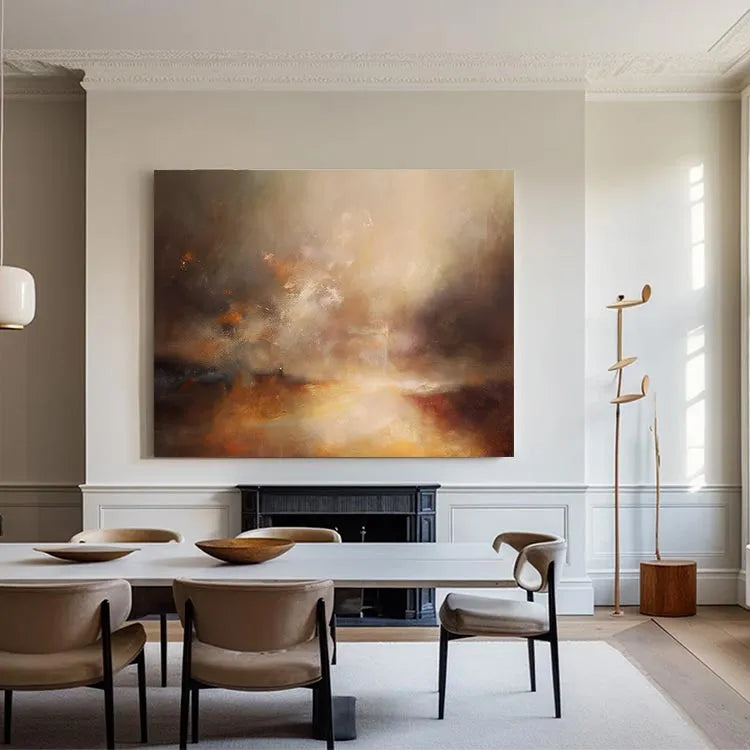 This oil painting exhibits a dynamic interplay of light and color, reminiscent of the Impressionist movement. The composition features a radiant, golden light source at the center, which gradually diffuses into a misty, atmospheric background. The use of warm, earthy tones—ochres, browns, and golds—contrasts with cooler, darker hues, creating a sense of depth and movement. The texture is rich and layered, with visible brushstrokes that add a tactile quality to the misty, ethereal clouds. The light appears to emanate from below, suggesting a sunrise or sunset, symbolizing hope and transformation. The overall style is expressive and emotive, inviting the viewer to interpret the subtle, yet powerful, interplay between light and color.
