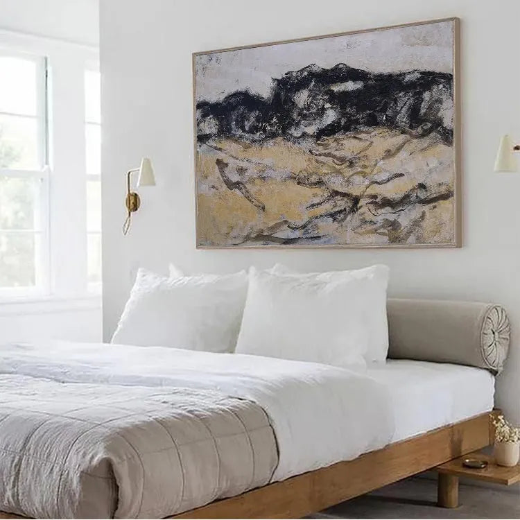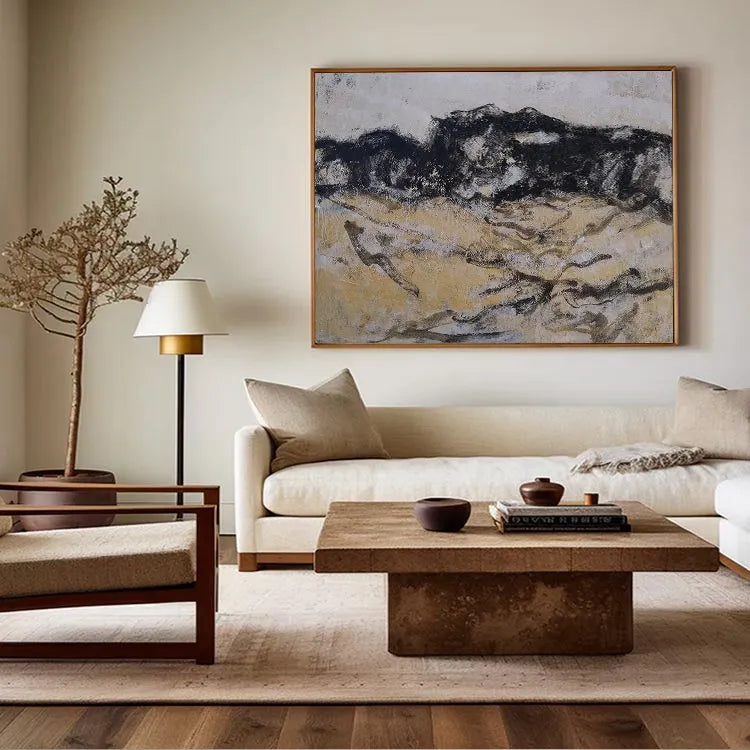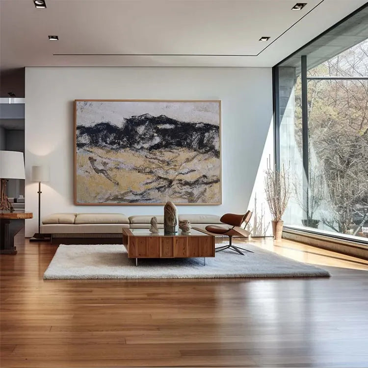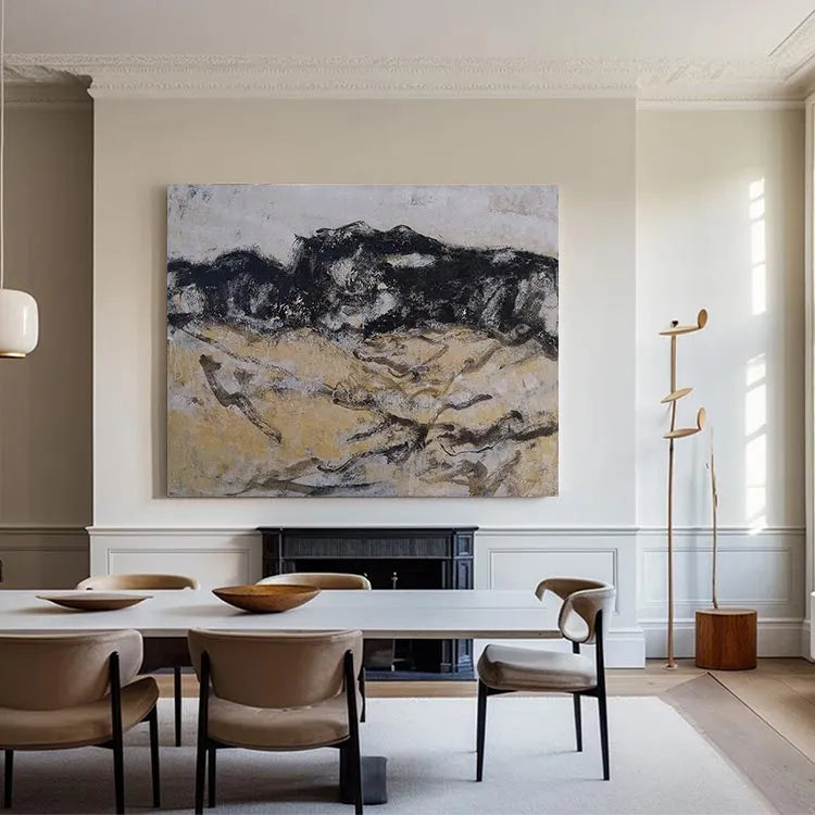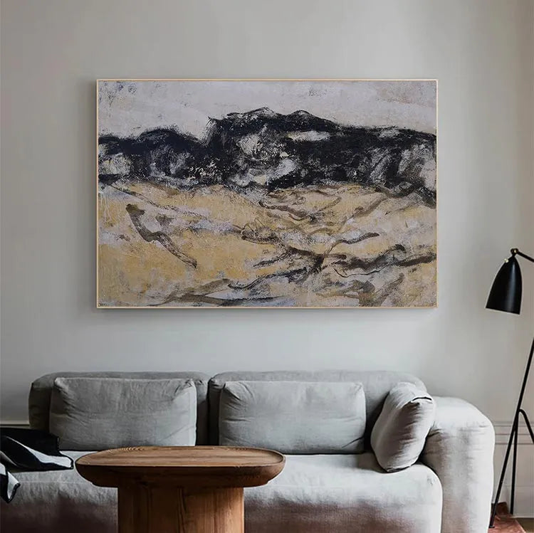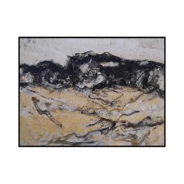 This oil painting features a rugged, abstract landscape with a dominant use of dark, almost black, and light beige colors. The rough, textured brushstrokes create a sense of movement and depth, with the darker hues forming a mysterious, mountainous silhouette against a lighter, more fluid background. The composition is asymmetrical, with the darker elements concentrated at the top and the lighter, swirling patterns below. This piece appears to belong to the Abstract Expressionism movement, characterized by its spontaneous, emotive quality and emphasis on texture over realism. The interplay of color and texture suggests a natural, yet chaotic landscape, evoking a sense of both beauty and turmoil.