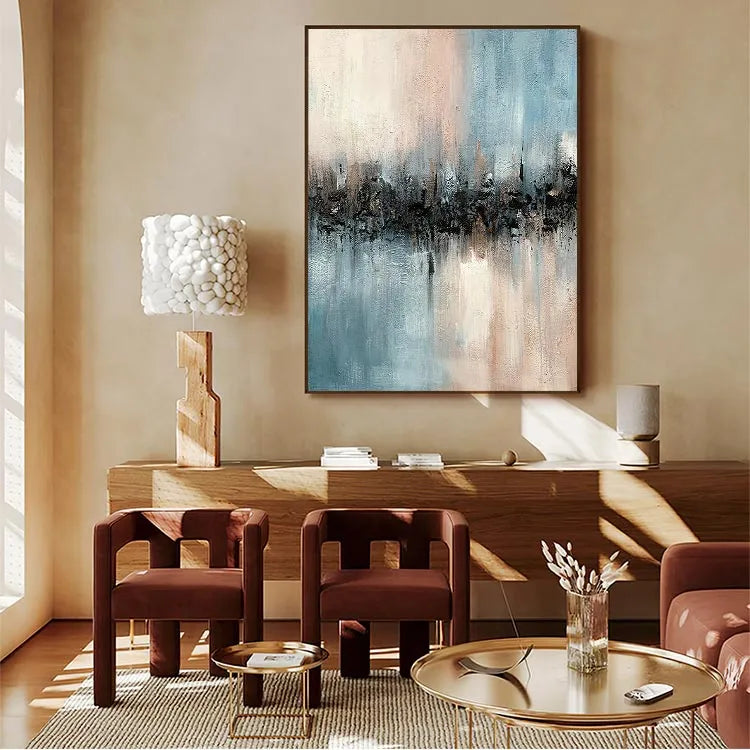 This oil painting exhibits a contemporary abstract style, characterized by its textured, layered composition and the interplay of cool and warm colors. The use of blue, beige, and black creates a sense of depth and contrast, with the blue and beige areas suggesting a sky and a distant horizon, while the black adds a mysterious, almost somber tone. The textured brushstrokes and visible paint layers contribute to a tactile, almost three-dimensional effect. The vertical and horizontal brushstrokes create a dynamic yet balanced composition, reminiscent of the Abstract Expressionism movement. The subtle blending of colors and the rough texture suggest a meditative, introspective mood.