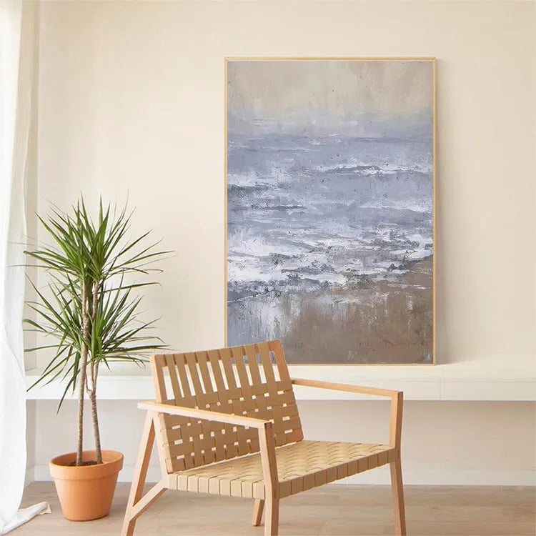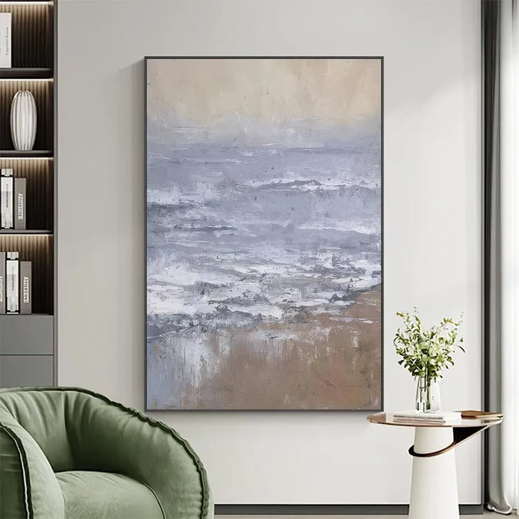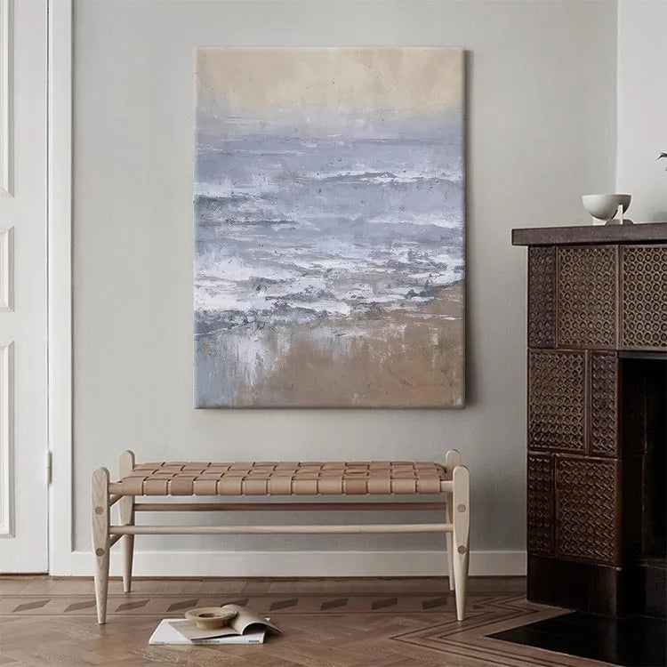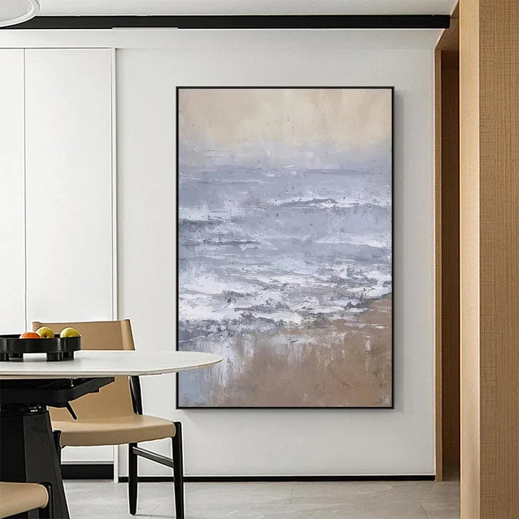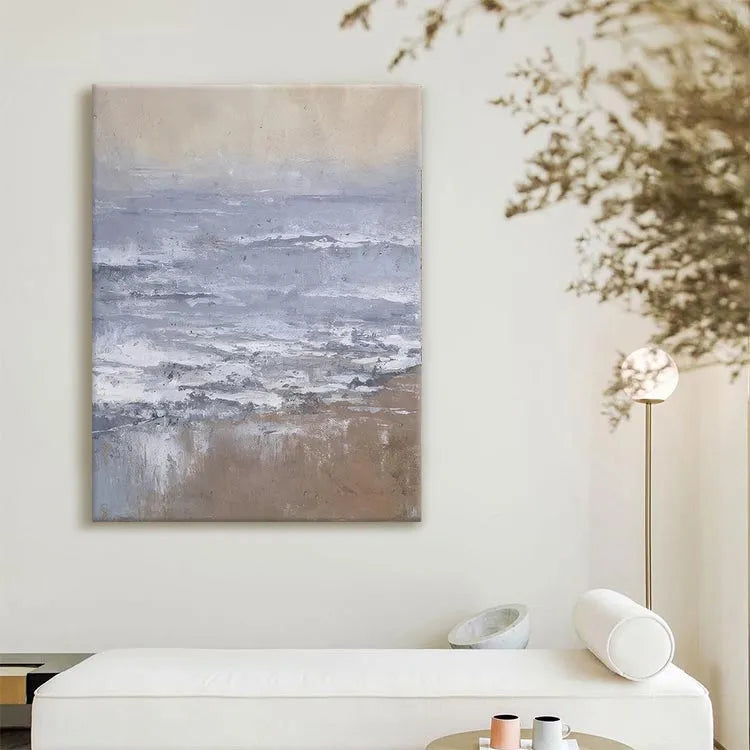 This oil painting presents a serene, minimalist seascape with a focus on the interplay between land and sea. The composition is horizontal, emphasizing the vastness of the ocean. The artist employs a restrained color palette dominated by muted blues, grays, and browns, creating a tranquil yet contemplative mood. The texture is evident in the visible brushstrokes, which add a sense of movement to the waves and a roughness to the sandy shore. The light is diffuse, suggesting an overcast sky, and the subtle gradations of color evoke a sense of timelessness. The style is reminiscent of the Impressionist movement, with its emphasis on light and atmosphere, yet it also shares elements of modern minimalism. The painting's simplicity and the careful, almost delicate application of color and texture invite the viewer to reflect on the quiet beauty of nature.