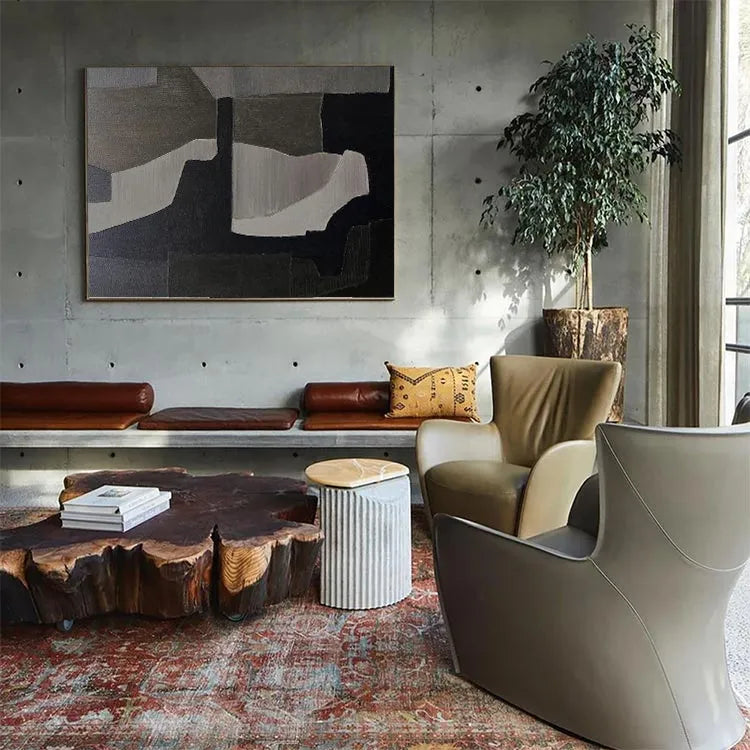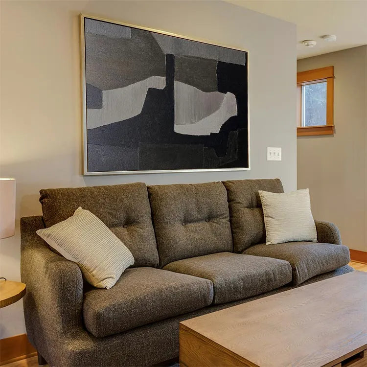 This oil painting exhibits a geometric abstraction style, characterized by its use of rectangular and irregular shapes. The composition features a harmonious balance of dark and light tones, with a dominant palette of blacks, grays, and soft beiges. The artist employs a textured brushstroke technique that adds a tactile quality to the canvas, enhancing the sense of depth and dimension. The interplay of light and shadow suggests a subtle, almost architectural form, reminiscent of Cubism. The restrained color choices and the interlocking shapes evoke a sense of introspection and quiet contemplation. The overall effect is both modern and timeless, aligning with the principles of abstract art movements.