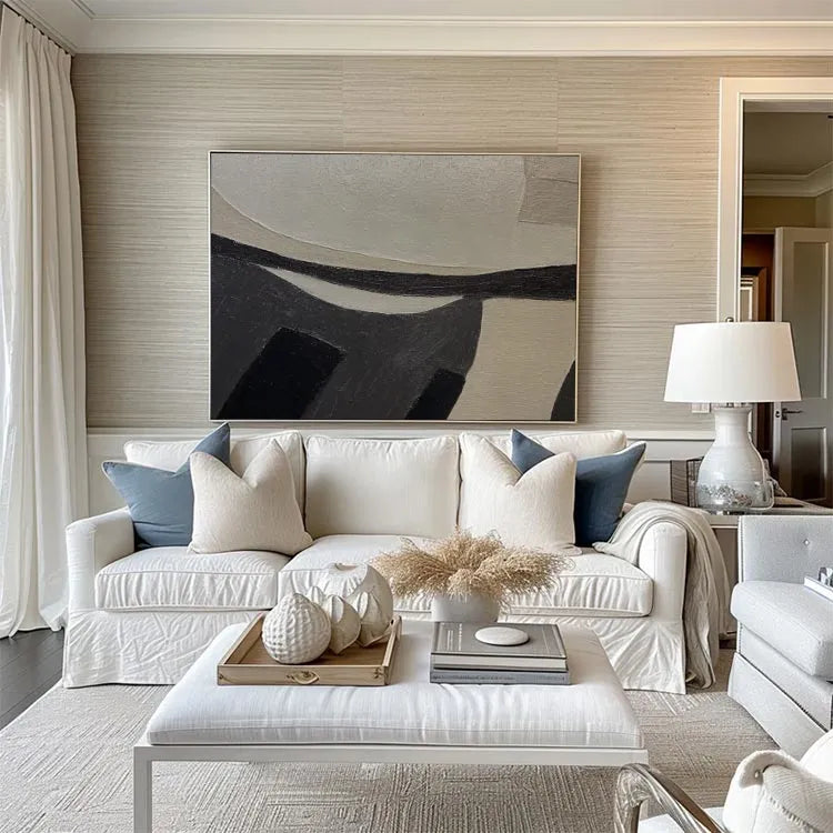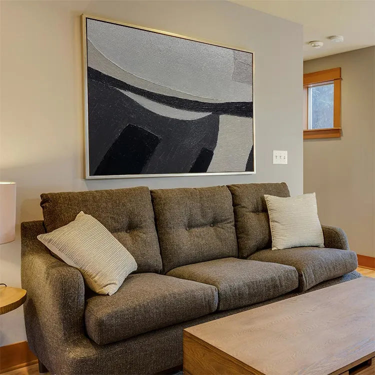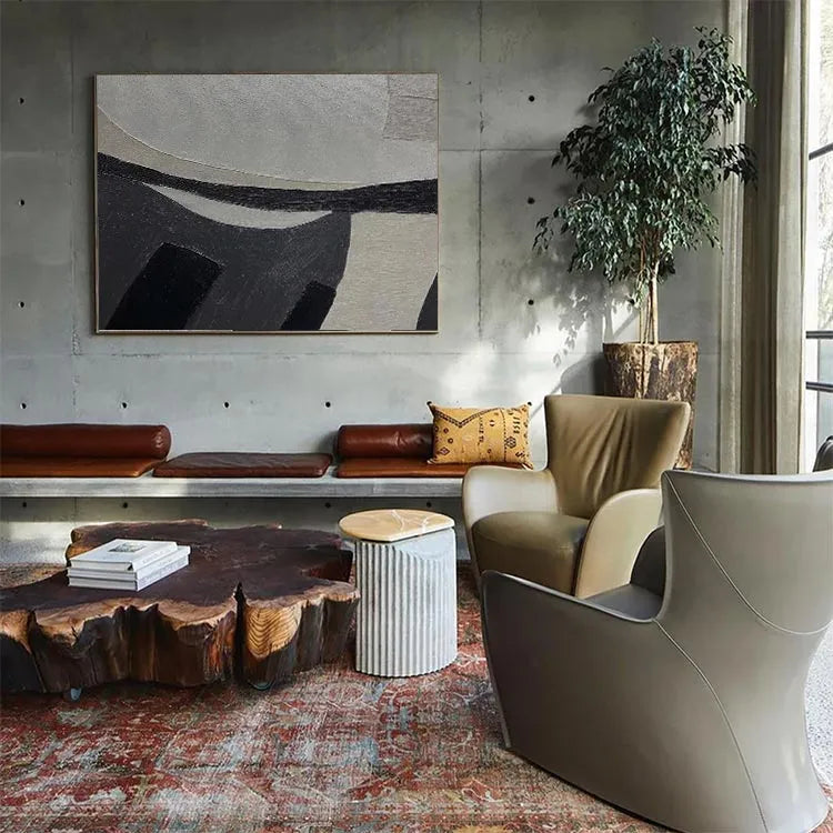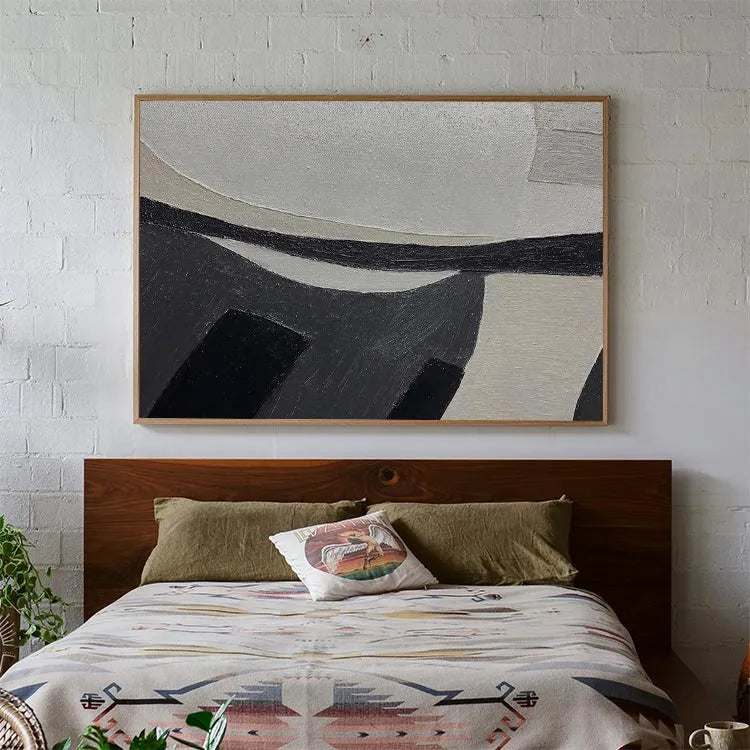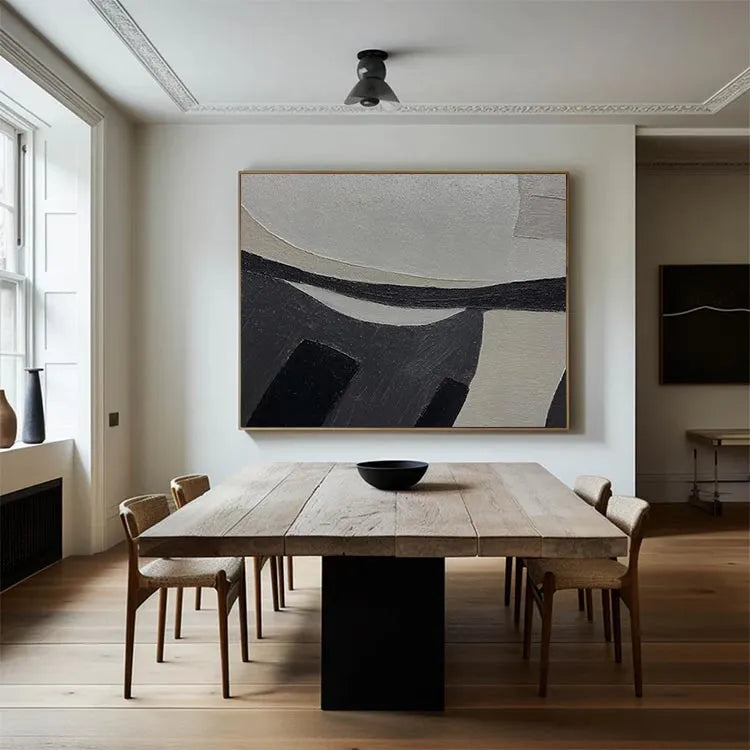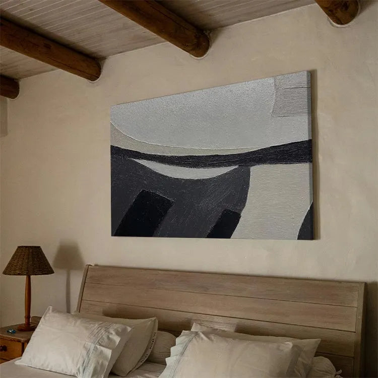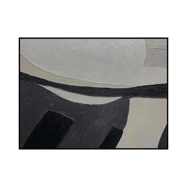 This oil painting exhibits characteristics of geometric abstraction, reminiscent of the Cubist movement. The composition is characterized by a series of intersecting planes and shapes, using a limited palette of blacks, grays, and whites. The brushstrokes are deliberate and textured, adding a tactile quality to the surface. The use of color is restrained, creating a sense of depth and contrast. The black horizontal line and the curved gray form in the upper section suggest a dynamic interplay between structure and fluidity. The subtle gradations and rough textures enhance the painting's three-dimensionality, while the simplicity of the forms and color scheme evoke a sense of modernist minimalism.