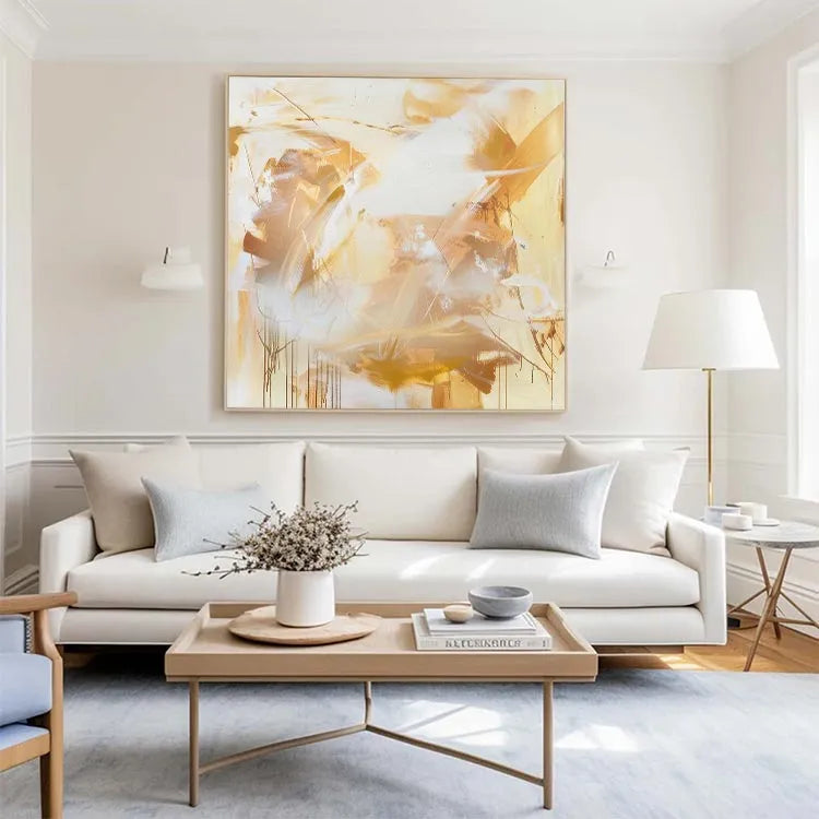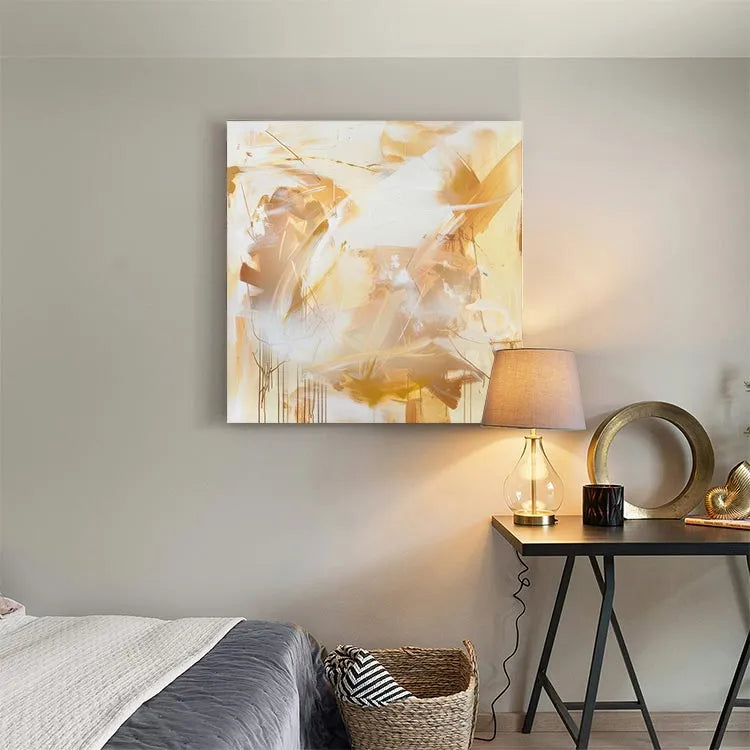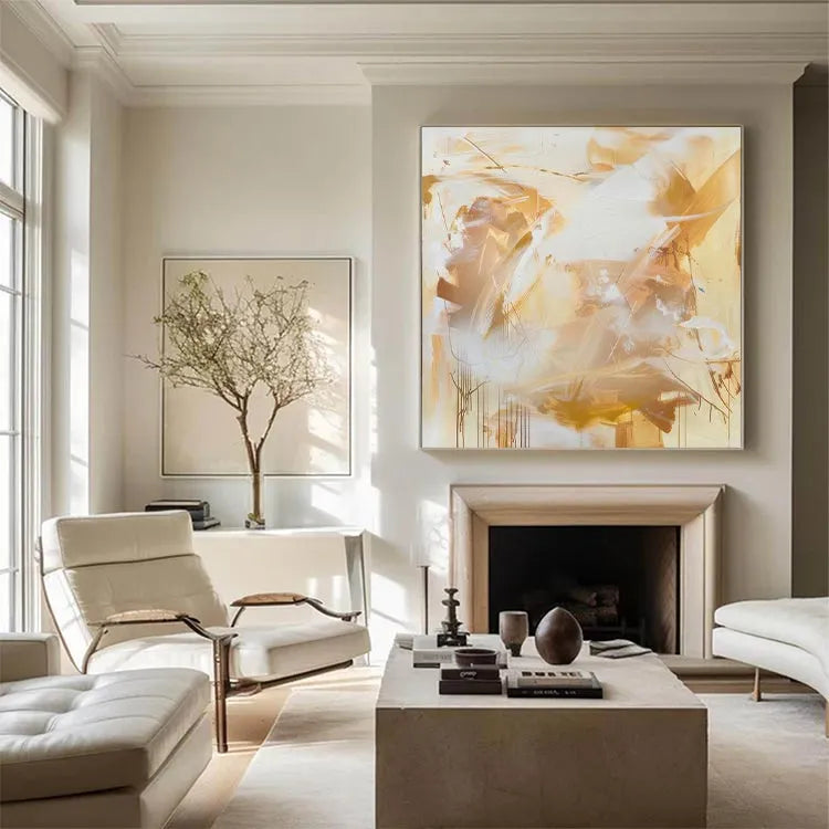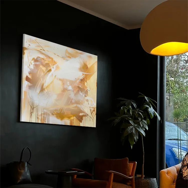 This abstract painting showcases a dynamic interplay of warm and cool colors, primarily utilizing shades of yellow, orange, and white. The brushstrokes are bold and sweeping, creating a sense of movement and depth. The texture is evident through the visible, thick layers of paint and the intermingling of opaque and transparent sections. The composition is balanced yet chaotic, with geometric and organic forms intersecting. The use of light and shadow adds a three-dimensional quality, while the random drips and lines suggest spontaneity and emotion. This work aligns with the Abstract Expressionism movement, characterized by its emphasis on emotional expression and the subconscious. The subtle gradations of color and the interplay of light and dark suggest a contemplative, almost ethereal atmosphere.