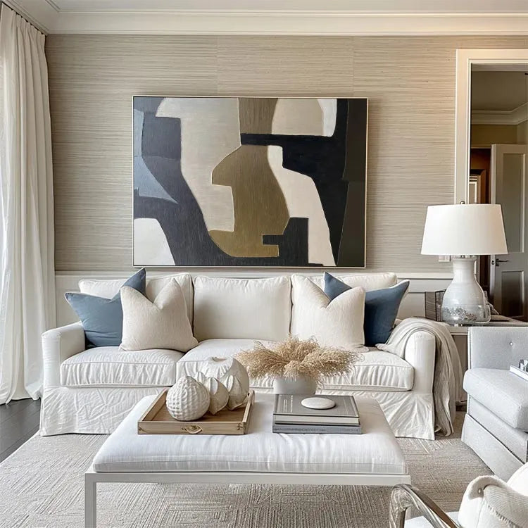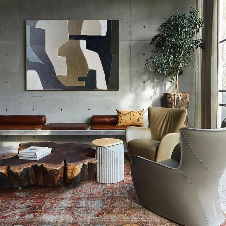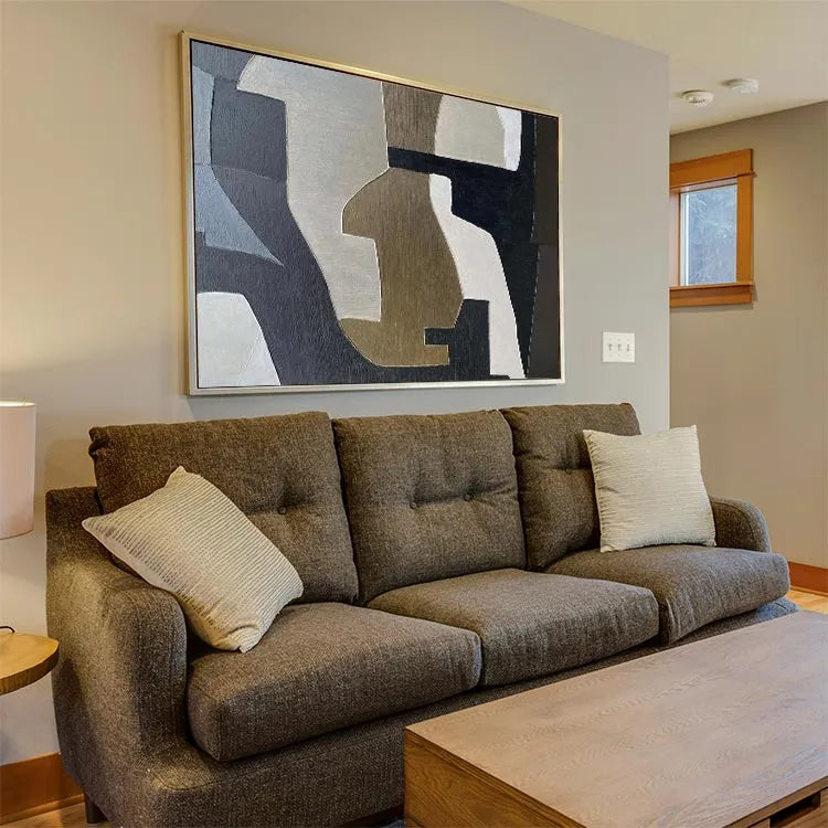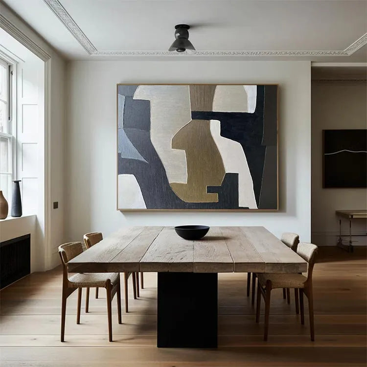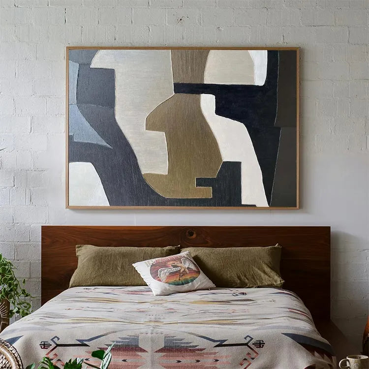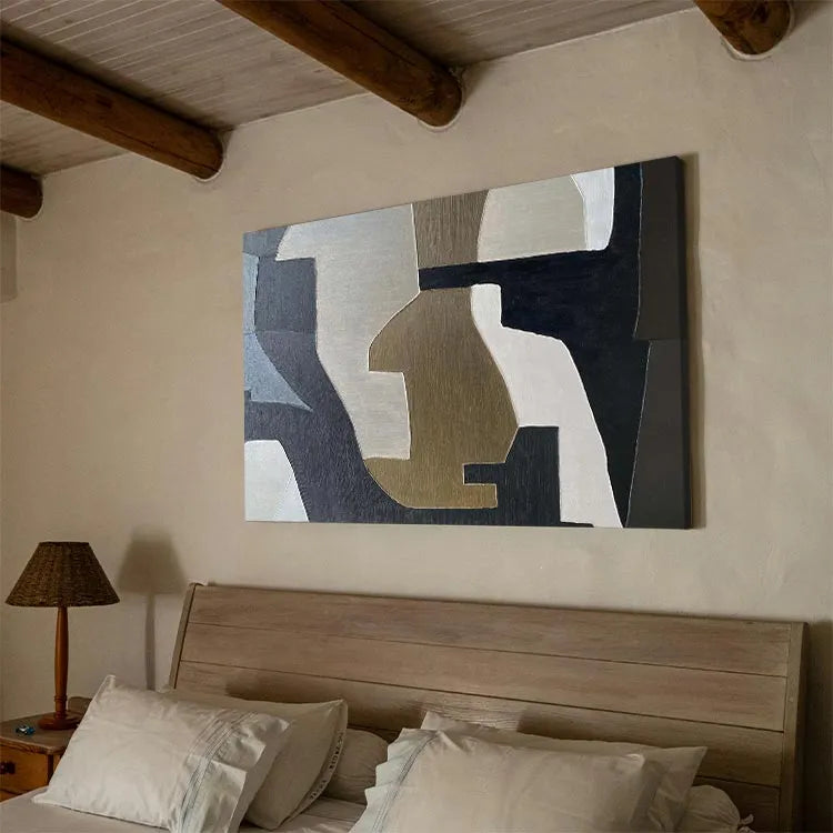 This oil painting exhibits a modern abstract style, characterized by its geometric shapes and minimalist composition. The use of a limited color palette, including muted grays, blacks, and beige, creates a subdued yet compelling visual effect. The texture of the brushstrokes is evident, adding a tactile quality to the flat areas of color. The interplay of light and dark areas suggests depth and dimension, while the irregular, puzzle-like shapes evoke a sense of fragmentation and abstraction. The central, elongated beige shape draws the eye, creating a focal point amidst the surrounding darker and lighter hues. This work aligns with the principles of the Bauhaus movement, emphasizing form and function through simple, yet profound, visual language.