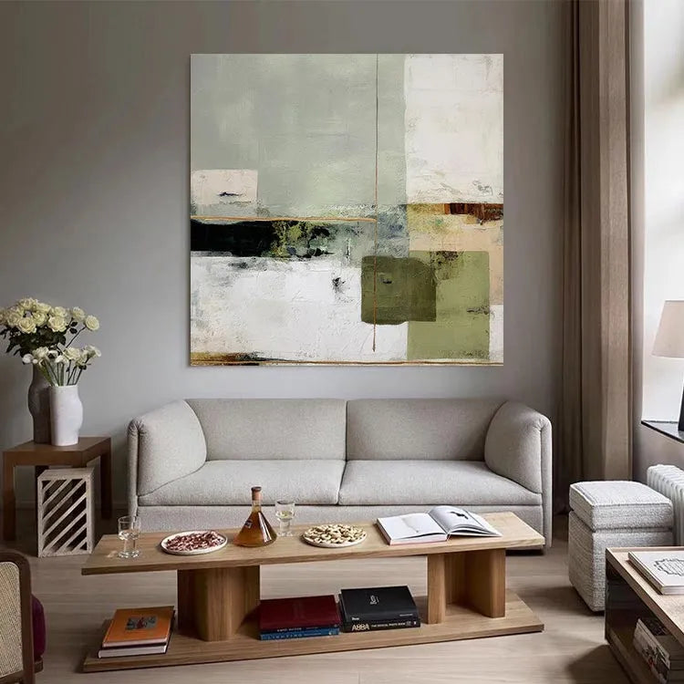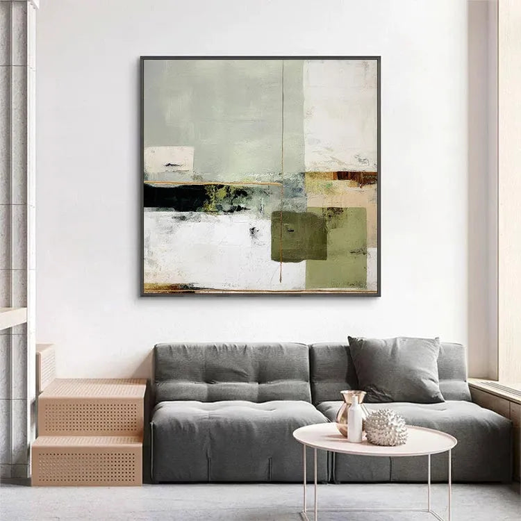 This abstract painting employs a minimalist composition, characterized by its restrained color palette and geometric forms. The artist uses a muted range of greens, whites, and grays, creating a serene yet introspective atmosphere. The texture is palpable, with visible brushstrokes and a slightly roughened surface that adds depth and tactile quality. The use of color is subtle, with the green and gray rectangles providing focal points against the lighter, almost washed-out background. A thin, vertical line divides the composition, adding a sense of structure and balance. The painting's style aligns with the Abstract Expressionism movement, with its emphasis on form and texture over representation. The interplay between light and shadow suggests a quiet, contemplative mood.