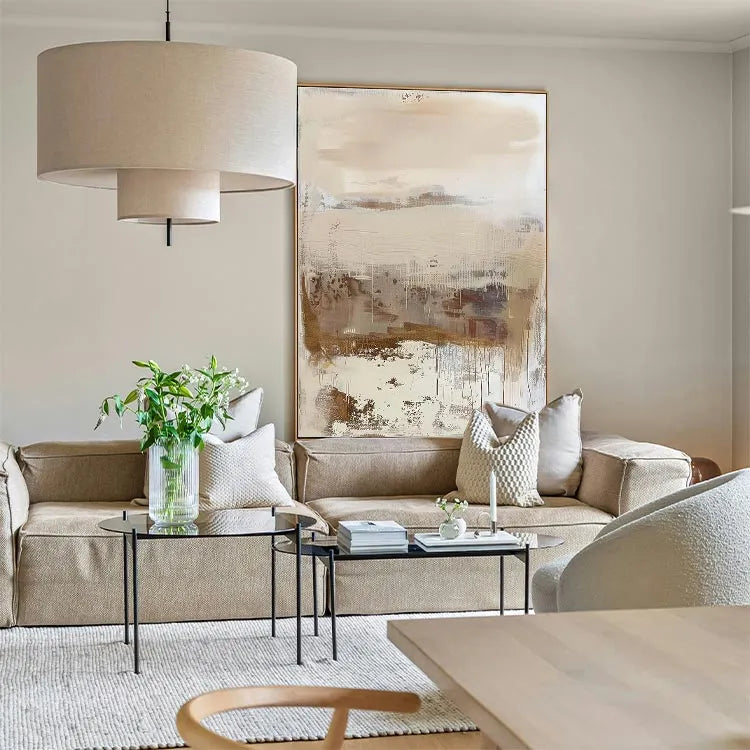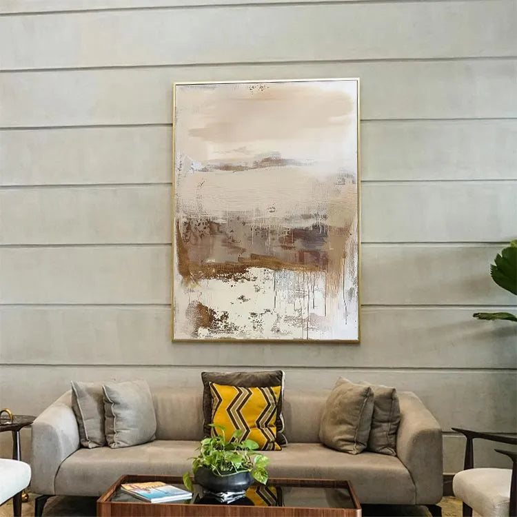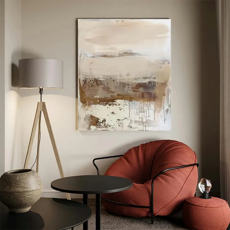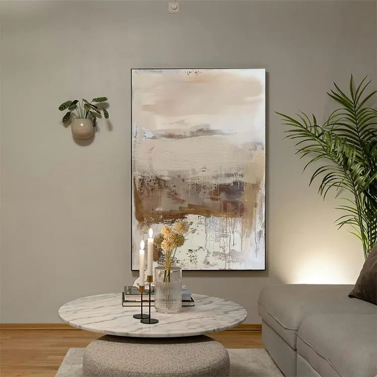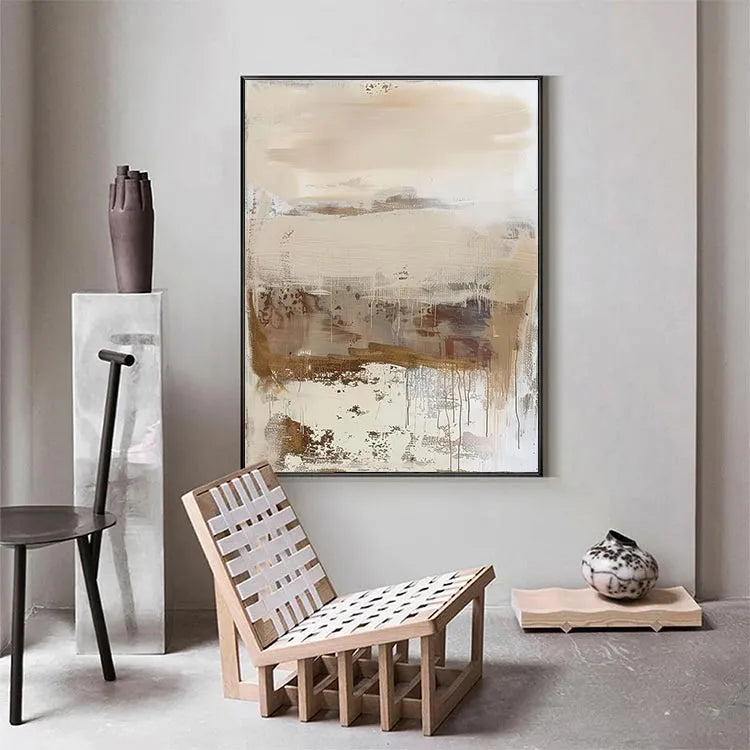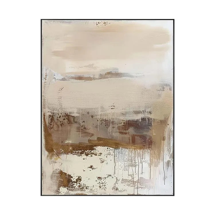 This abstract painting employs a minimalist, contemporary style, characterized by its restrained color palette and textured brushstrokes. The composition features a gradient transition from a warm, earthy brown at the bottom to a pale, almost white sky at the top, suggesting a horizon. The texture is achieved through layered, vertical drips and subtle, horizontal lines, creating a sense of depth and movement. The use of color is restrained yet effective, with the browns and whites evoking a calm, introspective mood. The painting's rough, textured quality suggests an influence from Abstract Expressionism, while its simplicity and subtle forms align with the principles of Minimalism. The overall effect is serene and contemplative, inviting viewers to reflect on the simplicity and beauty of the natural world.
