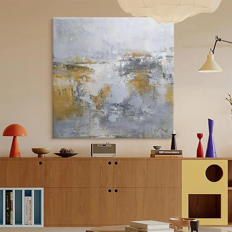This oil painting showcases a textured, abstract composition characterized by its rough, almost impasto brushwork. The color palette is subdued, with dominant hues of gray, white, and mustard yellow, which create a balanced yet dynamic interplay. The textured application of paint gives the surface a tangible, almost three-dimensional quality, reminiscent of the Abstract Expressionism movement. The use of color and texture suggests a contemplative, perhaps melancholic mood, with the gray and white areas evoking a sense of emptiness, while the mustard yellow adds a subtle warmth and contrast. The composition's horizontal and vertical brushstrokes guide the viewer's eye across the canvas, enhancing the overall sense of movement and depth.