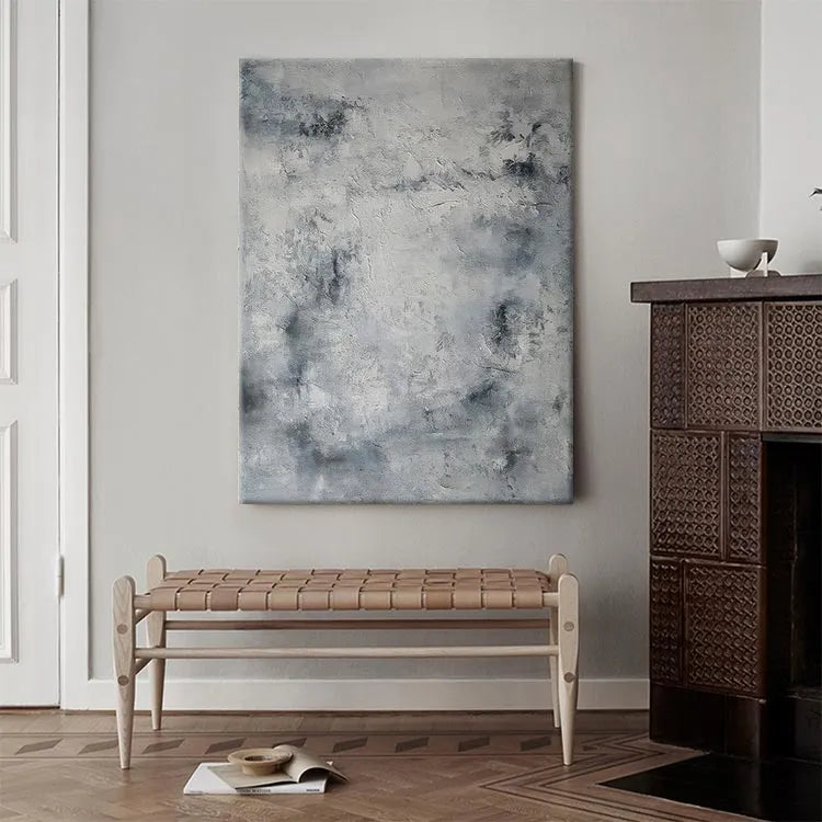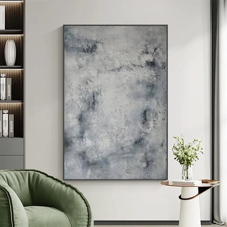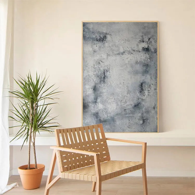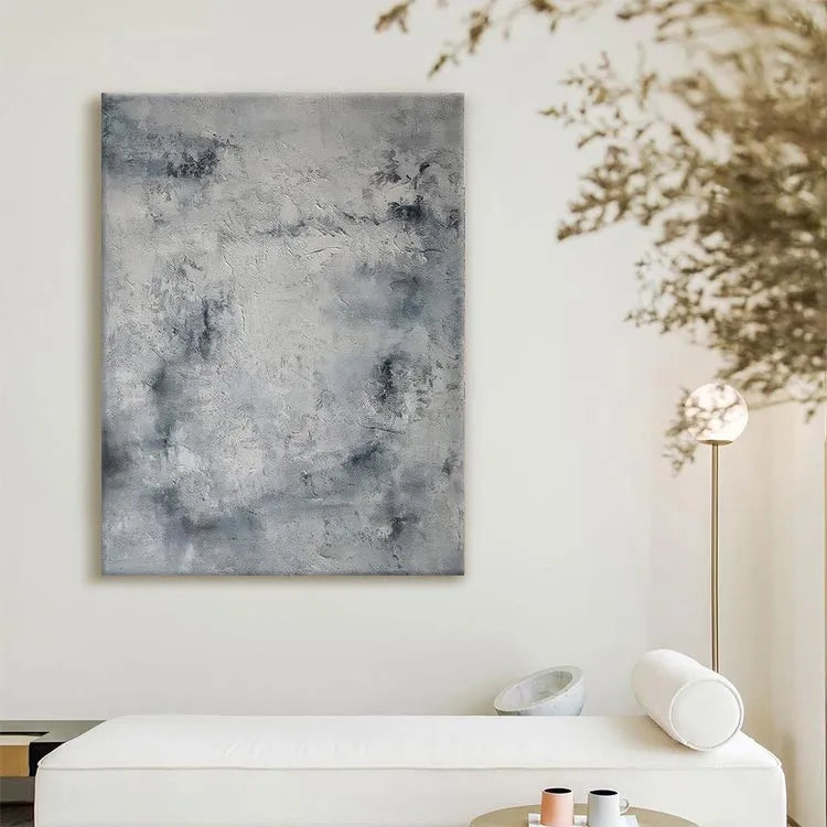 This oil painting exhibits a textured, abstract composition with a monochromatic palette dominated by shades of gray and blue. The rough, almost tactile texture suggests a stucco-like surface, inviting the viewer to touch. The subtle, diffuse light creates a sense of depth and movement, with darker, indistinct areas forming organic patterns that evoke clouds or foliage. The brushstrokes are varied, with some areas showing smooth blending while others are more pronounced and textured. This piece aligns with the Abstract Expressionist movement, emphasizing emotional response over representational accuracy. The restrained color palette and textured technique evoke a sense of quiet contemplation and introspection.